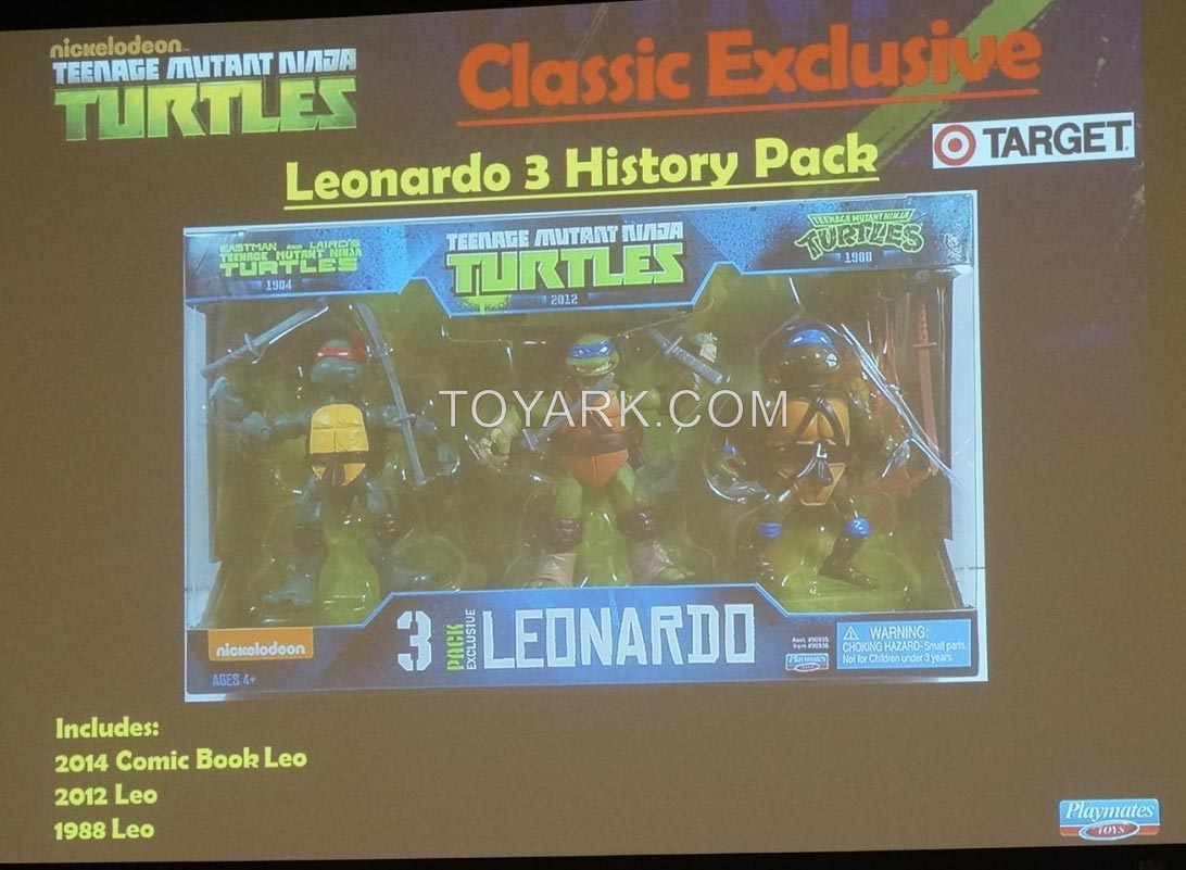 Mais ce n’est pas tout ! Au moins la figurine de Leonardo aura le droit à un pack exclusif (à retrouver uniquement chez Target) dit « History », regroupant le Leonardo du comics original de 1984, Leonardo du dessin-animé de 1987 et celui du dessin-animé de nickelodeon.