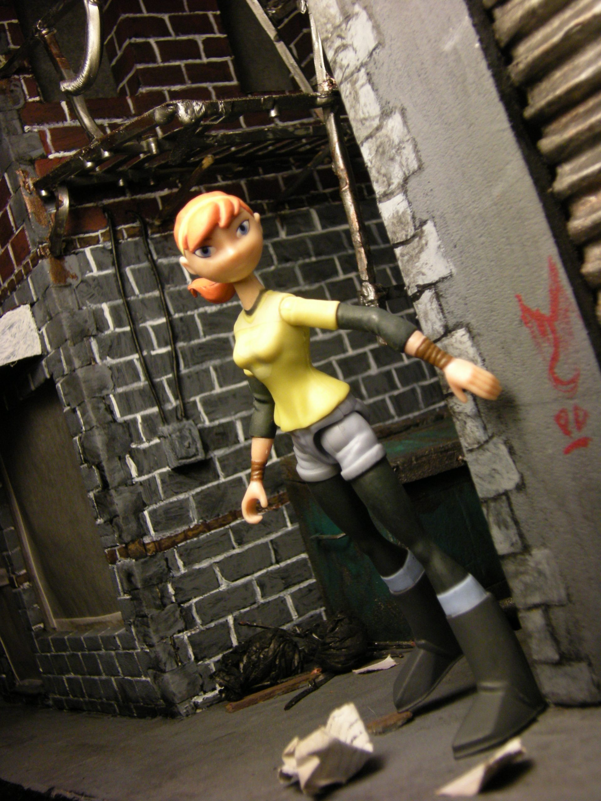 C’est peut-être là où la figurine d’April pèche le plus. Elle possède un très faible nombre d’articulations, et une rotule à 360° ou un demi-disque de 90° aurait été la bienvenue aux coudes ou aux genoux. Malheureusement, la finesse de ses membres et les coûts de création l’en empêchent. On retrouve donc le strict minimum d’articulations sur cette figurine, aux bras, jambes et cou. Une dernière articulation se trouve au niveau de la taille. Ses poignets par ailleurs sont rotatifs.