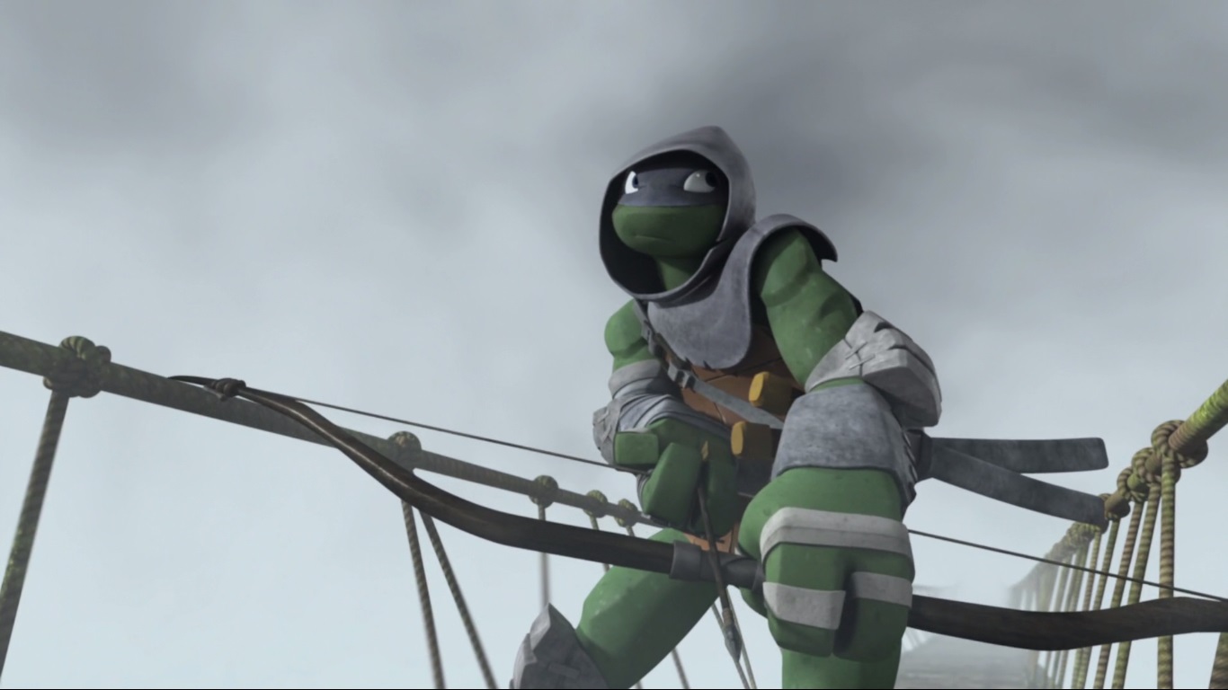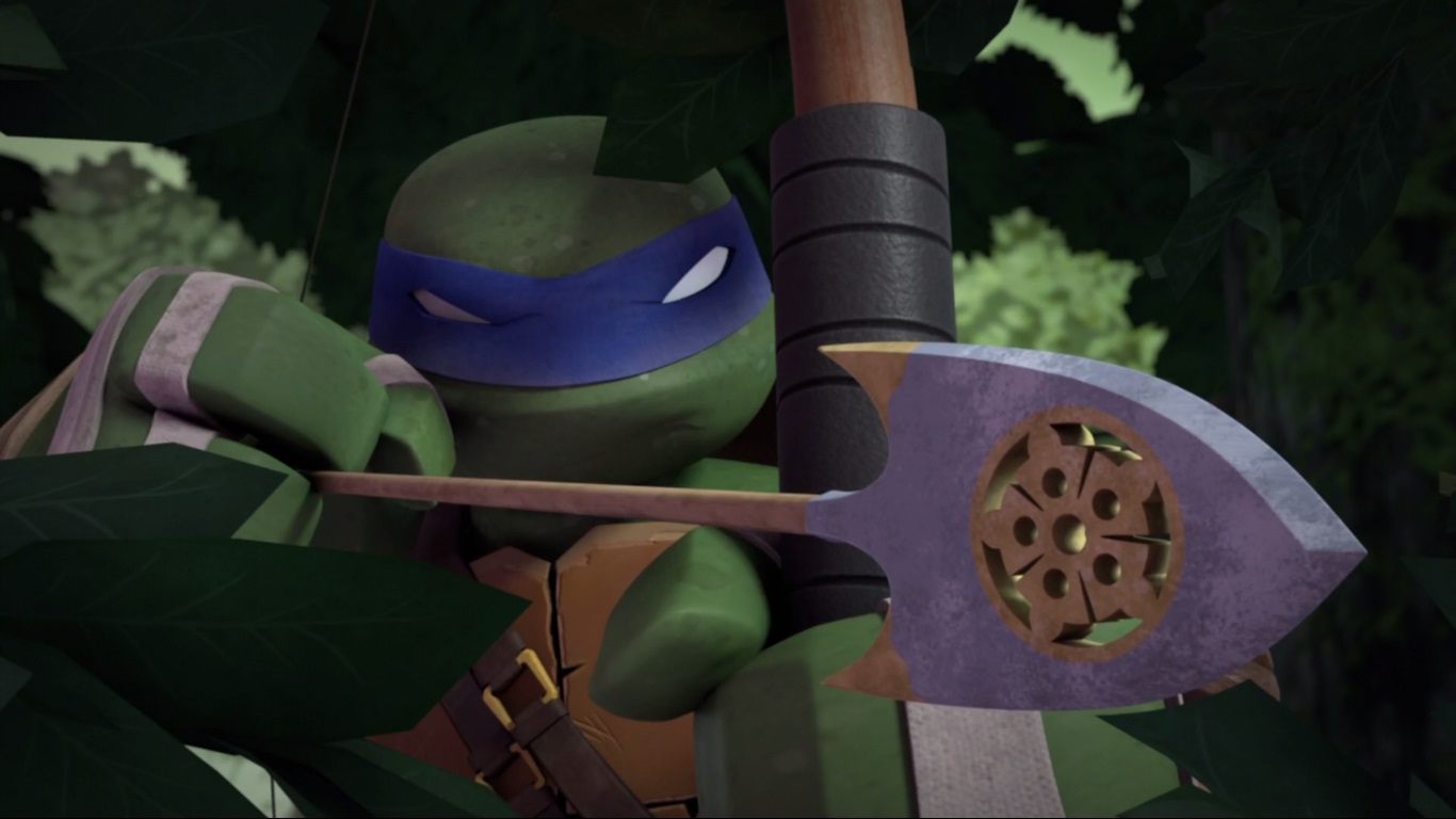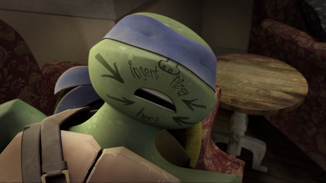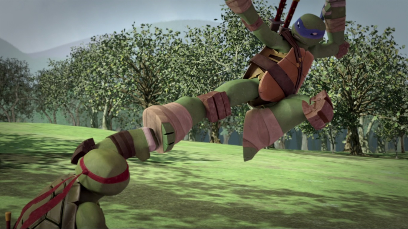 Le jeune ninja était chargé de se battre contre des Foot-bots. Il s’agirait d’un entraînement pour les machines, qui avaient déjà apprises les techniques de Karai. Les autres tortues arrivèrent au même moment pour délivrer leur frère et repousser ces machines extraterrestres (Qui est le chef ?, S2 E2).