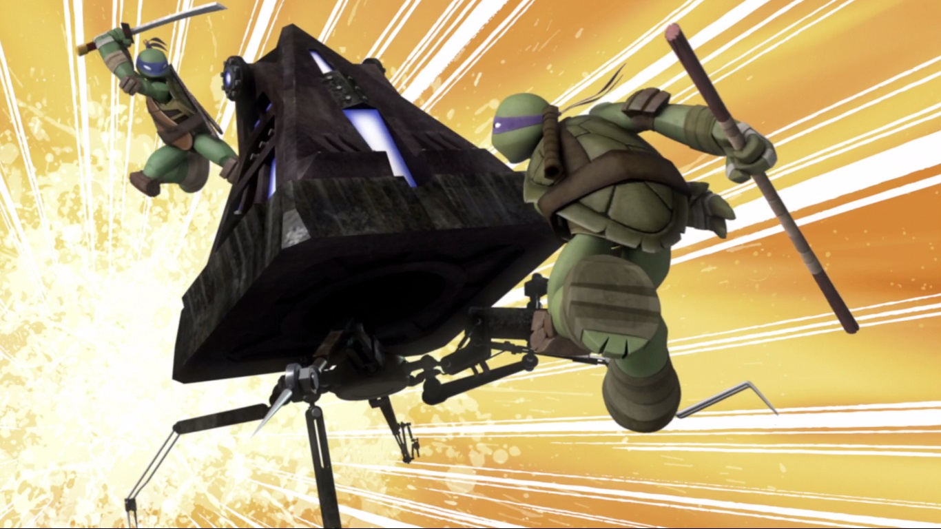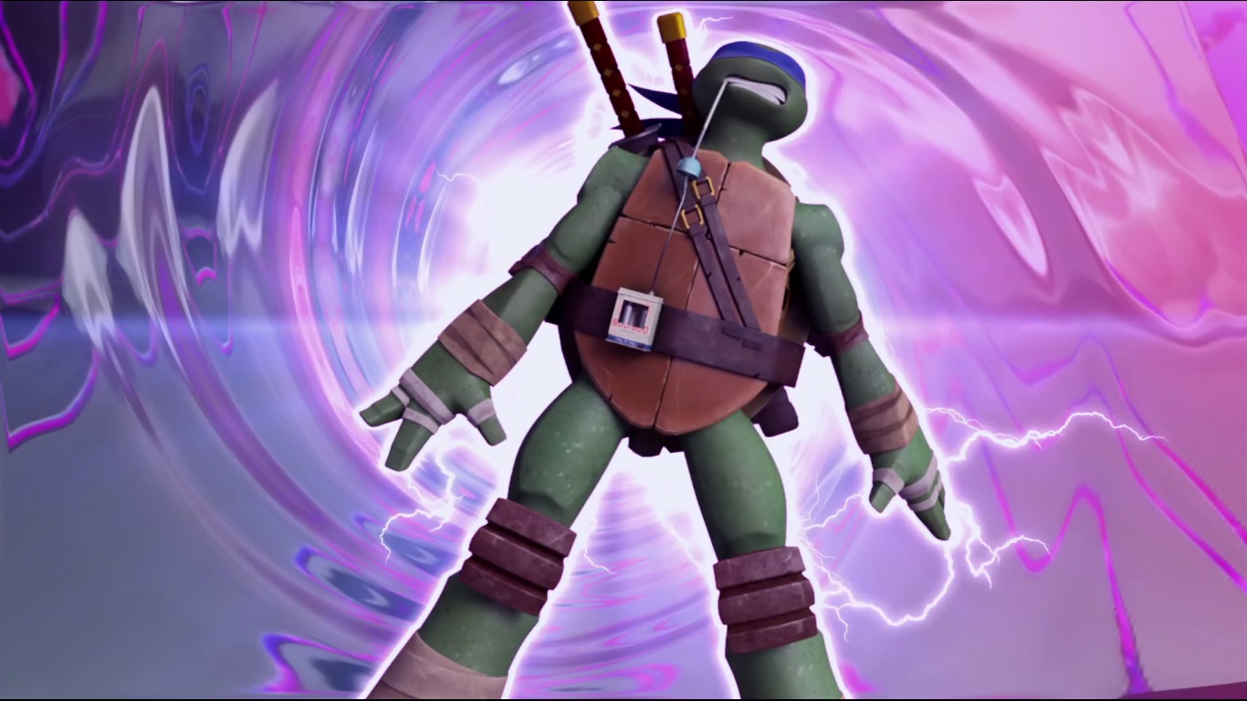 Pendant ce temps, April avait découvert un orbe kraang dans les égouts. Donatello réussit à déterminer une invasion imminente des extraterrestres. Il partit avec ses frères au T.C.R.I. pour empêcher le débarquement. Sur le point de quitter leur repaire, Splinter demanda à Leonardo de ne pas hésiter à se sacrifier en cas de besoin. L’avenir de la Terre en dépendait. Une fois à l’intérieur, les tortues devaient détruire le portail interdimensionnel. Celui-ci était protégé par un champ de force que Donatello s’appliqua à neutraliser. Leonardo chercha à détruire la pile à combustible du portail à l’aide de l’omni-désintégrateur à micro-fissions. Il était trop tard, le Technodrome venait d’arriver sur Terre depuis le ciel (L’affrontement, part. 1, S1 E25).