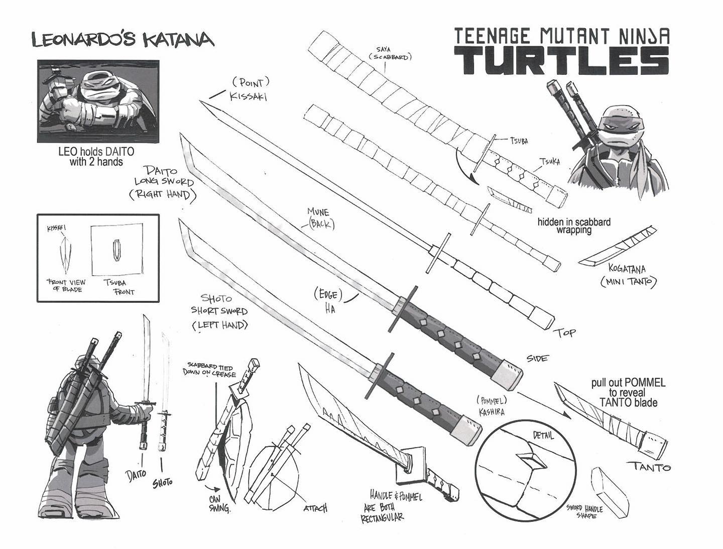 - Nickelodeon et Playmates Toys nomment ses armes principales des Niten Ryu. Ce nom est en réalité une technique de maniement des sabres, inventée dit-on par le célèbre samurai Miyamoto Musashi. L’idée reçue la plus fréquente est de dire que Leonardo manie deux katanas. Dans cet univers, il s’agit de deux ninjatos (忍者刀 ninjatō), (aussi appelés ninjaken (忍者剣) ou shinobigatana (忍刀). Il le dit d’ailleurs lui-même dans l’épisode Le retour du Pulvériseur (S1 E22). Des tantōs sont dissimulés dans les fourreaux de ses ninjatōs.