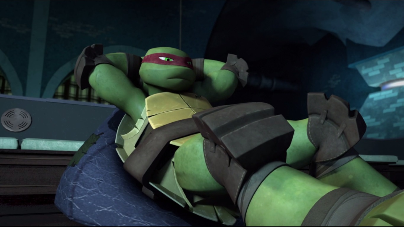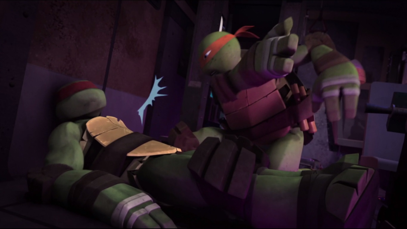 Dans le Shellraiser, après avoir libéré l’homme et le pigeon, Michelangelo cherchait à réanimer Raphael, d’abord avec des claques, puis avec des chatouilles. Mais en se réveillant, la tortue avait une réaction des plus étranges. Ce n’était pas Raphael qui est dans son corps, mais bien un kraang. Celui-ci mettait la pagaille dans le véhicule avant de prendre la fuite à travers les rues.