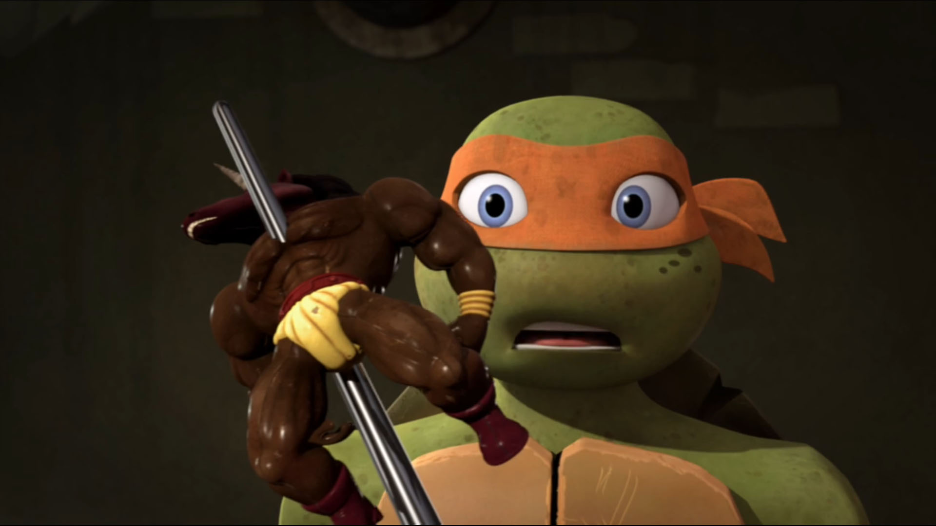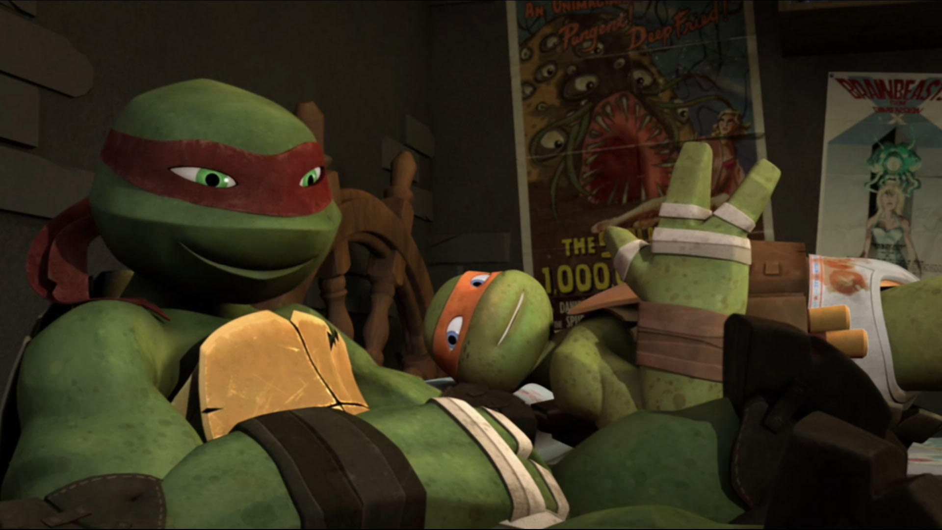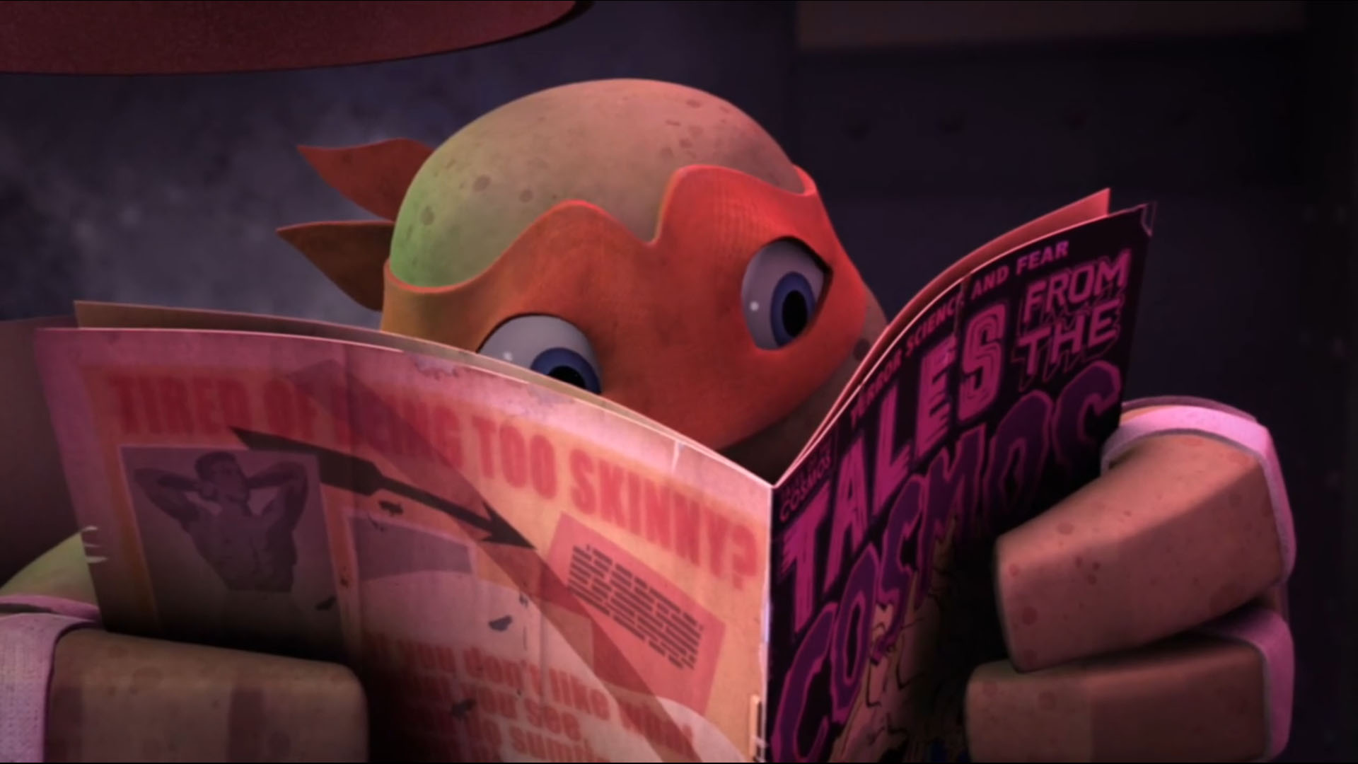 Pendant ce temps, Raphael et Michelangelo avaient abandonnés les recherches et se trouvaient dans la chambre de ce dernier à déguster des pizzas. Soudain, ils voyaient la petite créature dans la collection de figurines du cadet. Raphael sortait ses saïs pour l’embrocher et détruisait les jouets de son frère, en vain. L’écureuil grimpait sur le ninja et entrait dans sa bouche.