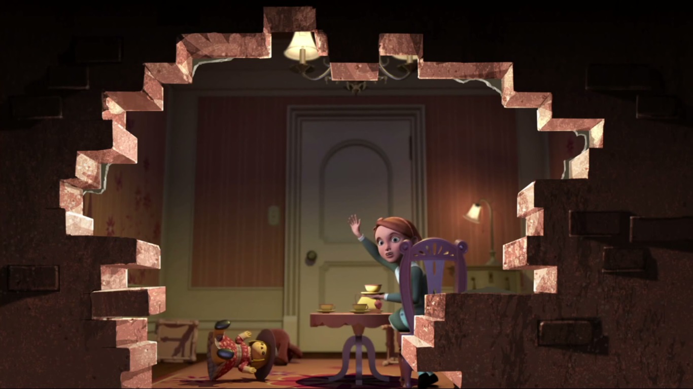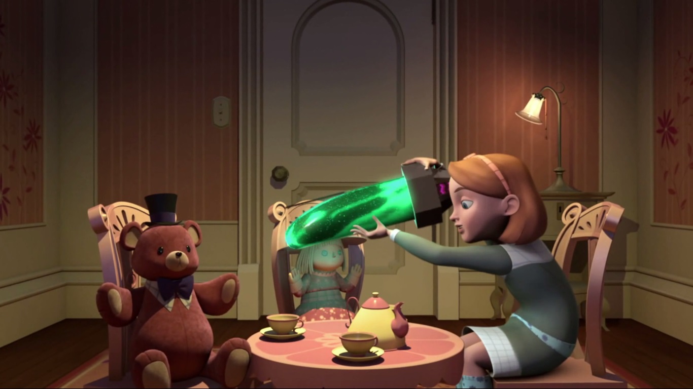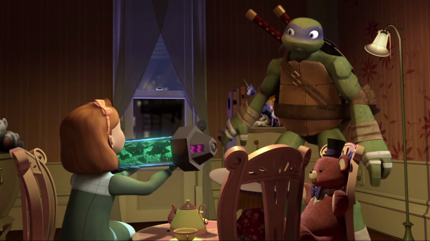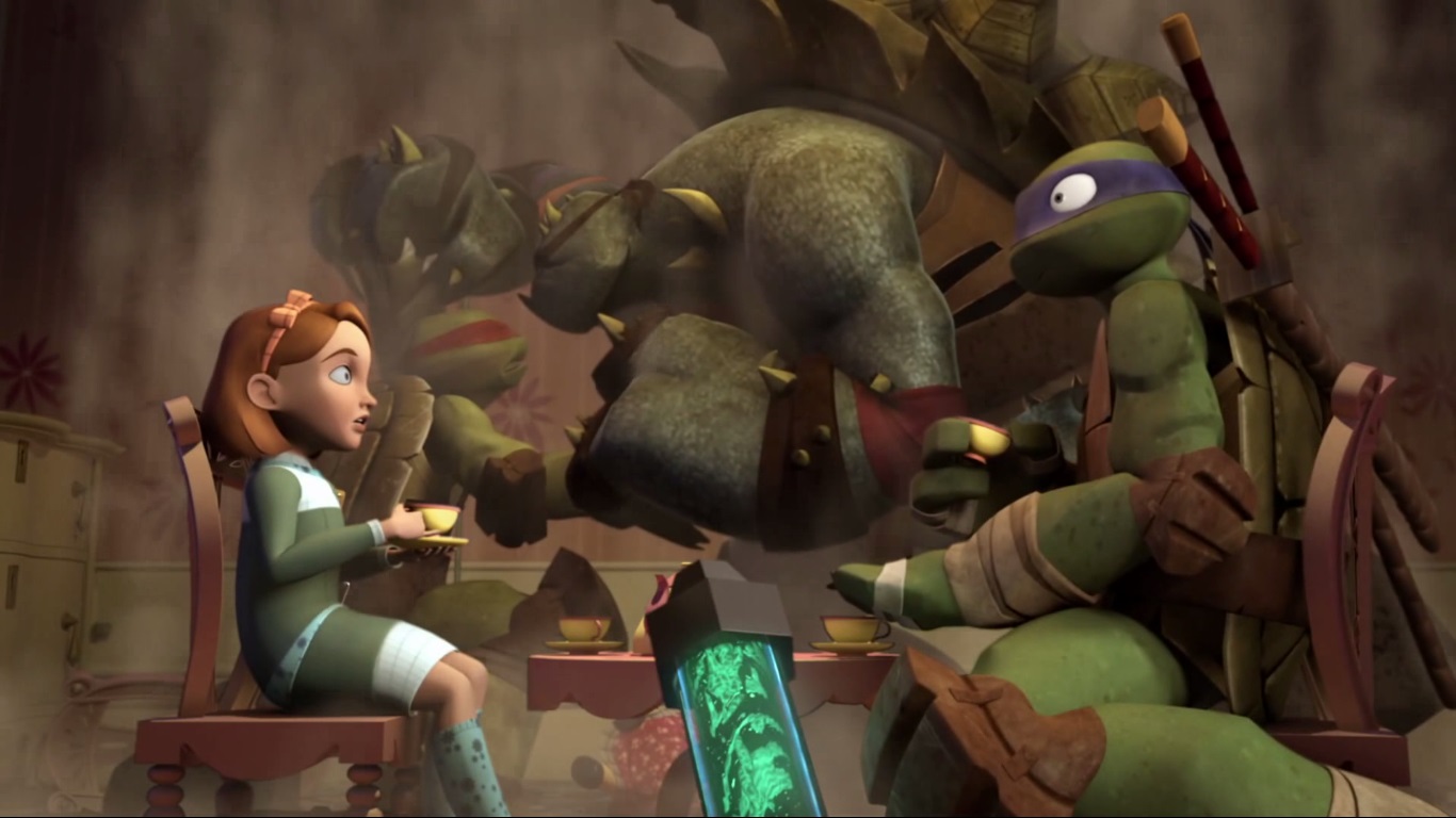 Elle jouait alors à la dînette avec ses peluches. Leonardo entrait à temps pour jeter la tasse de café contenant du mutagène. La fillette s’apprêtait à le boire. Heureuse d’avoir quelqu’un avec qui jouer, elle l’invitait à se joindre à sa table. Elle n’était pas effrayée ! Alors que le ninja lui promettait d’être la seule tortue géante sur Terre, Slash et Raphael traversaient le plafond et terminaient à leur table. Leur combat se poursuivait dans la rue, quittant la chambre de la petite fille par le mur. Sans perdre de temps, Leonardo s’emparait du mutagène et partait rejoindre le combat à l’extérieur. La petite fille disait au revoir à son nouvel ami à travers un mur fracassé…