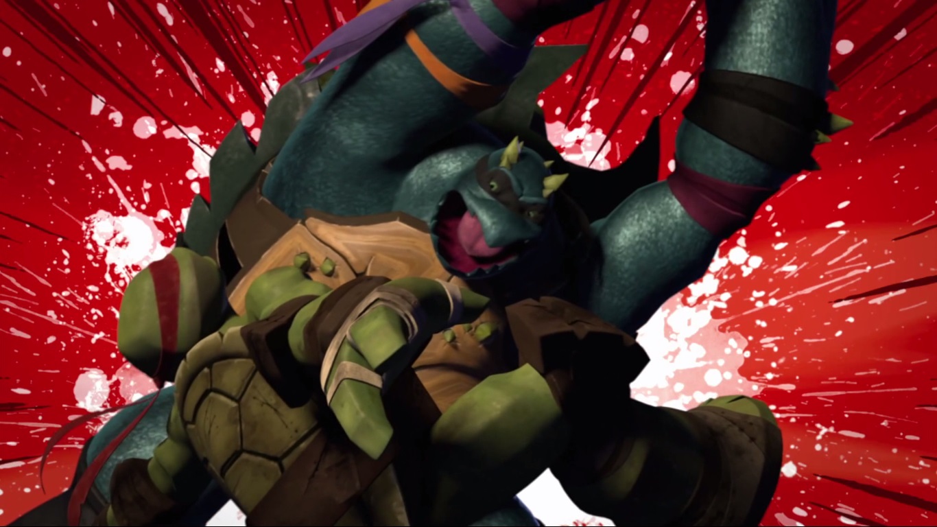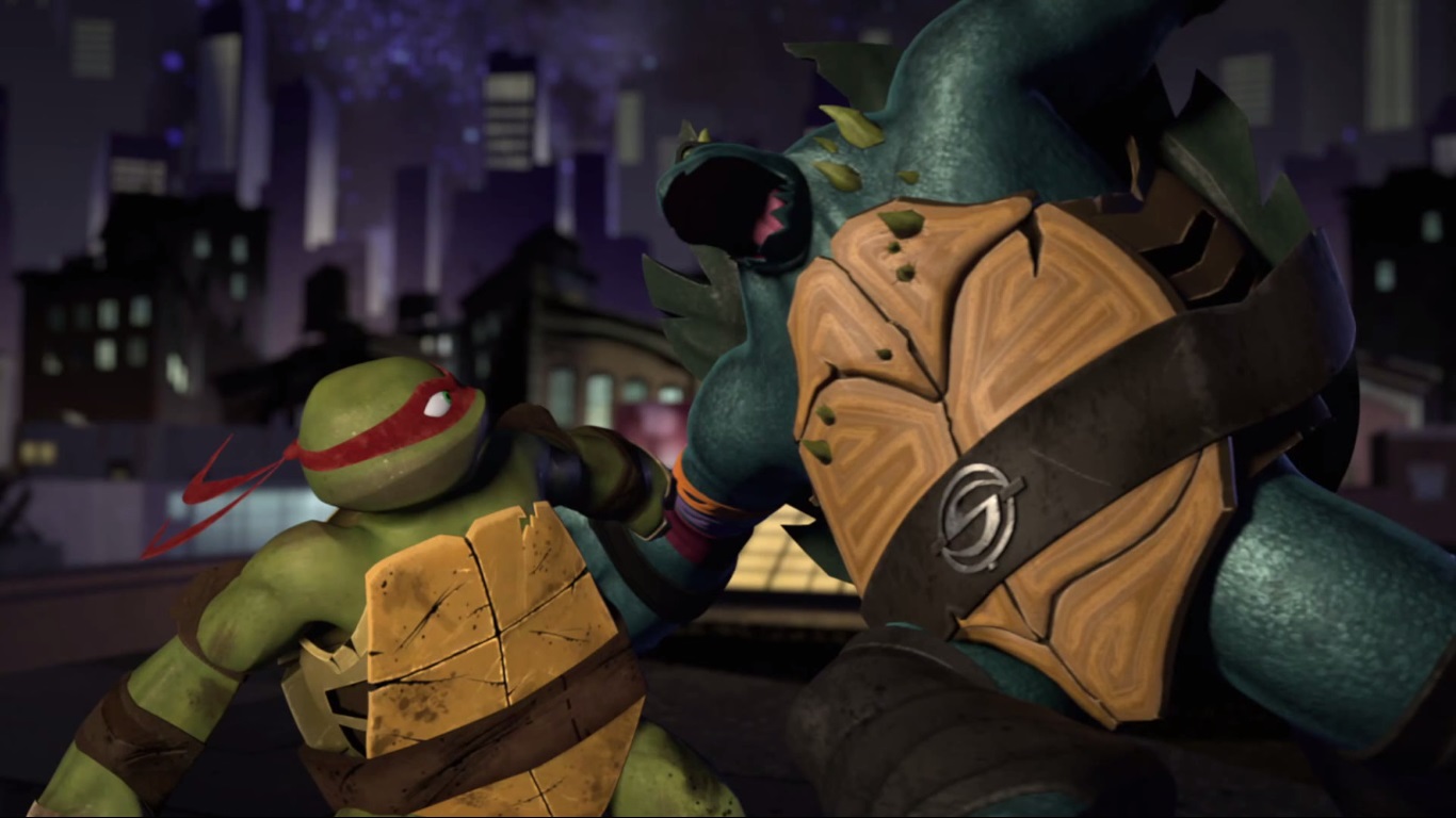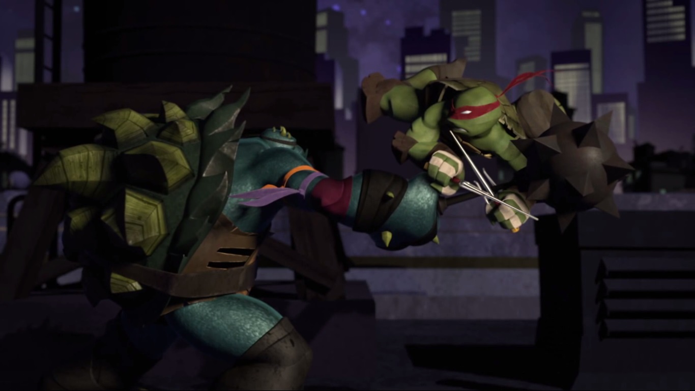 Au moment où Slash désarmait Raphael, Leonardo s’interposait. De rage, il se faisait balayer instantanément. Slash avait un compte à régler particulièrement avec le chef de l’équipe ; le grand rival de Raphael. Combien de fois son maître s’était confié à lui à propos de leurs disputes ? Mais il était hors de question pour le ninja au bandeau rouge de voir Slash décimer sa famille. Son unique chance était d’utiliser une ancienne technique paralysante que Splinter lui avait enseignée. S’attaquant à un point situé sous le bras de Slash, le colosse perdait l’équilibre et s’écrasait au bas de l’immeuble où se déroulait le combat. Désolé pour son vieux Spike, Raphael était surtout préoccupé par ses frères. Après avoir relevé péniblement Leonardo, il s’apercevait que Slash avait disparu.