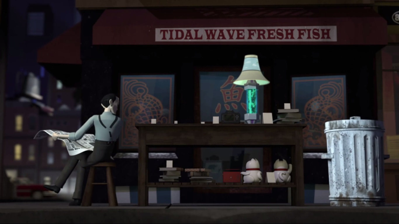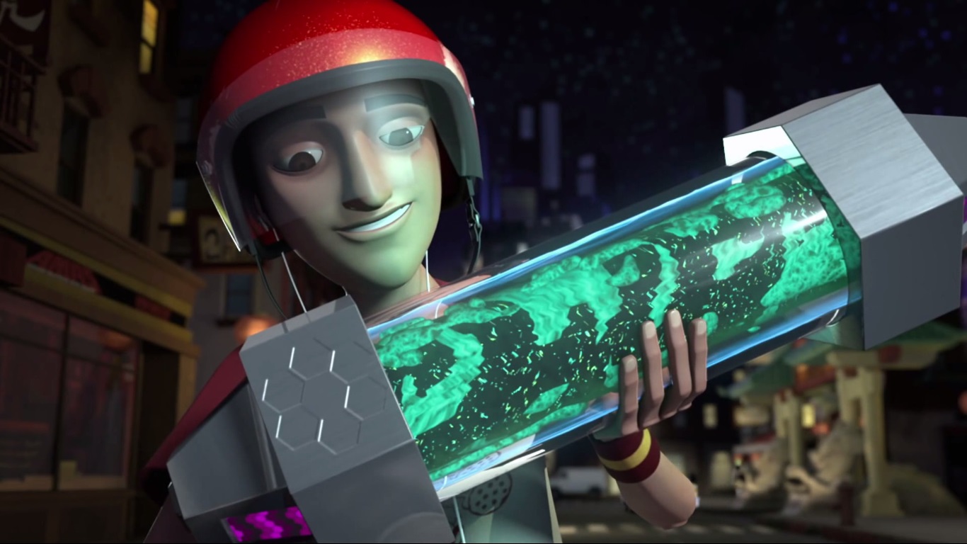 Parallèlement, Leonardo était toujours sur la piste du mutagène, attaché à l’arrière de la moto du livreur de pizzas. Il tentait de l’attraper, mais le bocal se détacha et finit sur la route. Là, il se fit bousculer par les voitures qui passaient jusqu’à échouer sur le trottoir. Il était ramassé, intacte, par un antiquaire de rue. L’homme pensait qu’il s’agissait d’une lampe lave. Récupérer ce bocal s’avérait bien plus compliqué que ce que Leonardo aurait pu imaginer. La tortue se camouflait dans une poubelle pour approcher l’étale du brocanteur. Au moment où il s’apprêtait à saisir le bocal, une petite fille le vit et supplia son père de la lui acheter. Leonardo n’avait d’autre choix que de les suivre et s’inviter dans la chambre de l’enfant pour lui prendre l’objet.