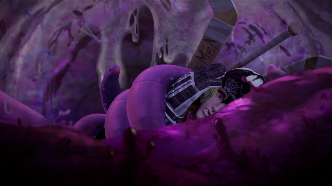 Le ver géant les poursuivait à travers la ligne de métro. Casey, pour le ralentir, lui lançait une bombe de peinture à la figure. Impossible d’arrêter le monstre. Donatello s’agrippait aux barreaux d’une échelle et aidait April par la même occasion à échapper à la créature. Mais Casey ne parvint pas à s’y réfugier. Le kraathatrogon avala l’adolescent sous les yeux de ses amis…