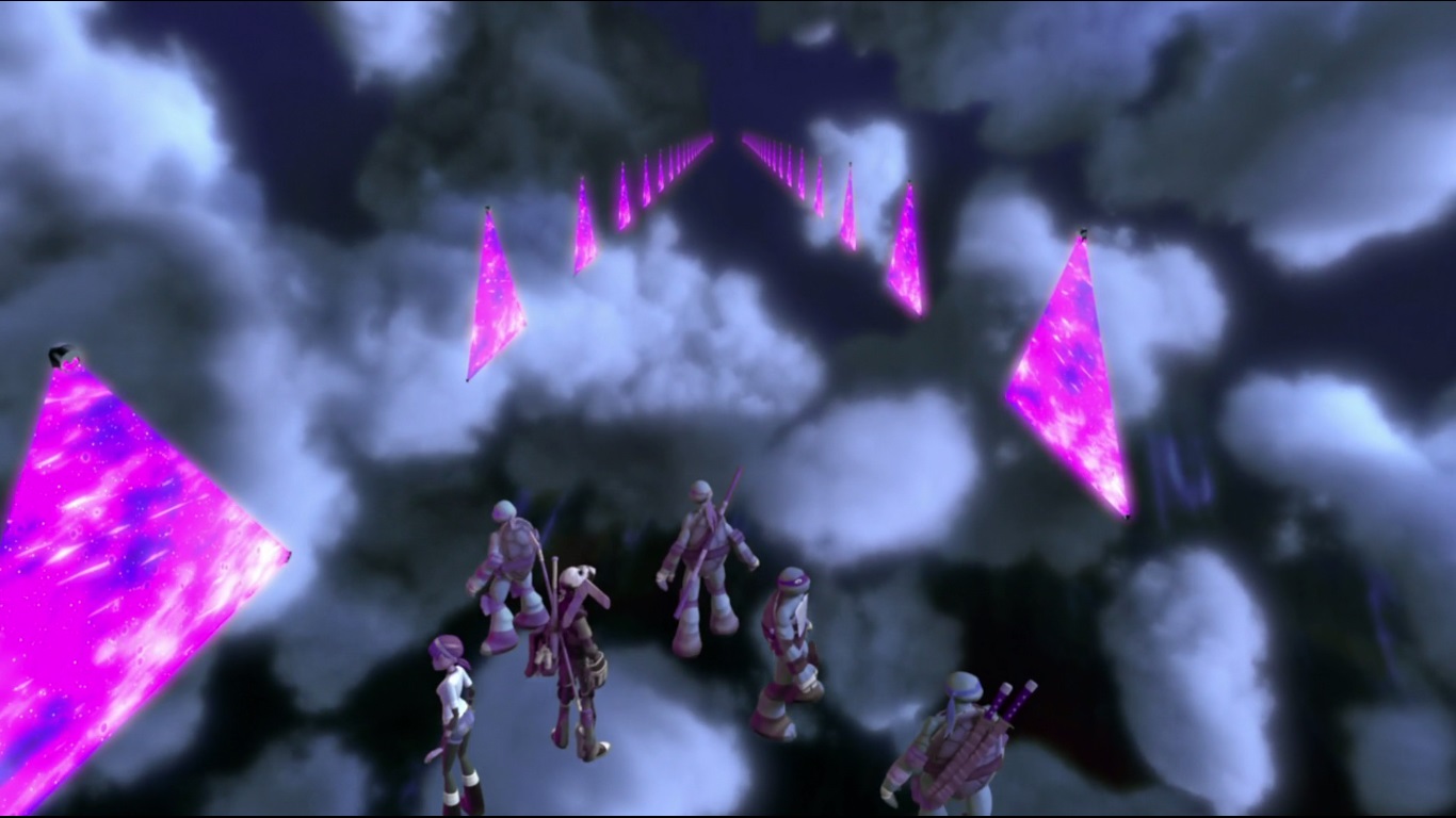 Arrivés dans la nouvelle dimension, les tortues se retrouvaient nez à nez avec une rangée de portails disposés de part et d’autre d’un couloir. Donatello pensait qu’il s’agissait d’une sorte de relai pour les kraangs, leur permettant de se rendre dans diverses dimensions. Les différents portails ouvraient sur plusieurs mondes différents, certains étranges, d’autres magnifiques et… Ils virent leurs doubles arpenter les rues de New York. Il s’agissait de l’univers du dessin animé de 1987 ! Donatello eut un coup de cœur pour la combinaison jaune d’April.