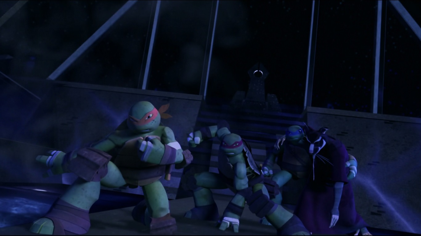 Mais les kraangs n’étaient pas loin. À travers un portail, deux biotroids s’attaquaient aux intrus. Tant bien que mal, l’un des deux robots se faisait détruire. Le second renvoyait Leonardo, Raphael et Michelangelo sur Terre, à travers un autre portail.