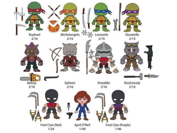 Seconde série à faire son apparition, est la 3″ Vinyl Figures, à ne pas confondre avec les Pop Vinyl ni les Kidrobot. Pour le moment, la série comporte les quatre tortues, Splinter, April, Shredder, Bebop, Rocksteady et deux Foot. Ce qui est intéressant dans cette petite série, est en dehors d’un énième design (très intéressant ceci dit), les différents univers des quels sont tirés les personnages. Si les tortues font penser au dessin animé de 2003 sans pour autant en être certain, Splinter l’est quant à lui bel et bien. Shredder, April et l’un des Foot (rose) sont eux, tirés du comics original. Le second Foot, de design identique au premier, a ses couleurs rappelant plus ceux du premier dessin animé. Rocksteady rappelle celui de la série de 1987, et Bebop, avec sa tronçonneuse et son style barbare, rappelle celui de la série actuelle, éditée chez IDW. Chaque personnage est accompagné d’une série d’accessoires très bien sculptés. Ils sont disponibles, en lot total cependant pour 207$ !