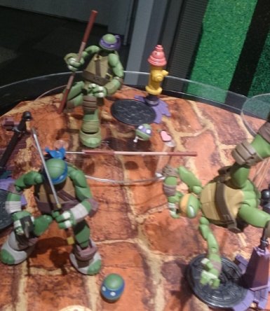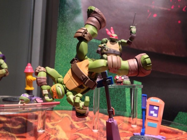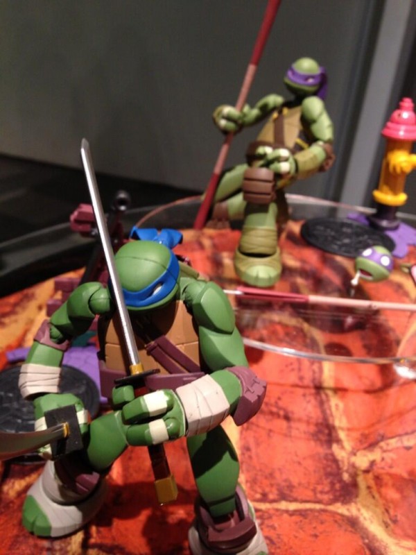 Nous allons commencer par la sans doute plus attendue, et surtout la plus surprenante, il s’agit des tortues made in Japan de chez Revoltech. Quoi qu’est-ce donc ? Eh bien c’est ce que Playmates semble incapable de nous apporter au vu de la qualité décroissante de ses figurines depuis le début de la nouvelle série. Ce sont des figurines extra articulées (une vingtaine de points), extrêmement fidèles aux tortues du dessin-animé, accompagnées d’un socle avec un élément de décor propre, leurs armes respectives, et une tête interchangeable, entre une figure normale, et une caricaturée. Donatello a la tête d’amoureux, Raph du rageur, Mikey en mode farceur, et Leonardo surpris. Donatello a un second bô, avec une lame rétractable. Même si on ne le voit pas, Michelangelo aura certainement son kusarigama.