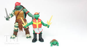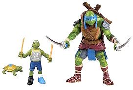 Nous connaissons maintenant tous les figurines du film. Elles sont divisées en trois catégories, figurines de base, 11″ Figures et Combat warrior figures. Etaient également présents des packs, celui des quatre tortues, mais aussi un qui s’est fait plus rare, le pack évolutif trois figurines, qui lui sera une exclusivité de chez Target. Ce pack contient la mutation de Leonardo et de Raphael, du stade de tortue de laboratoire, à celui de TMNT, en passant par la case adolescent. La figurine finale des deux frères rivaux ne change en rien de celle que l’on peut trouver en grande surface et vient accompagnée de ses armes respectives. C’est donc une offre pour pouvoir avoir en plus une tortue en forme normale, ainsi que la forme jeune des tortues, possédant malheureusement très peu d’articulations.