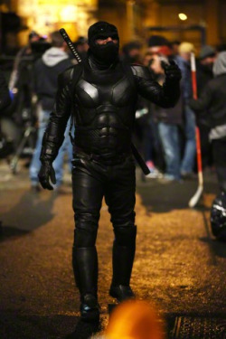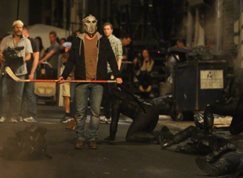 Voici d’autres images de Stephen Amell, alias Casey Jones, en tenue civile. Il n’y a pas que la nuit qu’il combat!