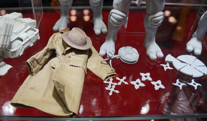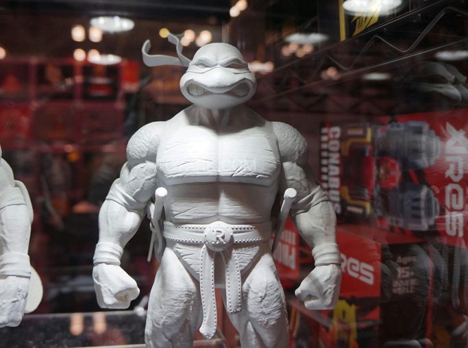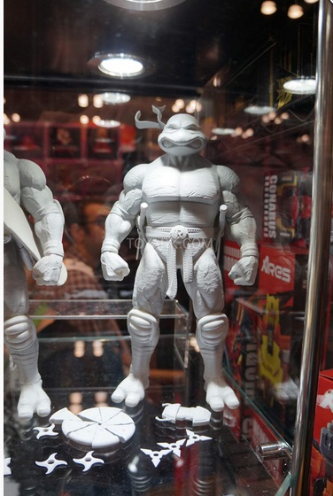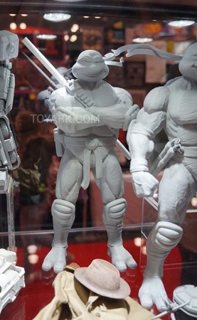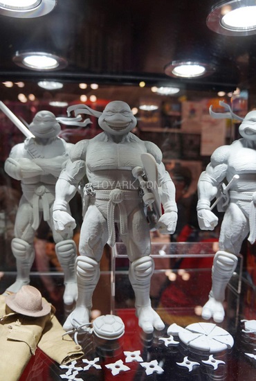 Si vous avez suivis l’actualité des Tortues Ninja en fin de mois dernier, vous avez certainement dû être interpelé par quatre nouvelles tortues produites cette fois par Dream Ex. La publicité avait été faite avec une image ombrageant les tortues. Sur le stand en question, il fut possible d’avoir un petit avant-gout de ce à quoi elles ressembleront. Certes, ce n’était que le prototype, mais nous avons ainsi pu découvrir ce design, une fois encore original, qui semble tirer vers différents univers, comme les têtes rappelant beaucoup celles des tortues de la série animée de 2003, la boucle de ceinture de 1988. Ces figurines viendront accompagnées de nombreux accessoires comme tortuecom identique à celui de la série de 1988, mais aussi un grappin (certainement pour Michaelangelo), un trenchcoat complet, et une pizza découpée en parts. Chaque tortue aura également un ensemble de shurikens tous différents. Michelangelo aura également un skateboard.