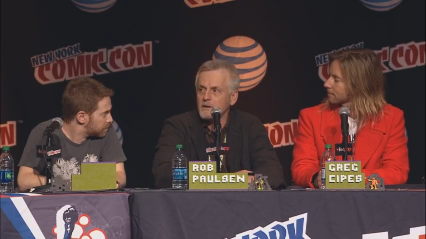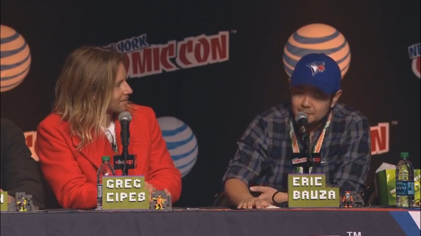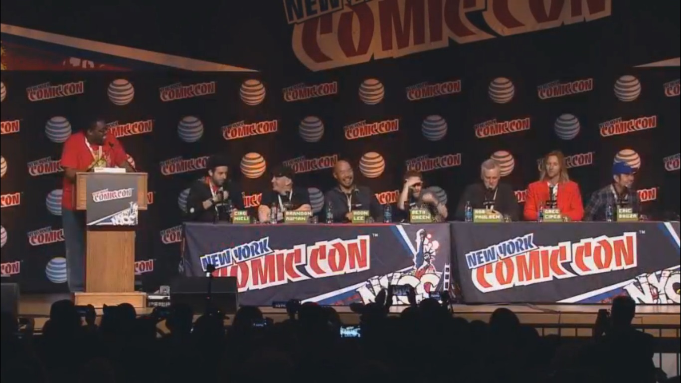 Et voilà, les révélations du New York Comic Con sont enfin arrivées! Ce fut au cours de la soirée du jeudi 8 octobre aux alentours de 20h (heure française, 14h là-bas). Le spectacle était supervisé par Black Nerd, qui avait déjà eu l’opportunité d’animer la présentation des Tortues Ninja au cours du San Diego Comic Con dernier. Du très beau monde était invité ! Ciro Nieli (producteur exécutif) et Brandon Auman (producteur exécutif et scénariste pour la série) ouvraient le bal, accompagnés de Hon Lee (Splinter), Seth Green (Leonardo), Rob