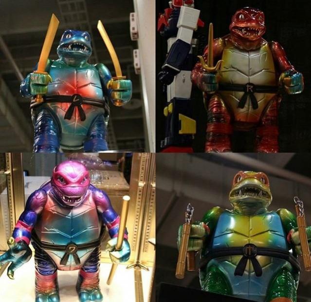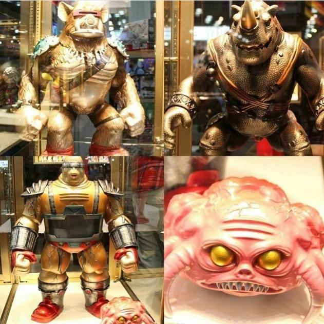 Toy Tokyo (et non pas Funko Hikari comme nous l’avions initialement annoncé) se lance également dans le TMNT. Ces figurines mesurent environ 20″ de haut et devraient coûter autour de 150$. On y retrouve Bebop, Rocksteady et Krang ainsi que des quatre tortues dans un style très particulier. Nous n’avons aucune information dessus, mais leur design n’est pas sans rappeler les fameux monstres Kaiju (Godzilla, King Gidorah, Mothra etc.). Rocksteady a une peau écaillée rappelant d’ailleurs ces costumes notamment des années 60-70. Bebop n’est pas sans rappeler également le touffu King Cesar. Les tortues quant à elles semblent être un hommage à la célèbre tortue Gamera ! Serait-ce un clin d’œil pour le retour des deux géants Godzilla et Gamera sur grand écran cette année au Japon?