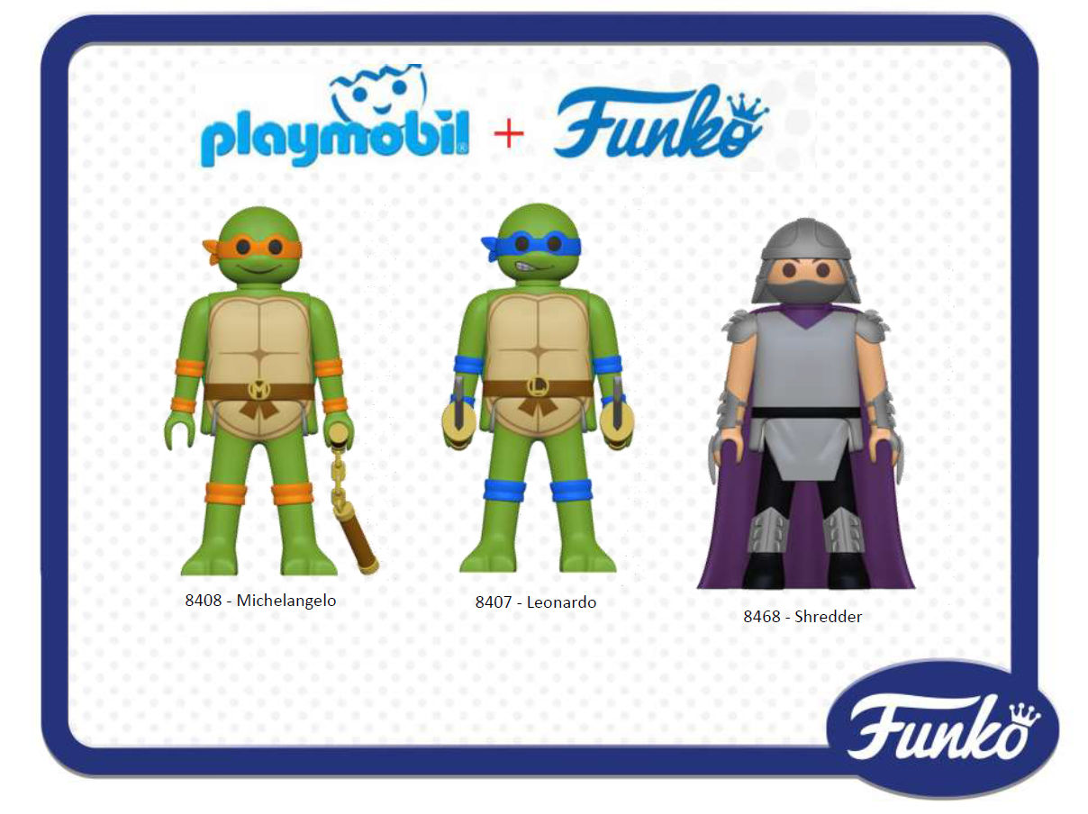Aucune Grande surprise chez Funko, juste des confirmations ! Le 26 décembre, le fabricant avait réalisé son habituel communiqué résumant leurs projets futurs, et parmi eux, une nouvelle gamme de 15cm de haut incluant les Tortues Ninja. En janvier, nous en avons su un petit peu plus sur cette mystérieuse gamme, qui serait une version Playmobil de personnages de licences comme Walking Dead, Retour vers le Futur et… Trois personnages Tortues Ninja. Il s’agit de Leonardo, Michelangelo et Shredder.