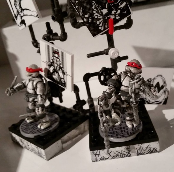 Enfin, il est difficile de savoir exactement comment se répartiront les figurines pour la série issue du comics original. Un playset semble avoir été réalisé accompagné au moins de Shredder et d’un soldat Foot. Les quatre tortues auront droit à un présentoir comme les tortues de la gamme Collector Classic. Casey Jones semblerait également de la partie! Ah et j’oubliais… Le tout en noir et blanc s’il vous plait!