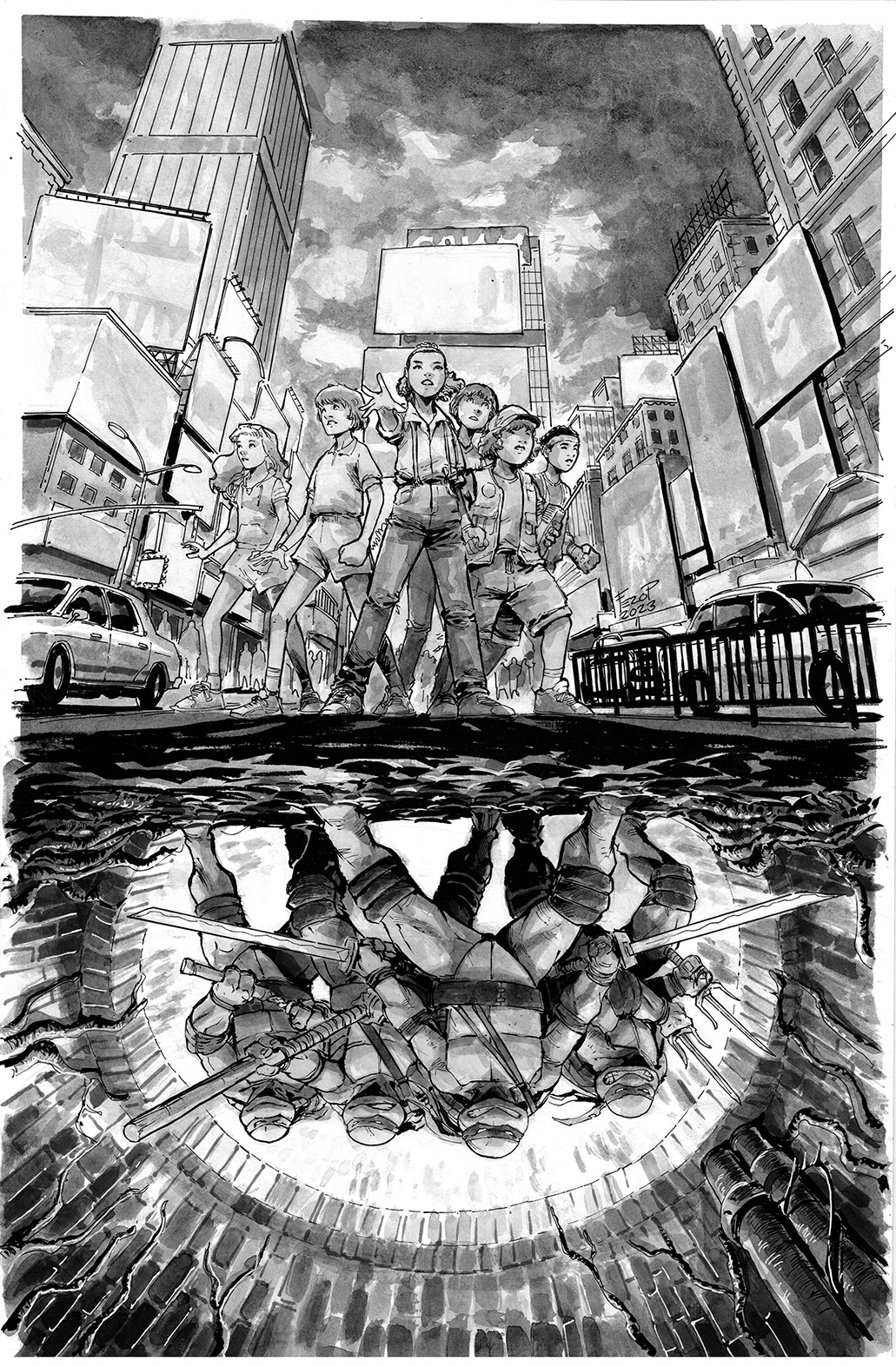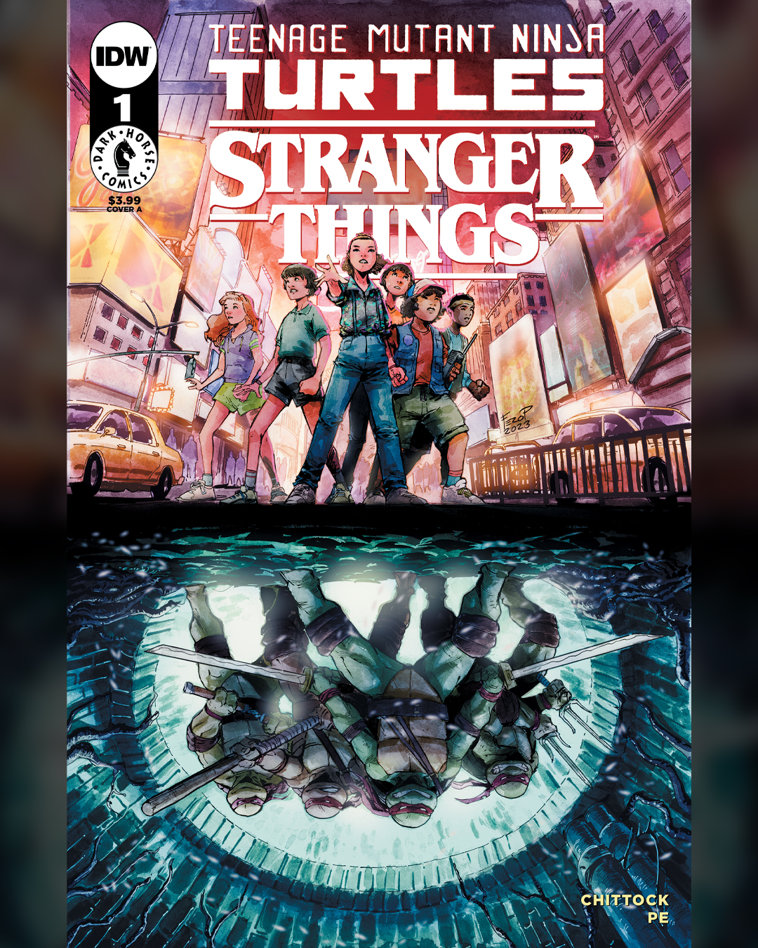 La couverture principale, réalisée par Fero Pe, présente les tortues avec un bandeau rouge. S’agirait-il donc bien des versions de Mirage ? Ou d’un simple clin d’œil, avec des tortues n’appartenant à aucun univers précis (comme bien souvent) ? La réponse cet été ! Pour rappel, Playmates Toys avait sorti l’année dernière une gamme crossover TMNT x Stranger Things. À l’image de Street Fighter, ces figures seraient-elles sorties trop tôt ? Du côté d’IDW, le nombre de crossovers avec de grandes licences s’enchaîne ces derniers temps, pour une sortie cet été. Nul doute qu’un certain film y est pour quelque chose !