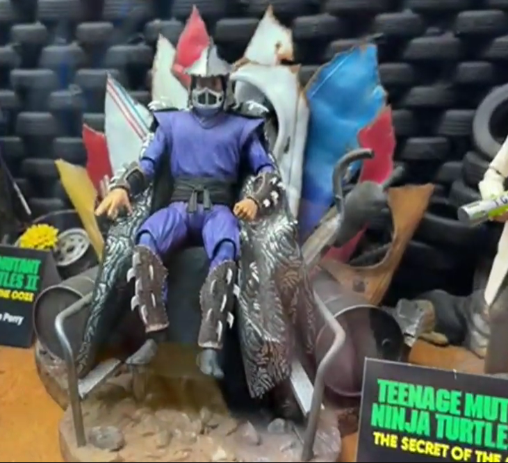 Le trône quant à lui soulève beaucoup de questions sur les réseaux sociaux. D’où vient-il ? Simplement de la version coupée du film. Nous disposons de certains passages grâce au comic du film sorti à l’époque chez Tundra et Archie. Mais aussi grâce aux cartes Topps. Sur l’une d’elles, nous pouvions voir Shredder trôner fièrement sur un siège composé de carrosseries de voitures et autres pièces métalliques. Game of Thrones n’a rien inventé !