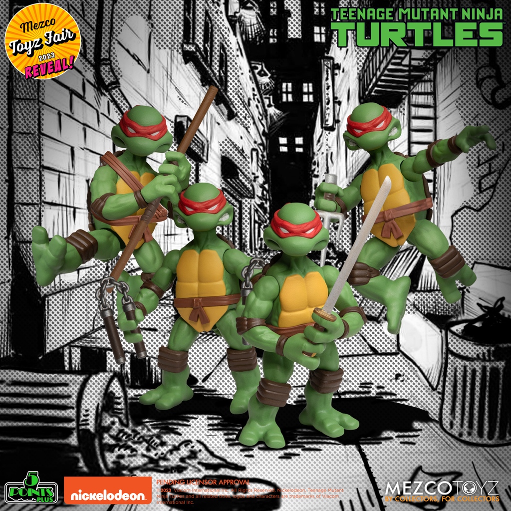 Il y a plusieurs mois de cela, Mezco Toyz annonçait des Tortues Ninja pour sa gamme 5 Point. Ces figurines de moins de 10 cm de haut, inspirées du comic de Mirage, sont articulées uniquement au niveau de la tête, des épaules et du bassin (d’où leur nom). En revanche, elles disposent de plusieurs jeux de bras et de jambes interchangeables pour varier les postures. La possibilité de changer les mains permet également une rotation des poignets.