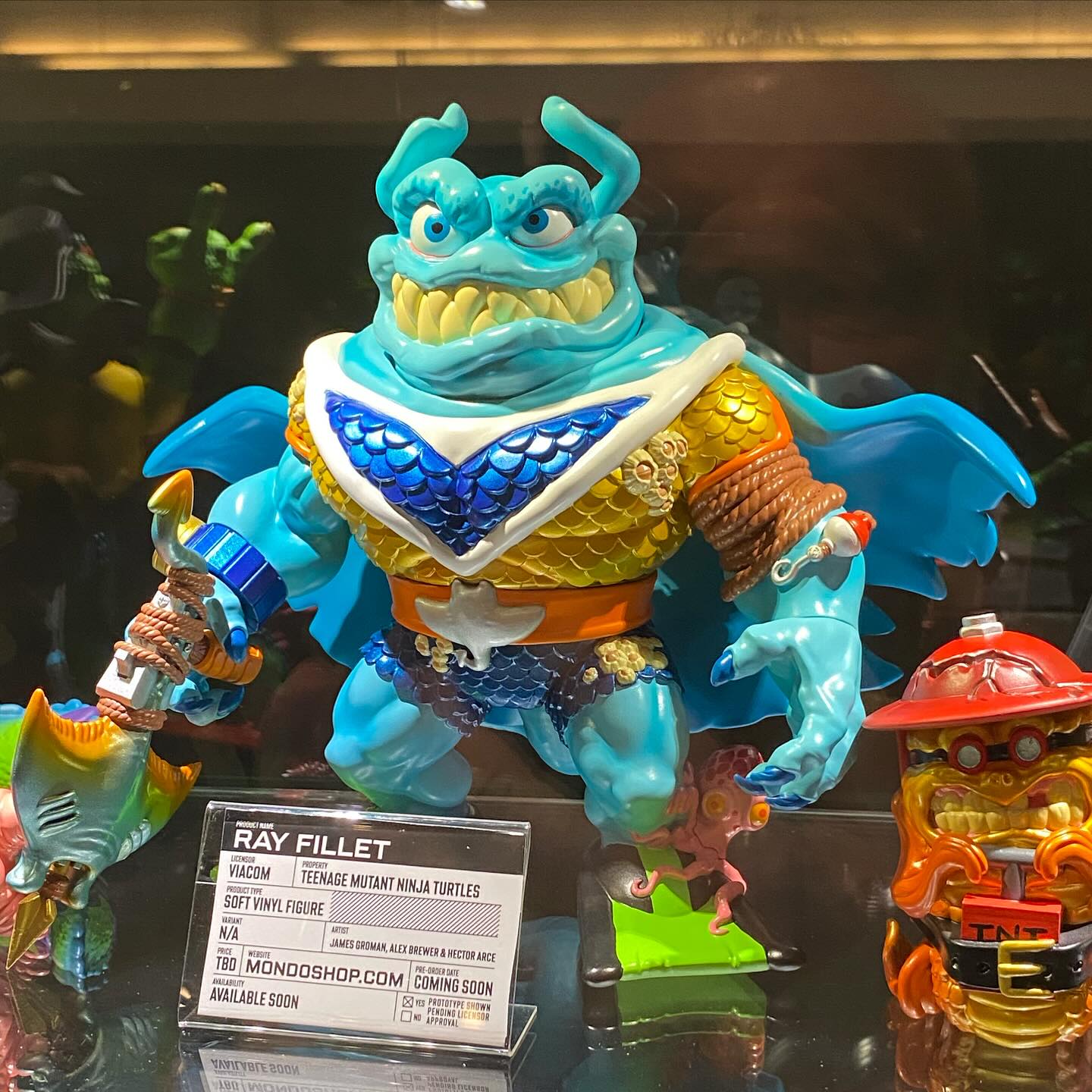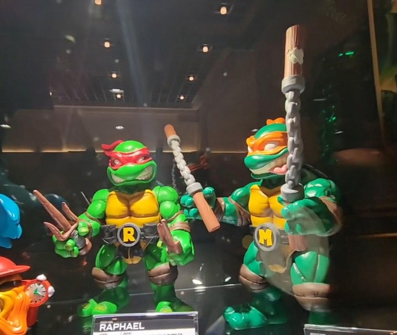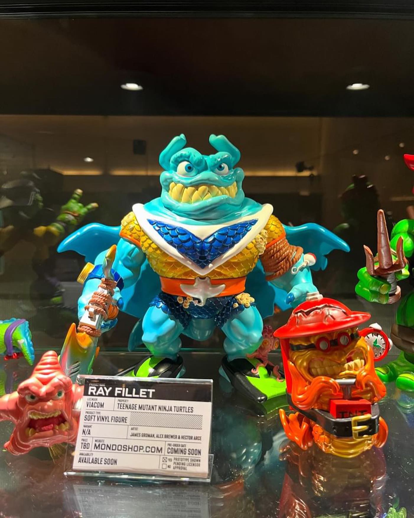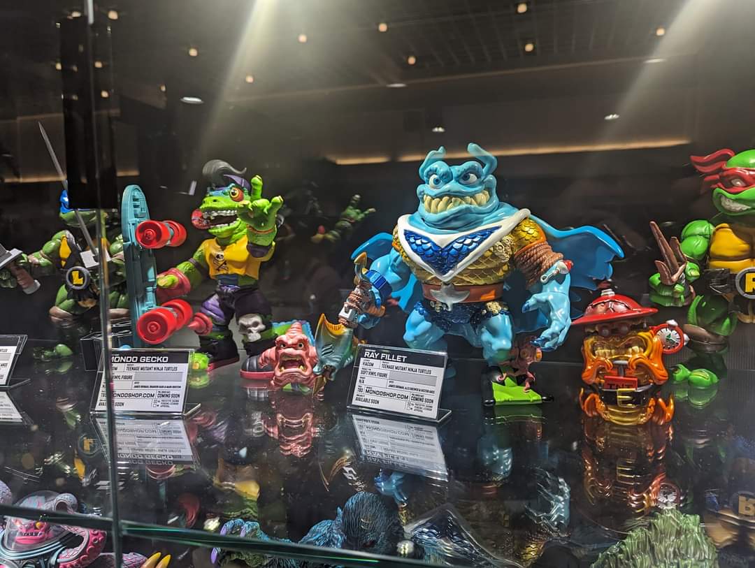 Les fans qui se trouvaient sur place ont ainsi pu découvrir Raphael et Michelangelo, mais aussi les prototypes de Mondo Gecko et de Ray Fillet, qui n’attendent plus qu’une approbation de Viacom. Les deux tortues sont sculptées Alex Brewer. L’artiste est rejoint sur Mondo Gecko et Ray Fillet par le grand James Groman, à qui l’on doit déjà les designs des figurines des TMNT x Universal Studio Monsters de NECA. L’équipe est complétée par Hector Arce à la peinture.