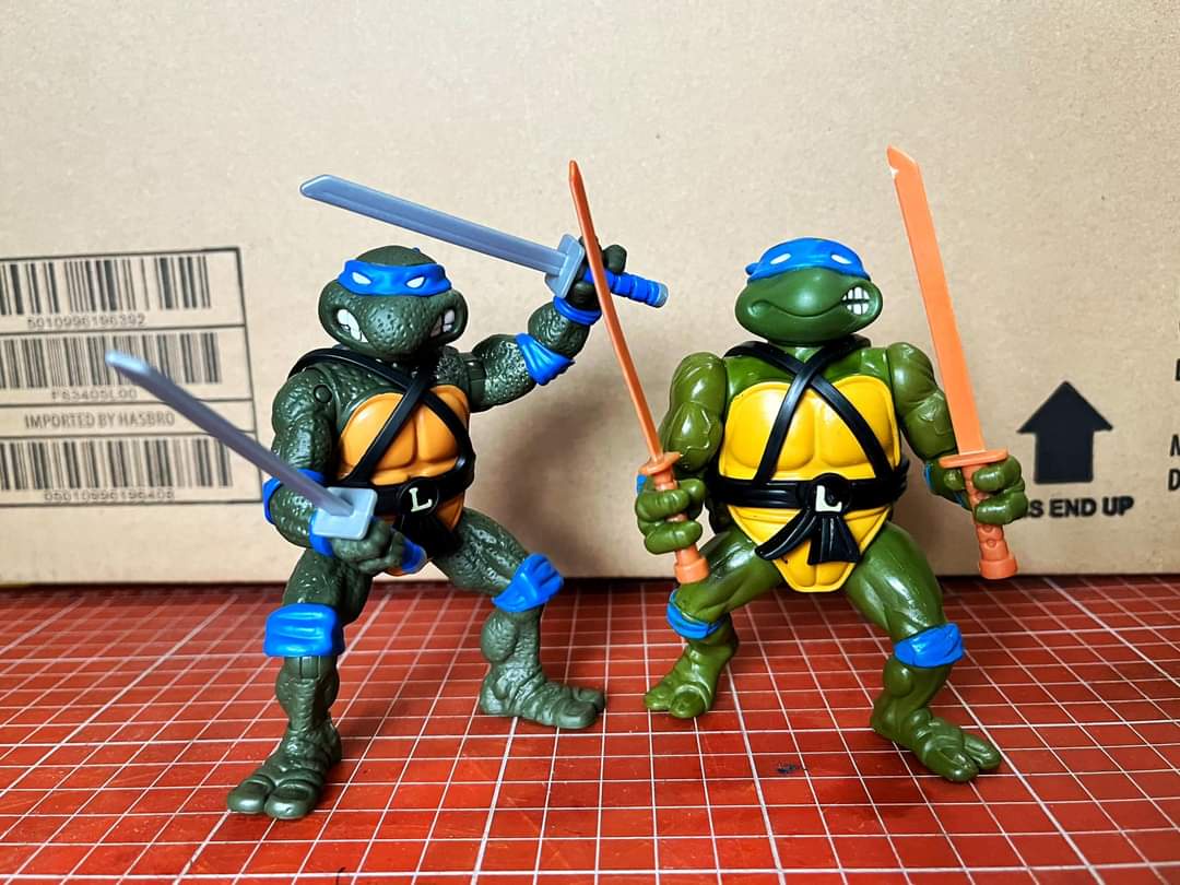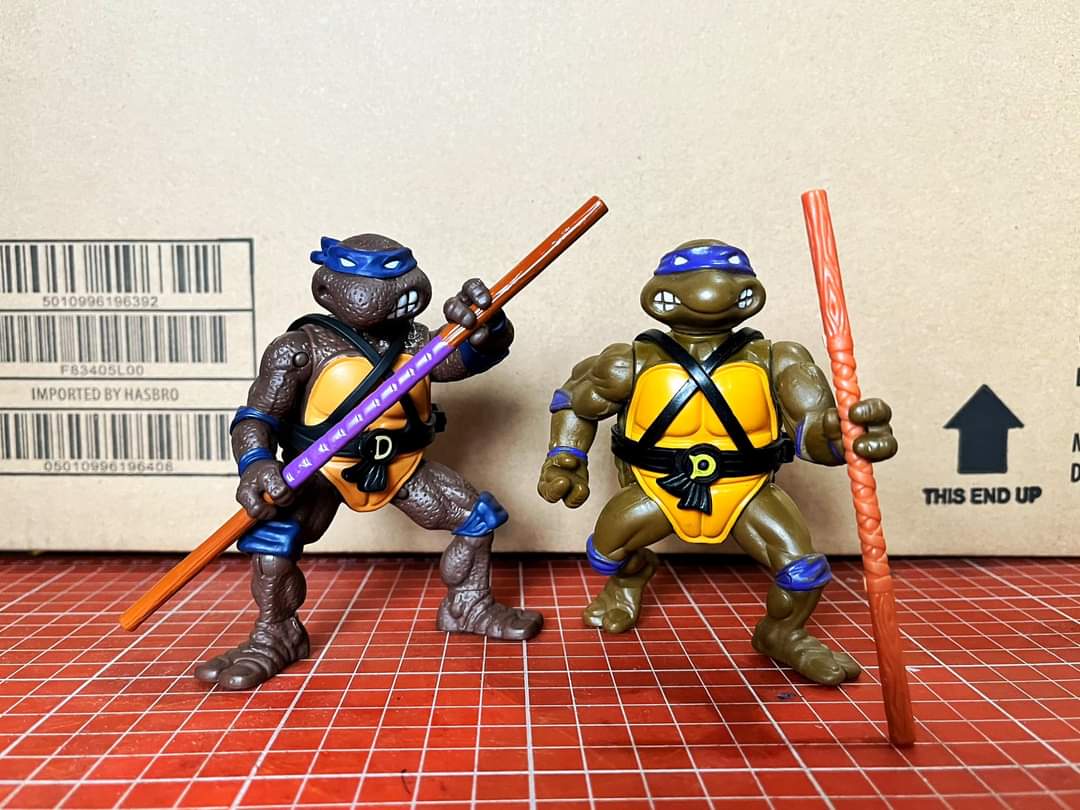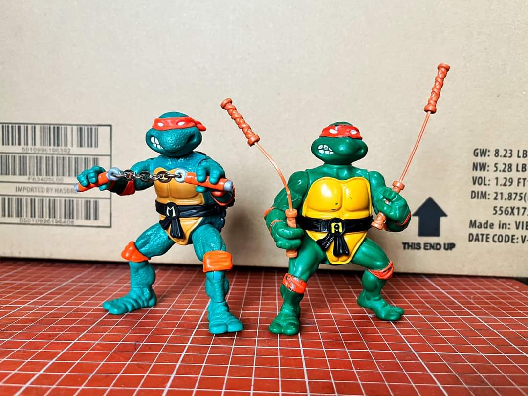 Parmi les nouvelles productions, nous retrouvons les TMNT Remastered, inspirées des figurines de 1988, avec une nouvelle sculpture et de nouvelles articulations. Ces figurines commencent à être trouvées aux États-Unis, de quoi avoir de meilleurs visuels de celles-ci. Outre la texture extrêmement surprenante, rappelant les Movie Stars de 1991 et une inversion des têtes de Leonardo et de Donatello, nous avons-là également la confirmation du réemploi des armes des Classic Collection de 2012.