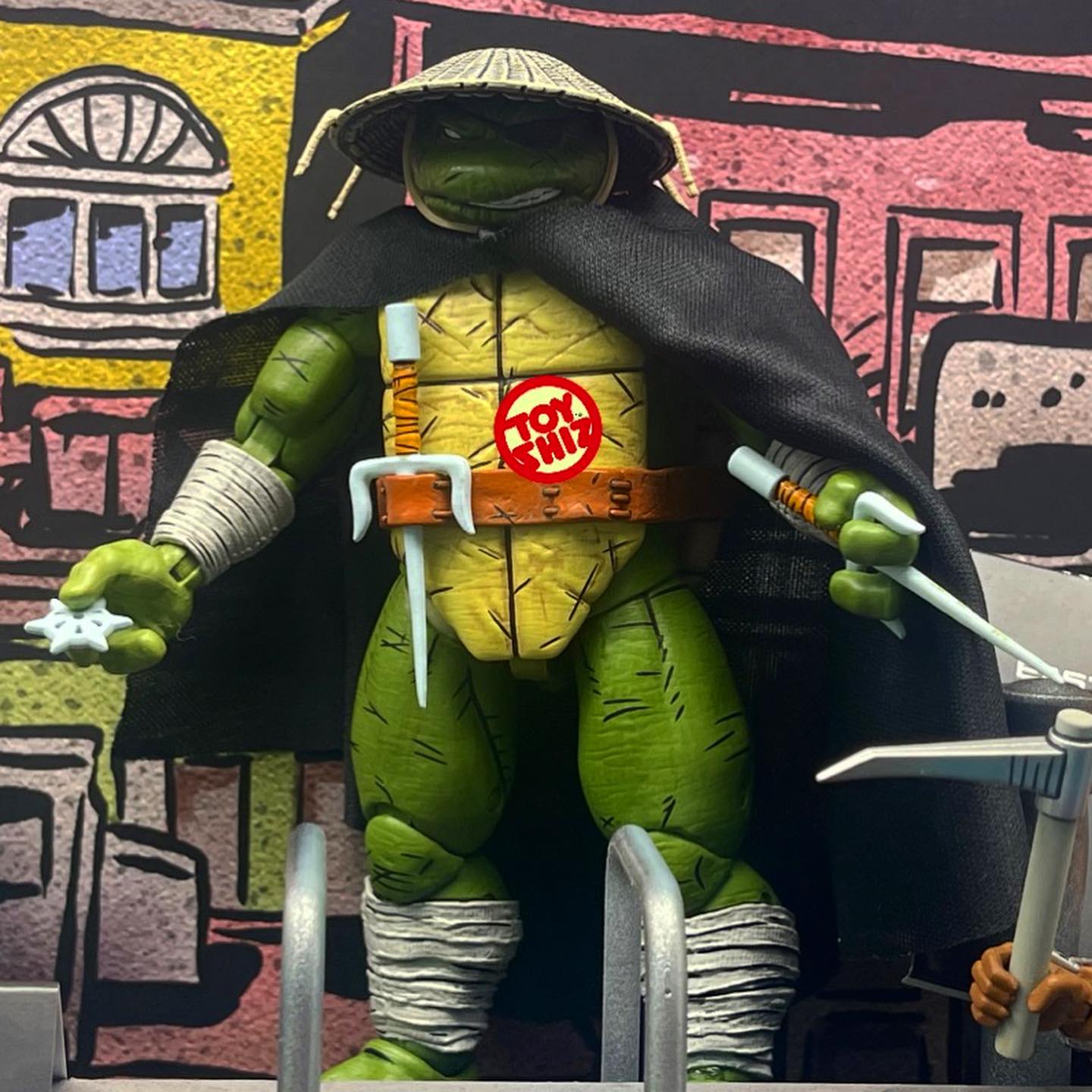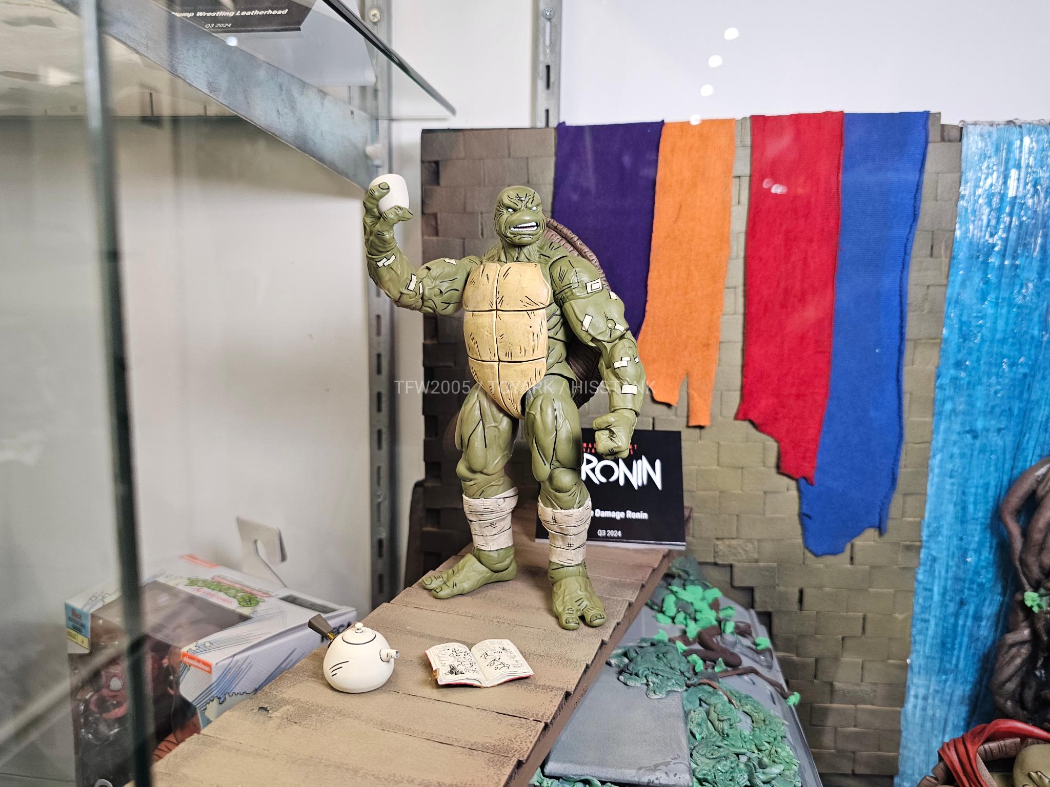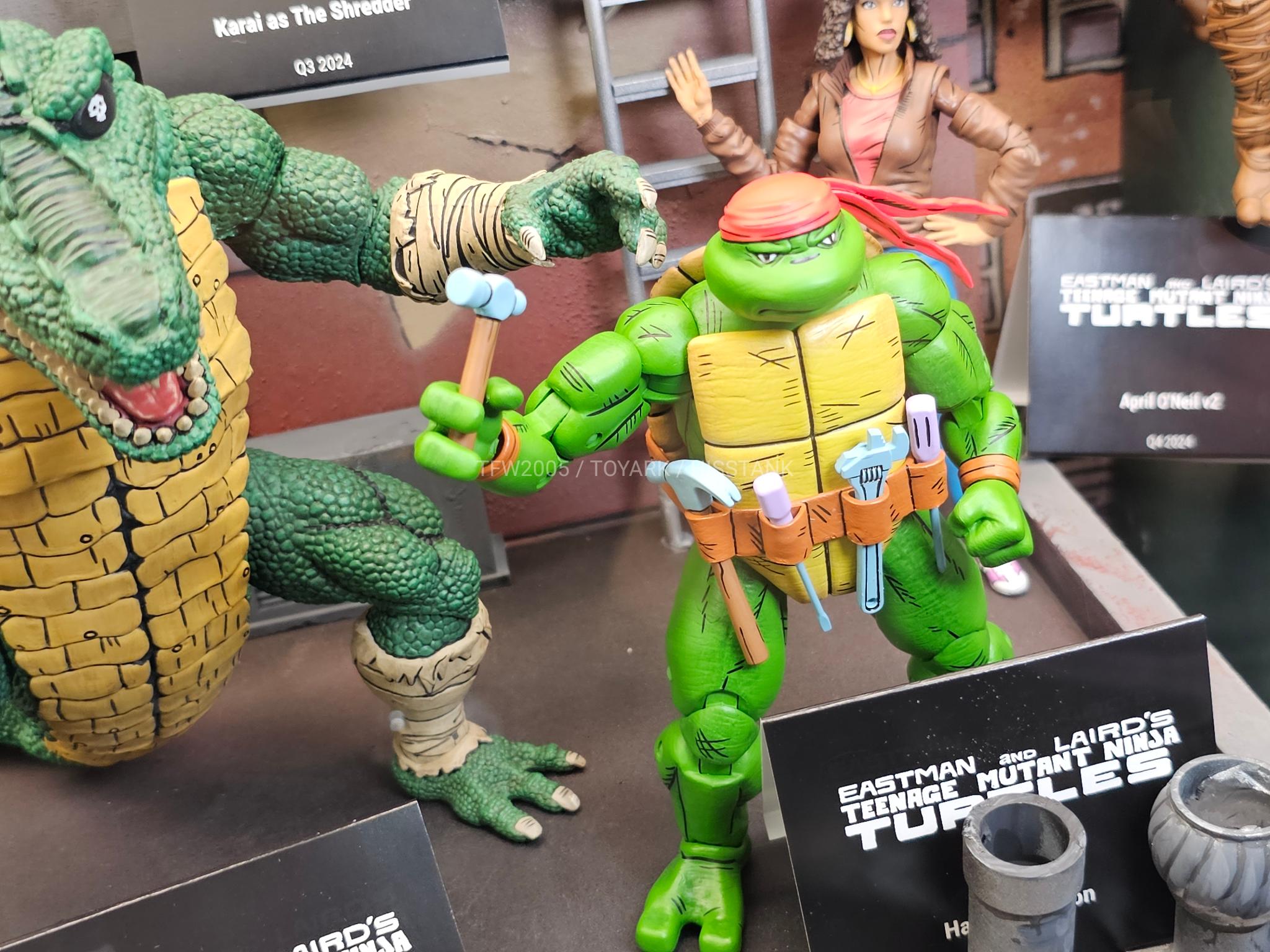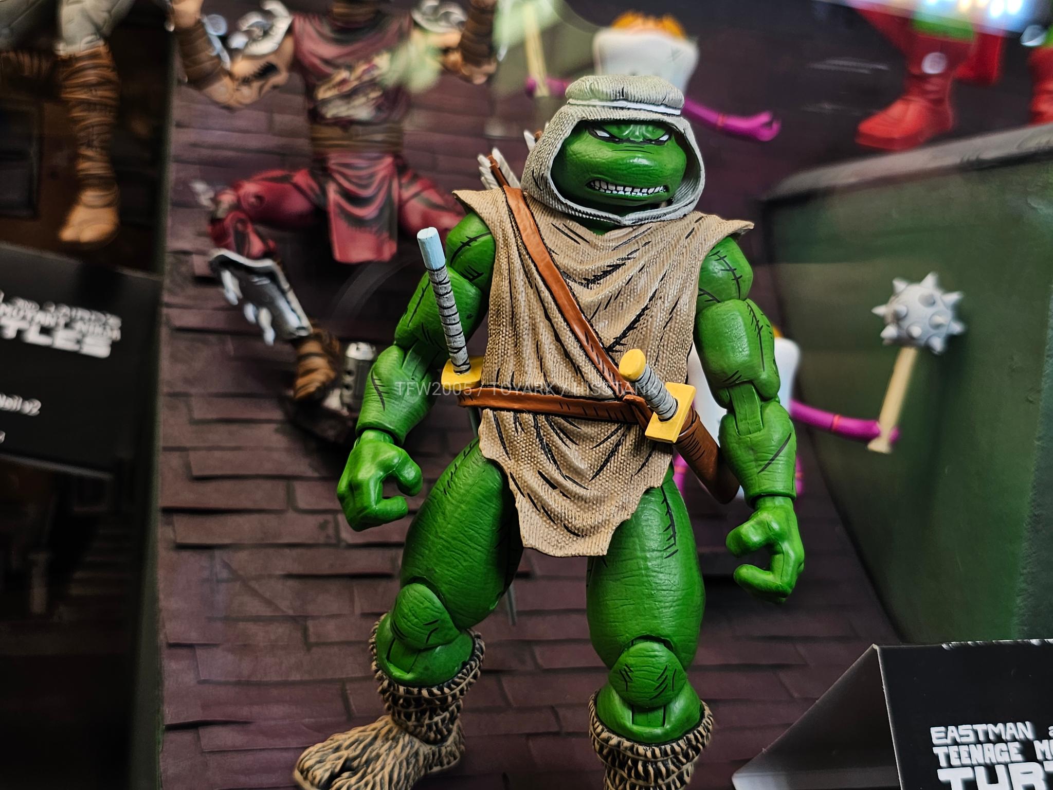 Mais le stand de NECA regorge de nouvelles figurines ! Une nouvelle version pour April, enfin un nouveau Foot d’élite, inspiré de l’arc City at war, de meilleurs visuels pour le très attendu et colossal Leatherhead (qui devrait avoir deux têtes interchangeables), une version color classics pour le Battle Damaged Shredder, sorti l’année dernière dans ses tons bleutés. Et de nouvelles tortues ! Celles-ci sont inspirées de plusieurs comics différents. Super Turtle (Michelangelo), Hunter Leo et un Donatello bricoleur (TMNT (Vol. 1) #12). Enfin, un Old Man Raphael assez particulier, qui ne vient pas directement des publications TMNT de Mirage, mais du Puma Blues #20 (édité chez Mirage et canonique à l’ongoing des tortues).