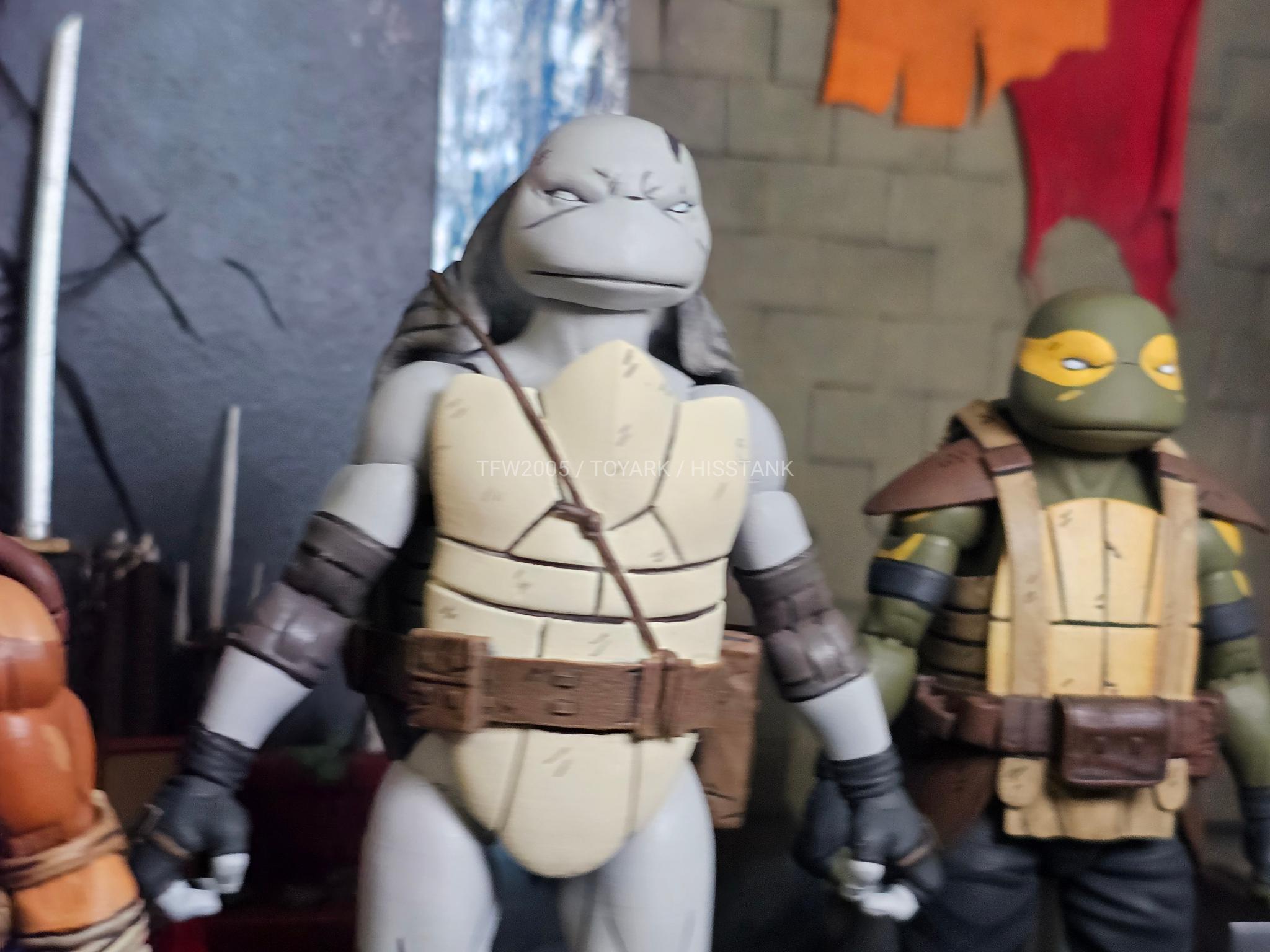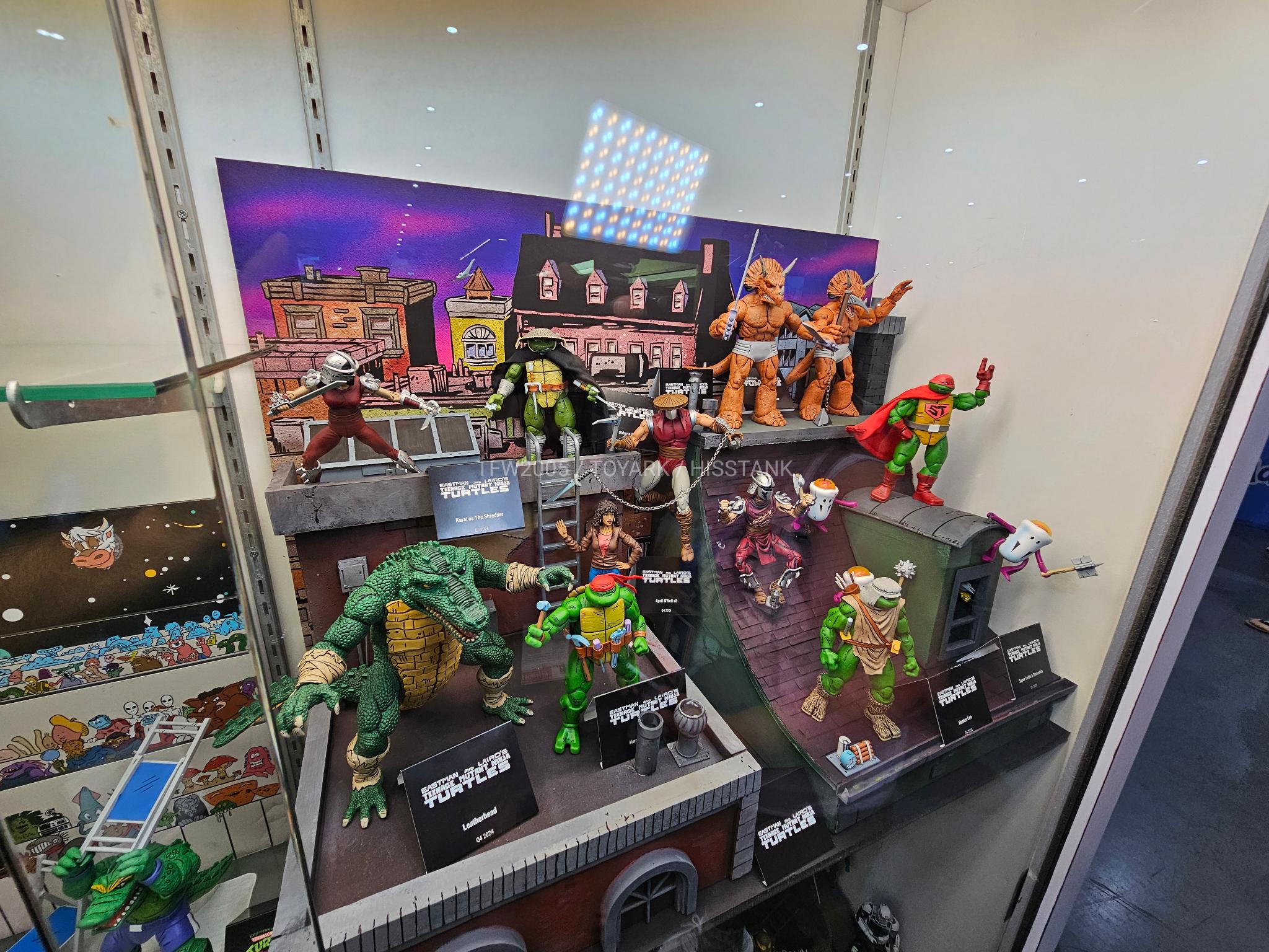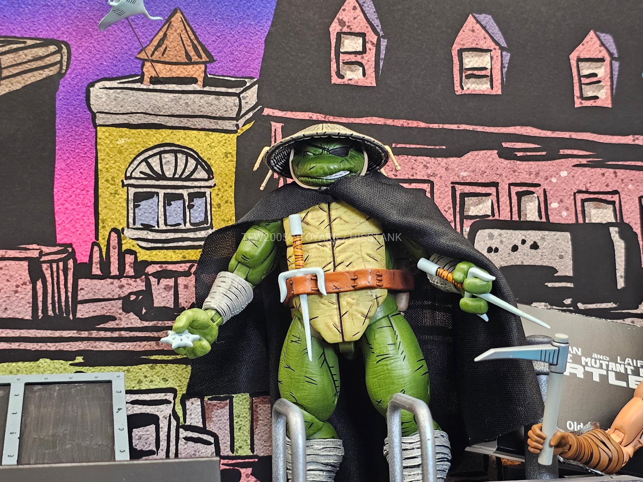 Mais le stand de NECA regorge de nouvelles figurines ! Une nouvelle version pour April, enfin un nouveau Foot d’élite, inspiré de l’arc City at war, de meilleurs visuels pour le très attendu et colossal Leatherhead (qui devrait avoir deux têtes interchangeables), une version color classics pour le Battle Damaged Shredder, sorti l’année dernière dans ses tons bleutés. Et de nouvelles tortues ! Celles-ci sont inspirées de plusieurs comics différents. Super Turtle (Michelangelo), Hunter Leo et un Donatello bricoleur (TMNT (Vol. 1) #12). Enfin, un Old Man Raphael assez particulier, qui ne vient pas directement des publications TMNT de Mirage, mais du Puma Blues #20 (édité chez Mirage et canonique à l’ongoing des tortues).