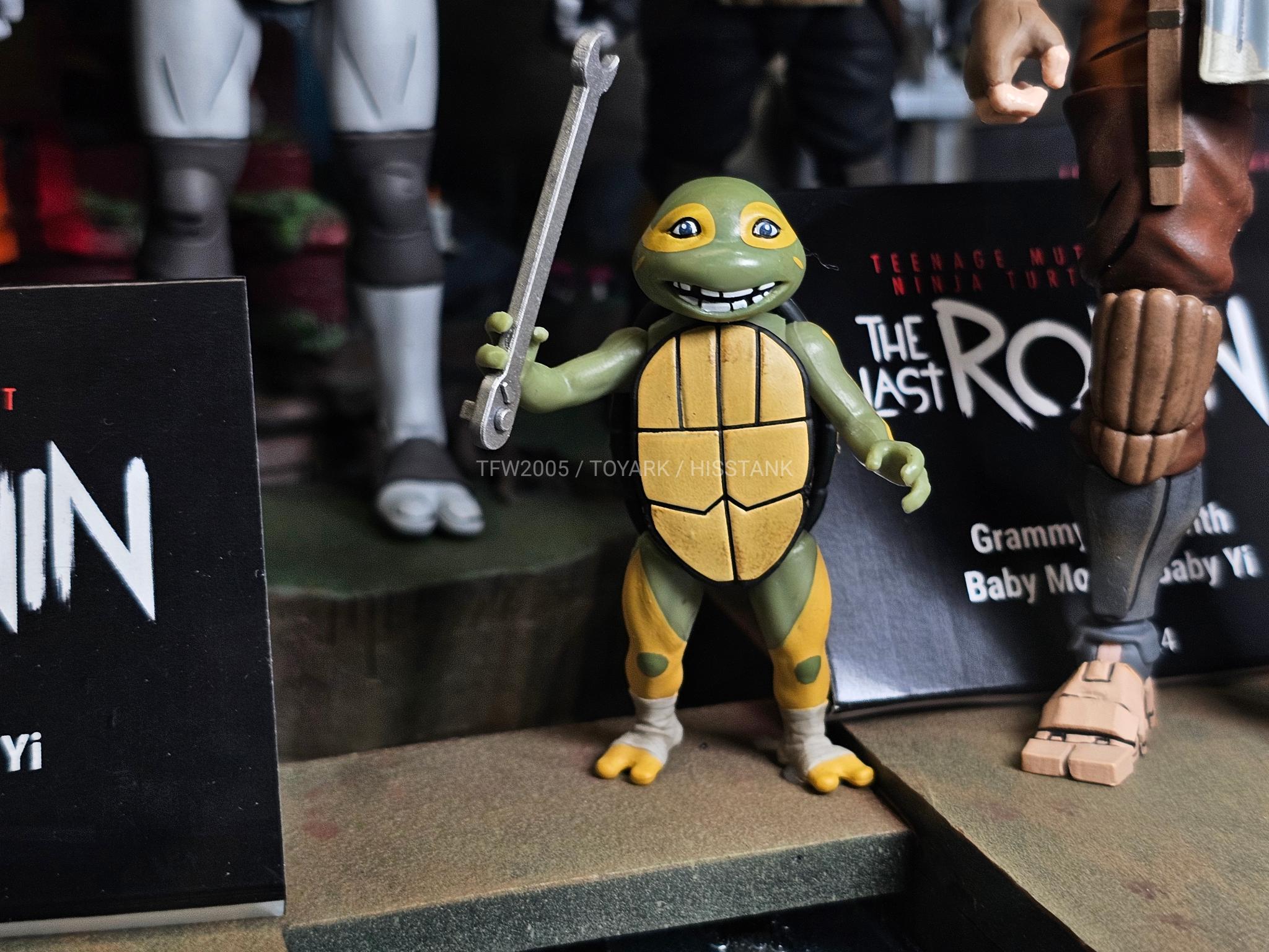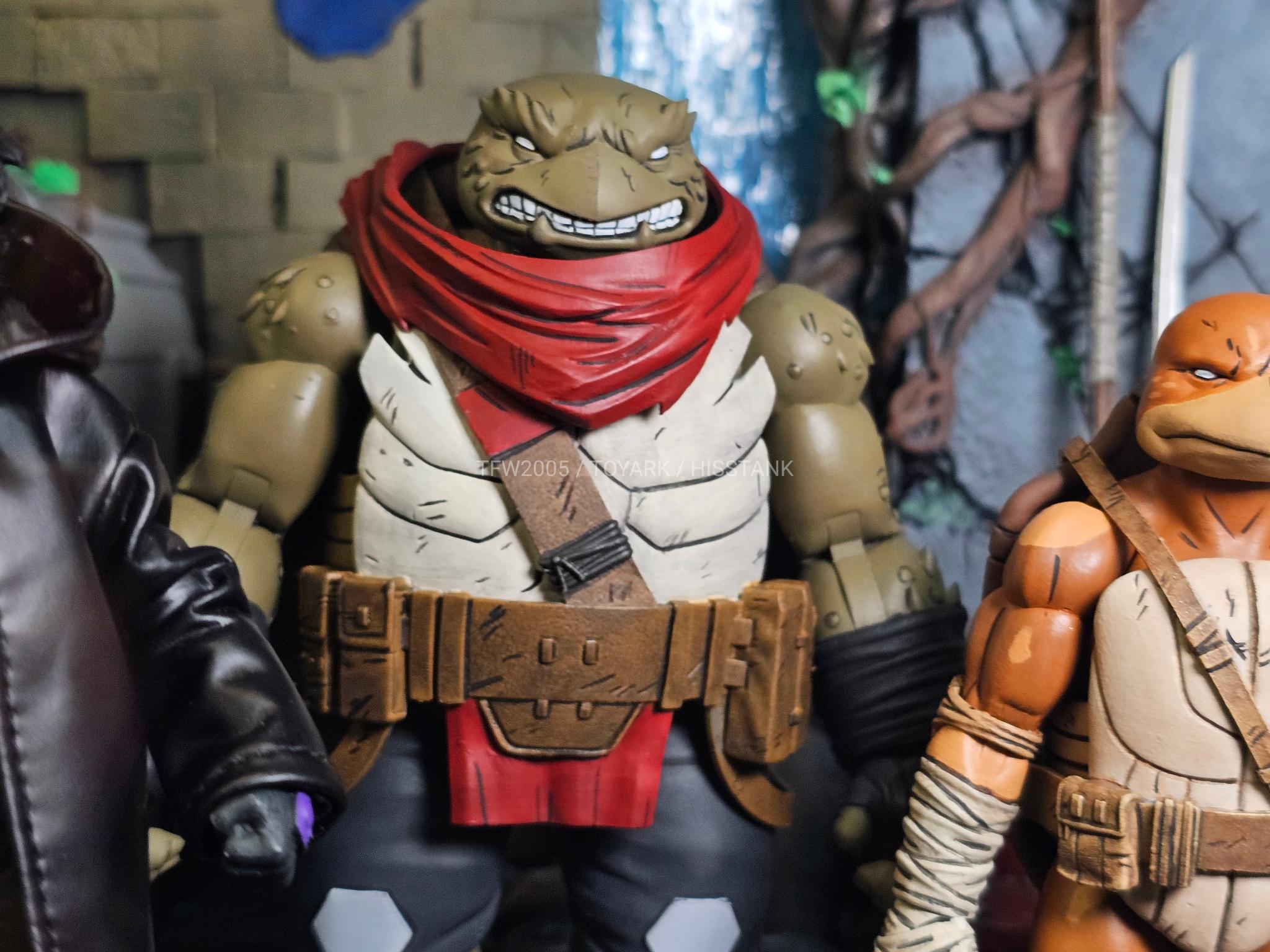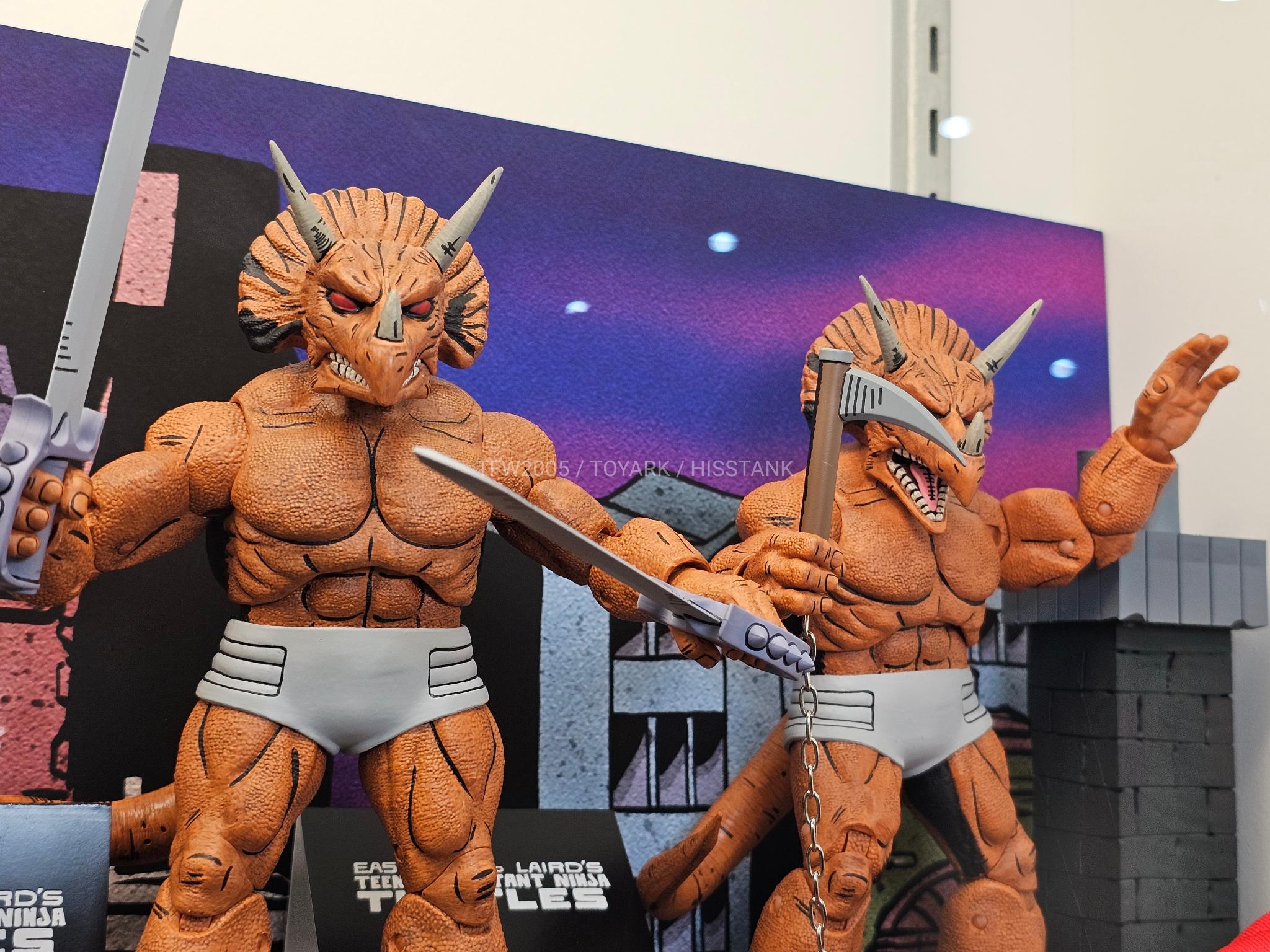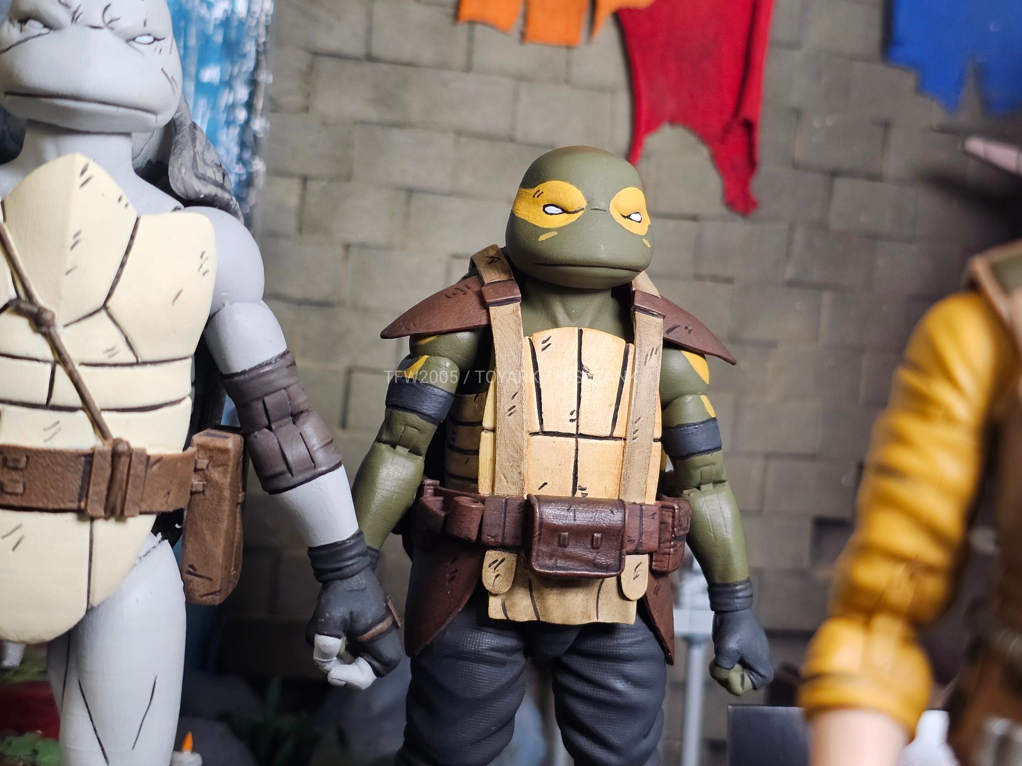 Mais le stand de NECA regorge de nouvelles figurines ! Une nouvelle version pour April, enfin un nouveau Foot d’élite, inspiré de l’arc City at war, de meilleurs visuels pour le très attendu et colossal Leatherhead (qui devrait avoir deux têtes interchangeables), une version color classics pour le Battle Damaged Shredder, sorti l’année dernière dans ses tons bleutés. Et de nouvelles tortues ! Celles-ci sont inspirées de plusieurs comics différents. Super Turtle (Michelangelo), Hunter Leo et un Donatello bricoleur (TMNT (Vol. 1) #12). Enfin, un Old Man Raphael assez particulier, qui ne vient pas directement des publications TMNT de Mirage, mais du Puma Blues #20 (édité chez Mirage et canonique à l’ongoing des tortues).