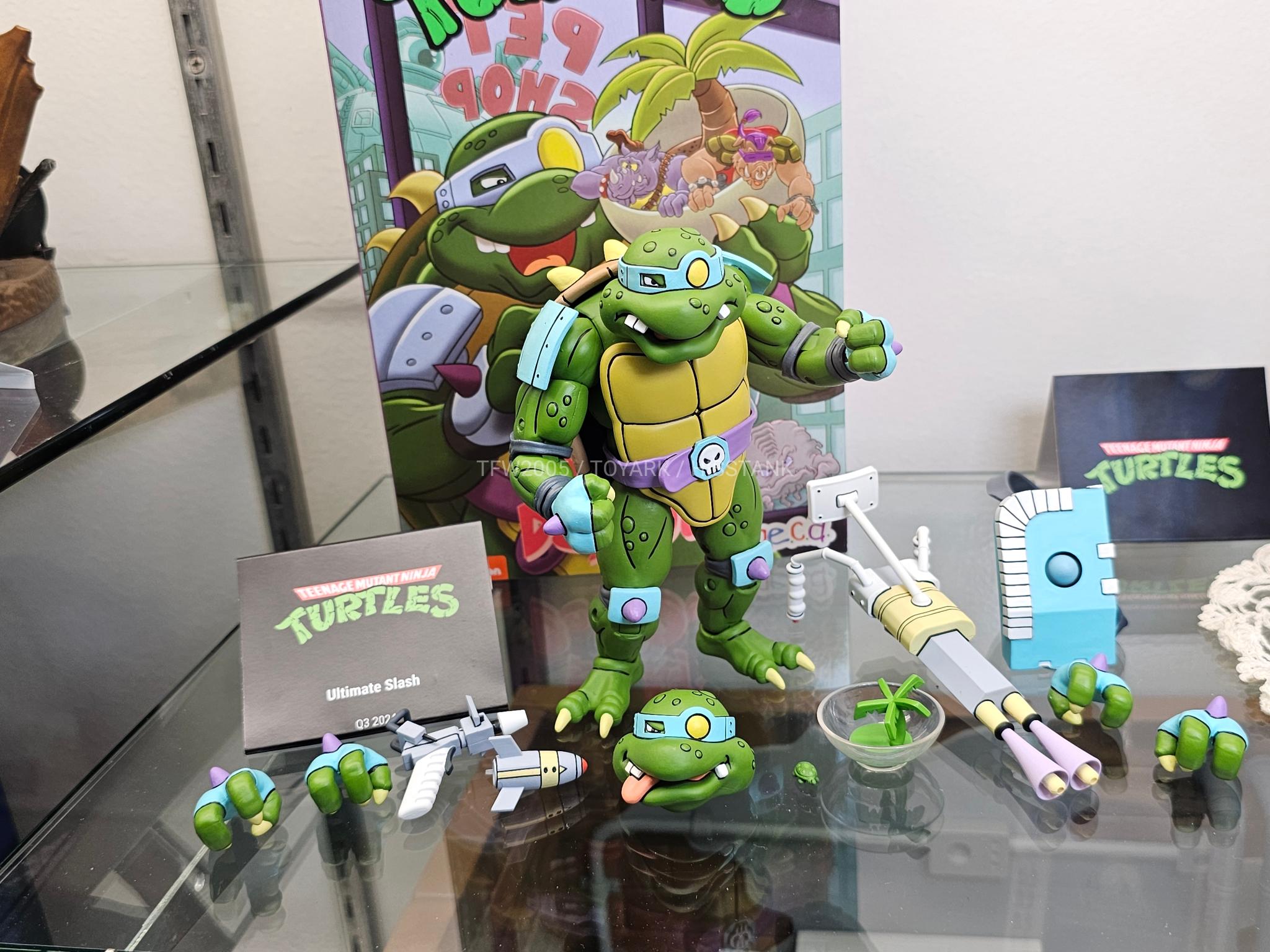 L’autre excellente nouvelle, cette fois inédite, est l’arrivée prochaine d’un Ultimate Slash. Cette nouvelle me réjoui au plus haut point. Il faut dire que le Slash que NECA avait proposé en 2020 était l’une des pires figurines jamais proposées par le fabricant. Peut-être car NECA ignorait le succès qu’allait avoir sa gamme de figurines par la suite ? C’était une figurine paresseuse et loin d’être fidèle à la tortue mutante. Ce nouveau Slash s’inspire grandement de la sculpture du Slash des TMNT Adventures, qui est excellente. Ou encore de Tokka. Le visage et les accessoires sont refaits pour mieux coller aux épisodes.