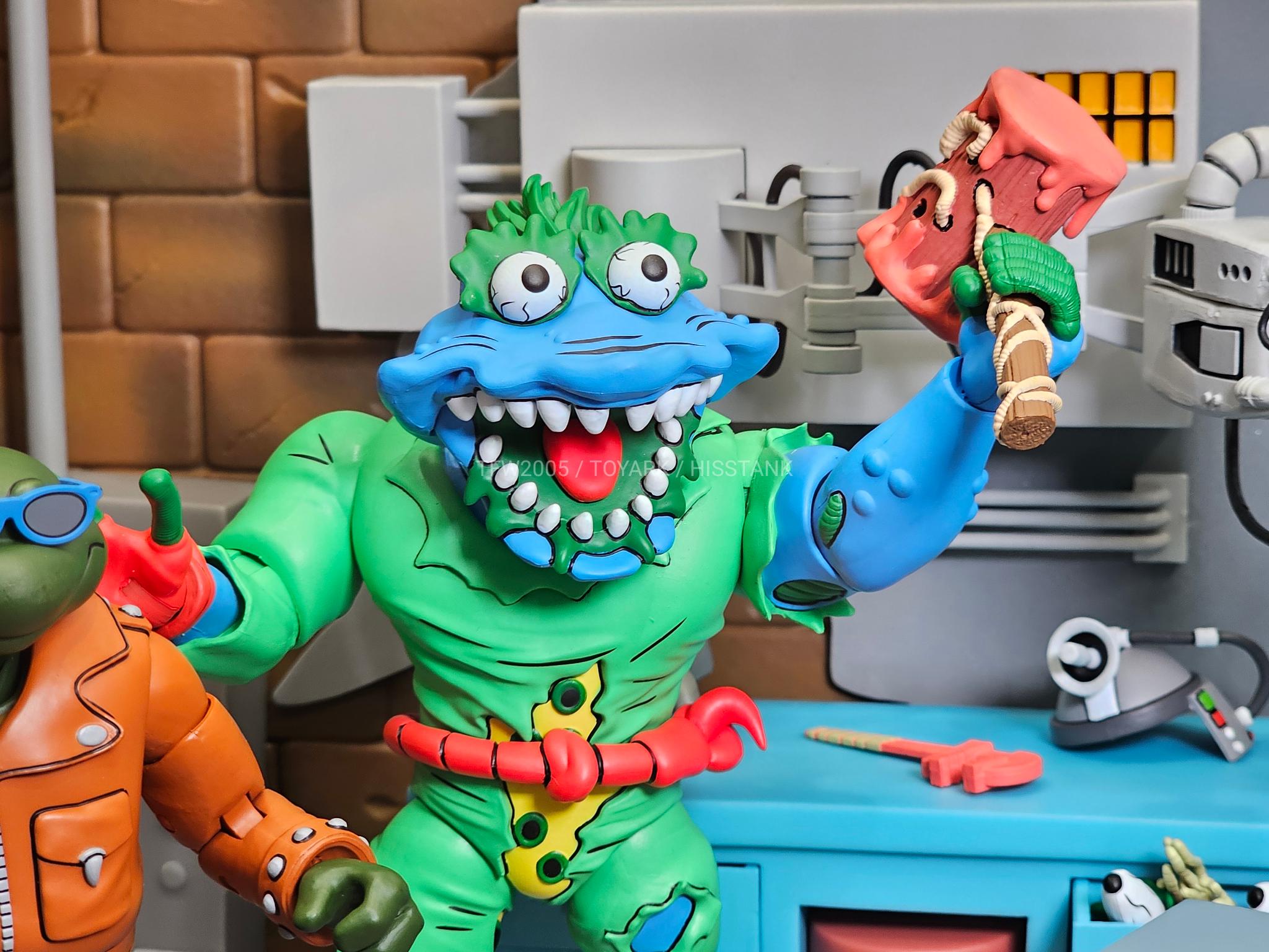 La figurine du handyman Donatello sera accompagnée d’une machine à écrire, visible dans une petite fenêtre dans le coin inférieur droit du diorama de NECA. Nous y voyons également l’un des monstres de Kirby avec une toute nouvelle peinture. Aucune information le concernant hélas. La Super Turtle possèdera deux têtes interchangeables et viendra quant à elle avec deux Domoïds, une version intacte et l’autre au crâne défoncé.