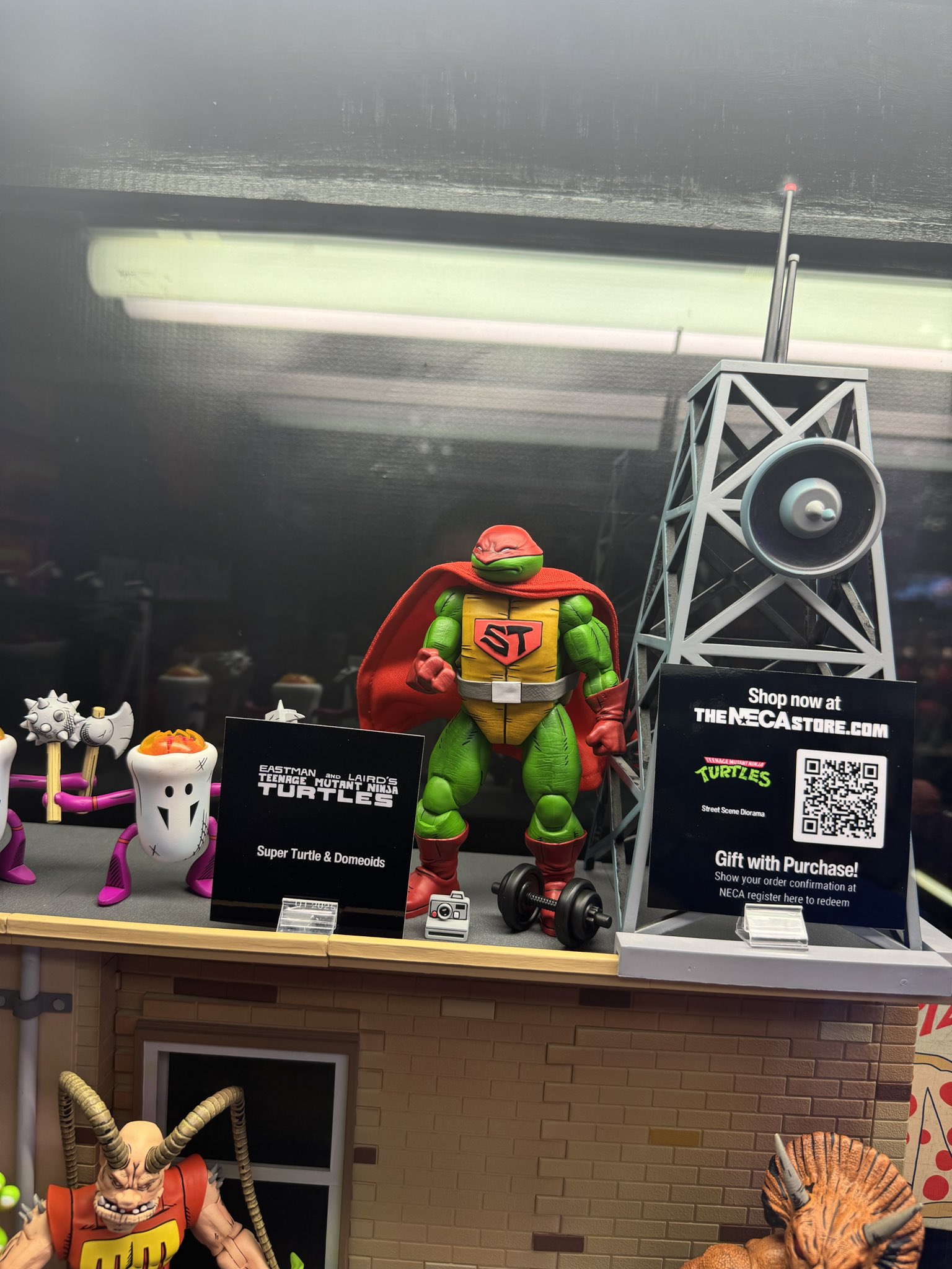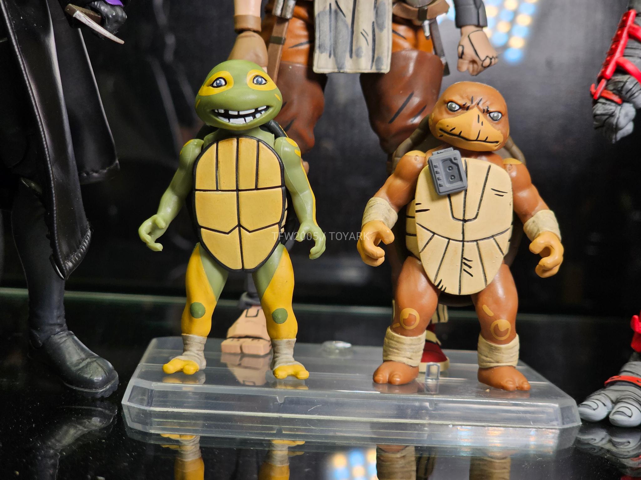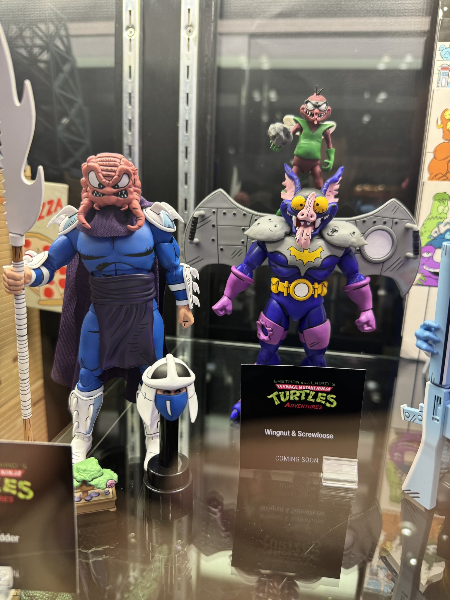 Autre personnage présenté lors de la conférence de l’été dernier, Ace Duck. Le canard catcheur intergalactique est enfin visible sur le stand de NECA, brandissant un Raphael bien mal barré. Parmi les surprises attendues par les fans, Wingnut et Screwloose ! Le duo instable introduit dans le TMNT A. #8 complètera enfin le groupe des Mighty Mutanimals déjà bien développé. Le moustique possède même une pierre à balancer sur la première baie vitrée qu’il trouve !