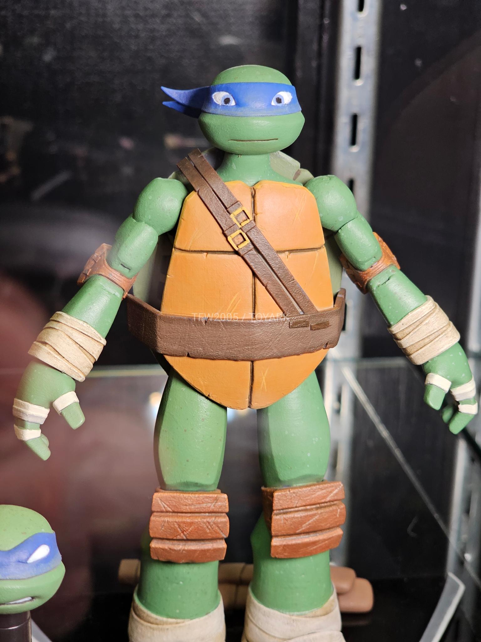Nous voici avec Leonardo et Michelangelo, accompagnés d’un grand nombre d’accessoires propres à chacun. Notons la présence notamment de trois têtes interchangeables. Et une peinture remarquable. Espérons qu’elle soit toujours présente sur les versions finales, et qu’il ne s’agisse pas de test shots très bien finis.