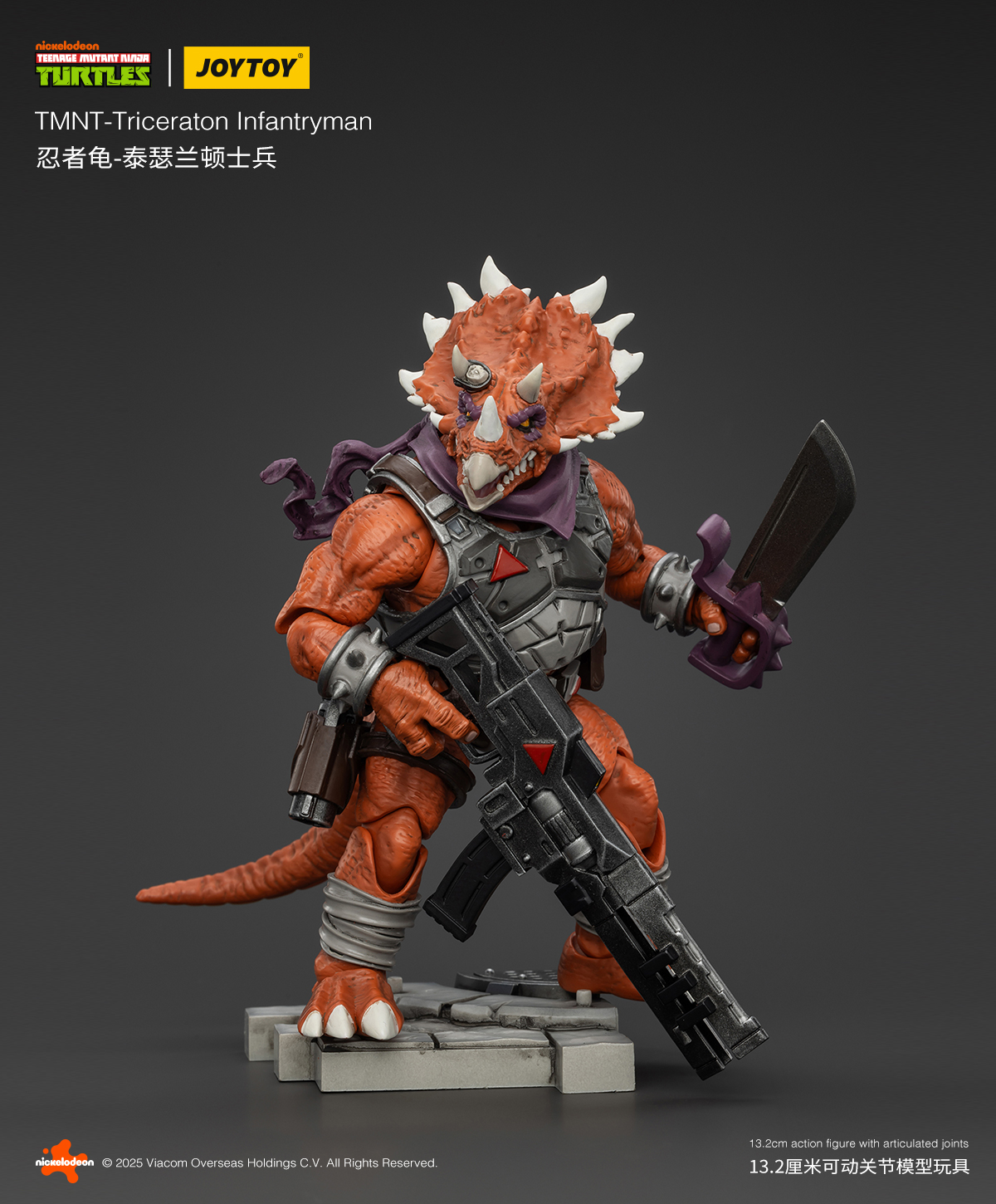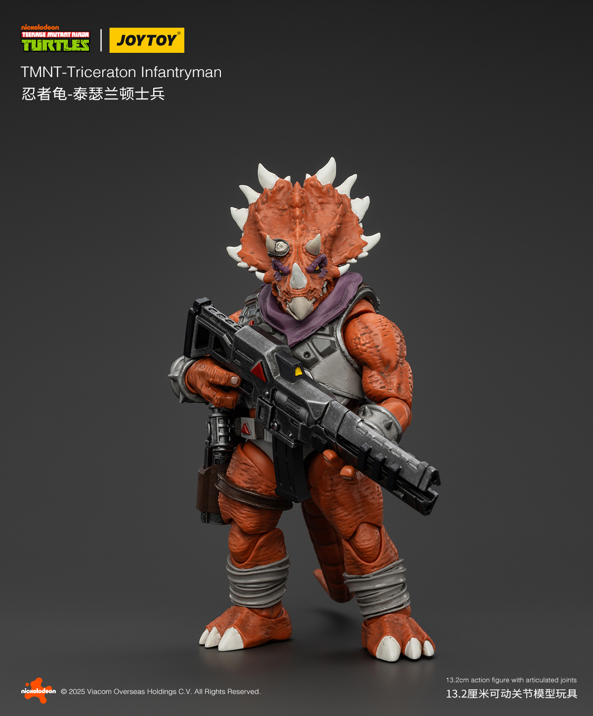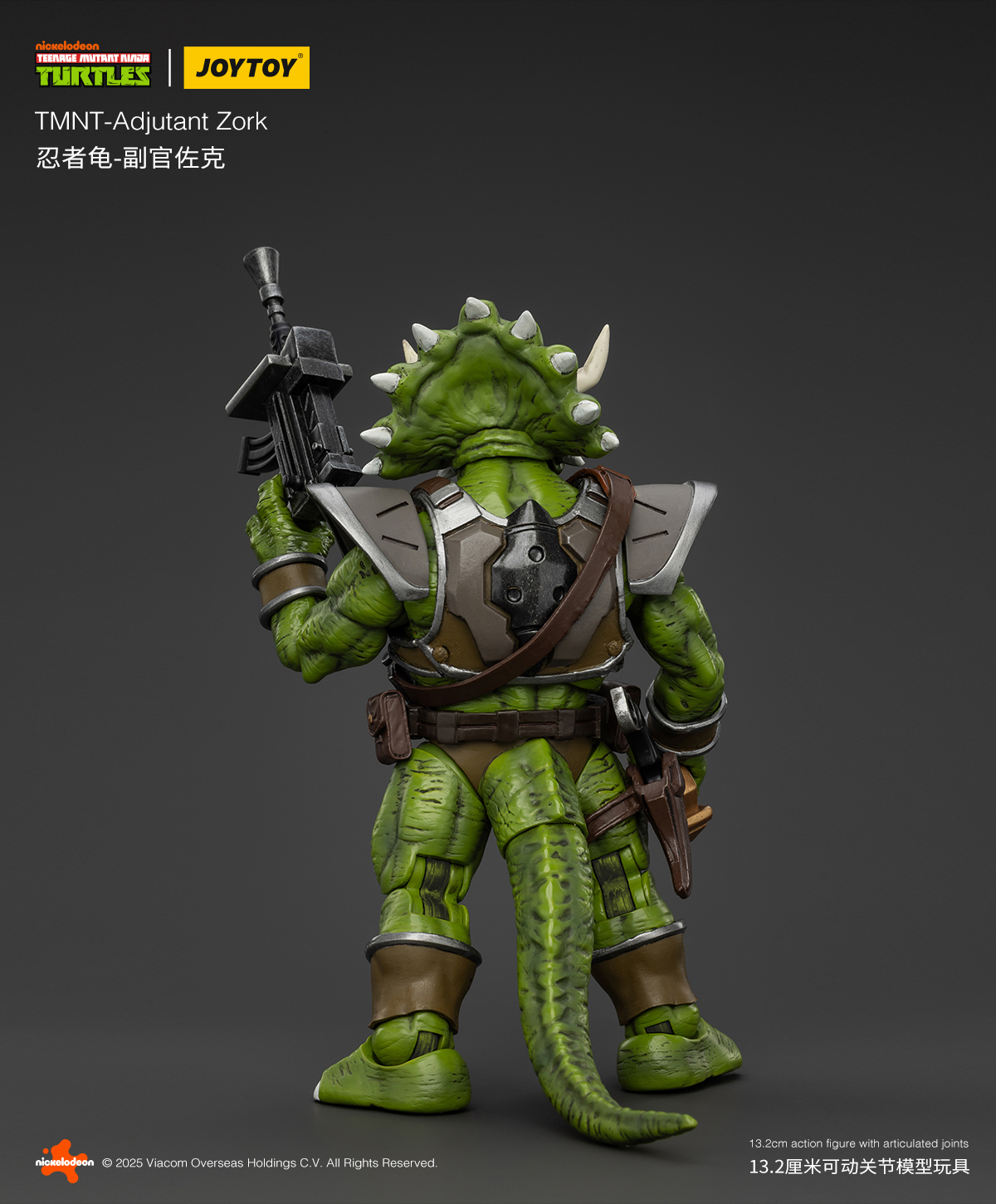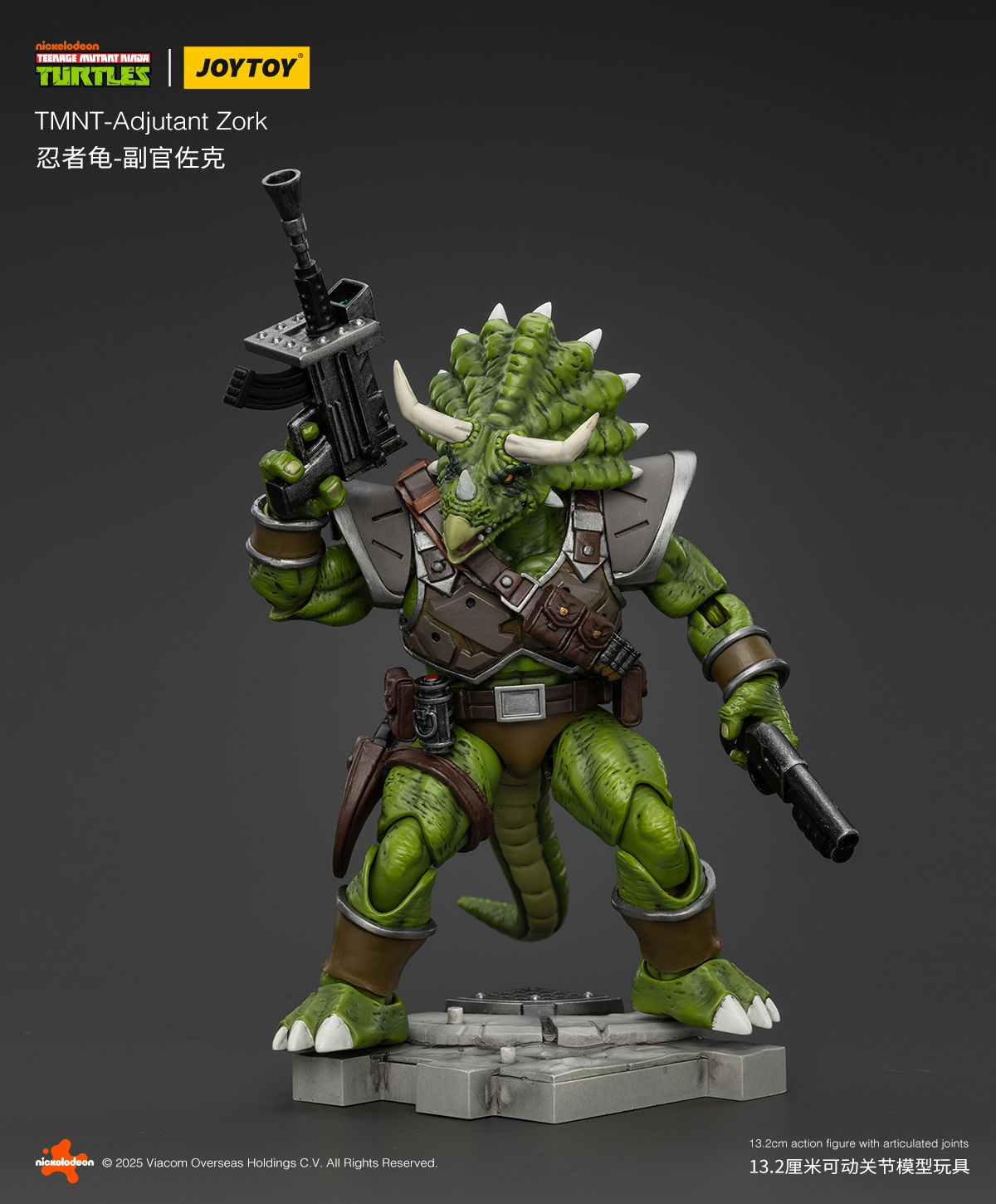 Toujours inspiré par le dessin animé de 1987, cette fois JoyToy esquisse également la même stratégie que NECA, à savoir reprendre la sculpture d’un personnage pour le démultiplier. Et si cela était déjà le cas pour les figurines précédentes, cela se ressent un petit peu trop avec les triceratons. Leur sculpture est impeccable et fidèle au style novateur du fabricant. Des détails incroyables, des articulations qui semblent à la hauteur. Hélas ils sont allés jusqu’à reprendre les accessoires fournis avec Zarax et Zork de NECA, à savoir une mitraillette lourde (qui en réalité est celle qui a été confiée au triceraton de Playmates de 1990, à l’origine pour Bebop) et le fusil laser interprété ici comme lance-roquette.