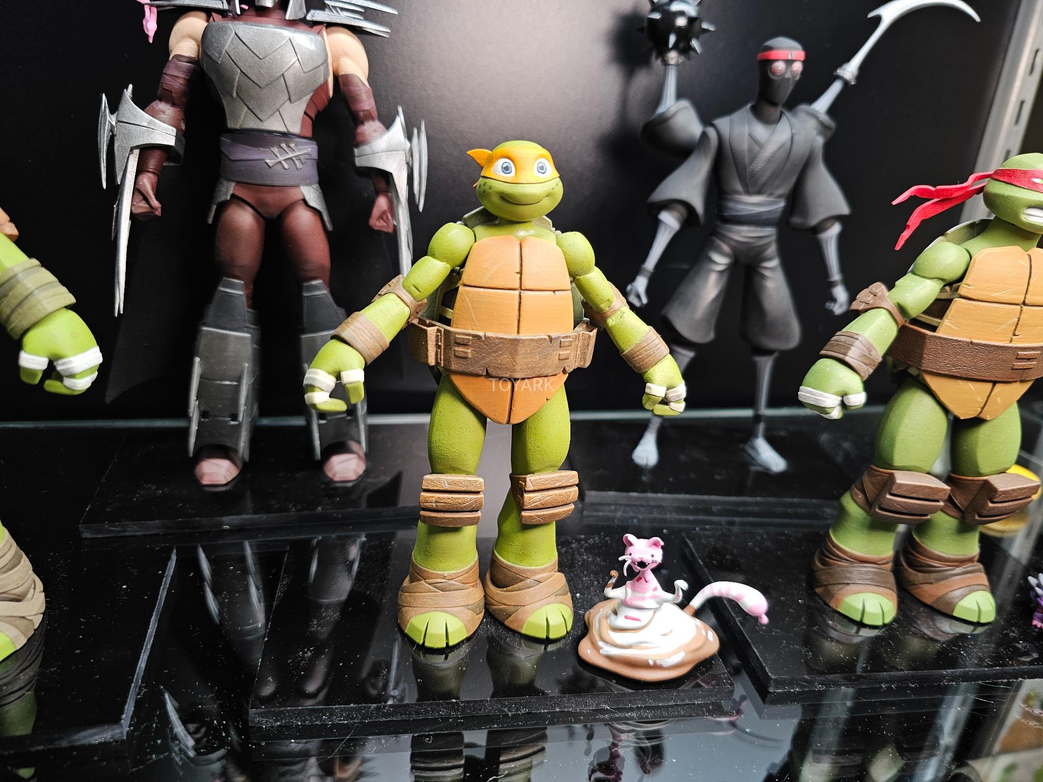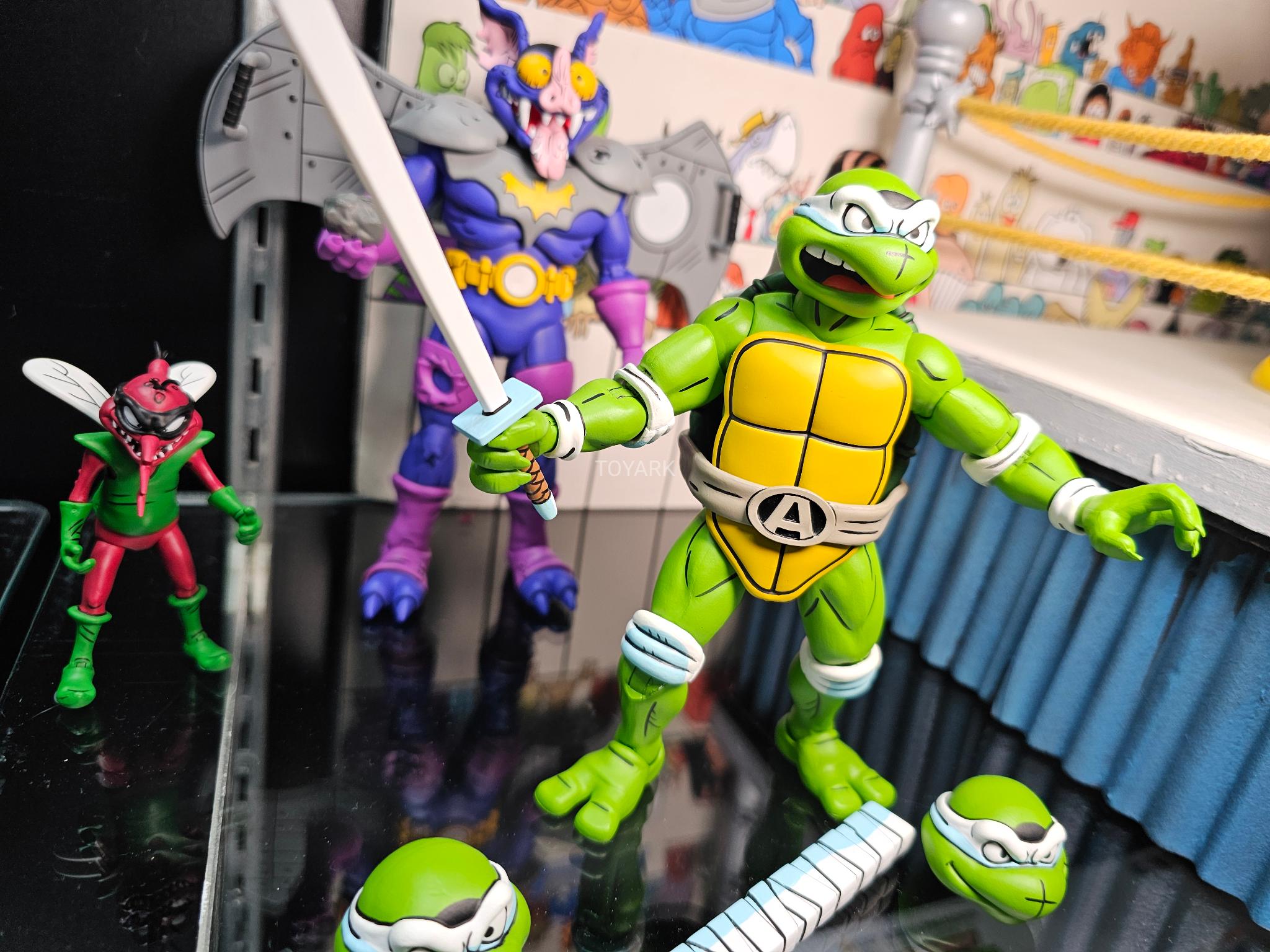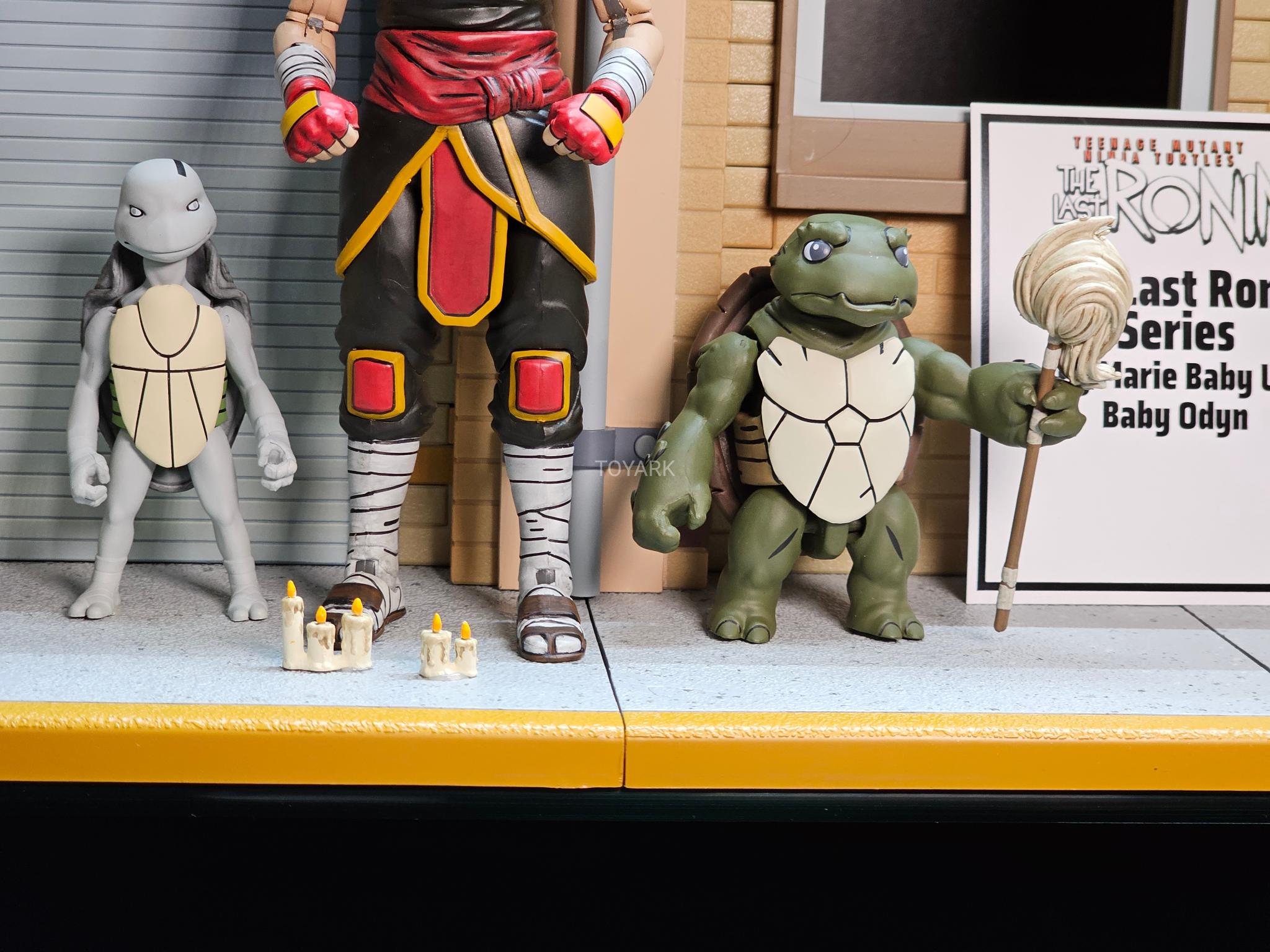 Nous retrouvons les quatre tortues, ainsi que Shredder et un kraang, un ninja Foot et un Foot-bot. Nous pouvons également voir la masse de Slash, qui sera probablement une des prochaines figurines à être annoncées. Des personnages secondaires ont également l’air d’accompagner les figurines. Michelangelo retrouve ainsi Ice Cream Kitty, Donatello son fidèle acolyte le Dr. Cluckingsworth et Raphael sera accompagné de Chompy Picasso. Là encore, Spike semble être destiné à Slash pour faire de la place à l’enfant de Tokka ! Quid de Shredder, si le kraang l’accompagne de la même manière ou s’il est là pour teaser l’arrivée des kraangdroids ?