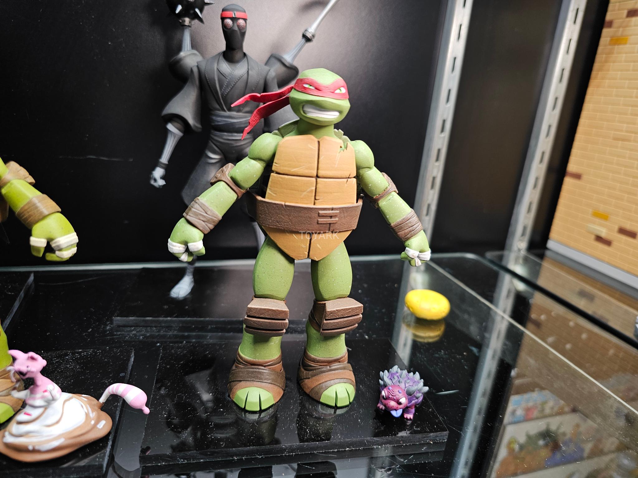 La figurine de Michelangelo possèdera plusieurs accessoires, dont deux têtes interchangeables et une capuche amovible. Ses chaussures pourront être alternées entre normales ou avec crampons.