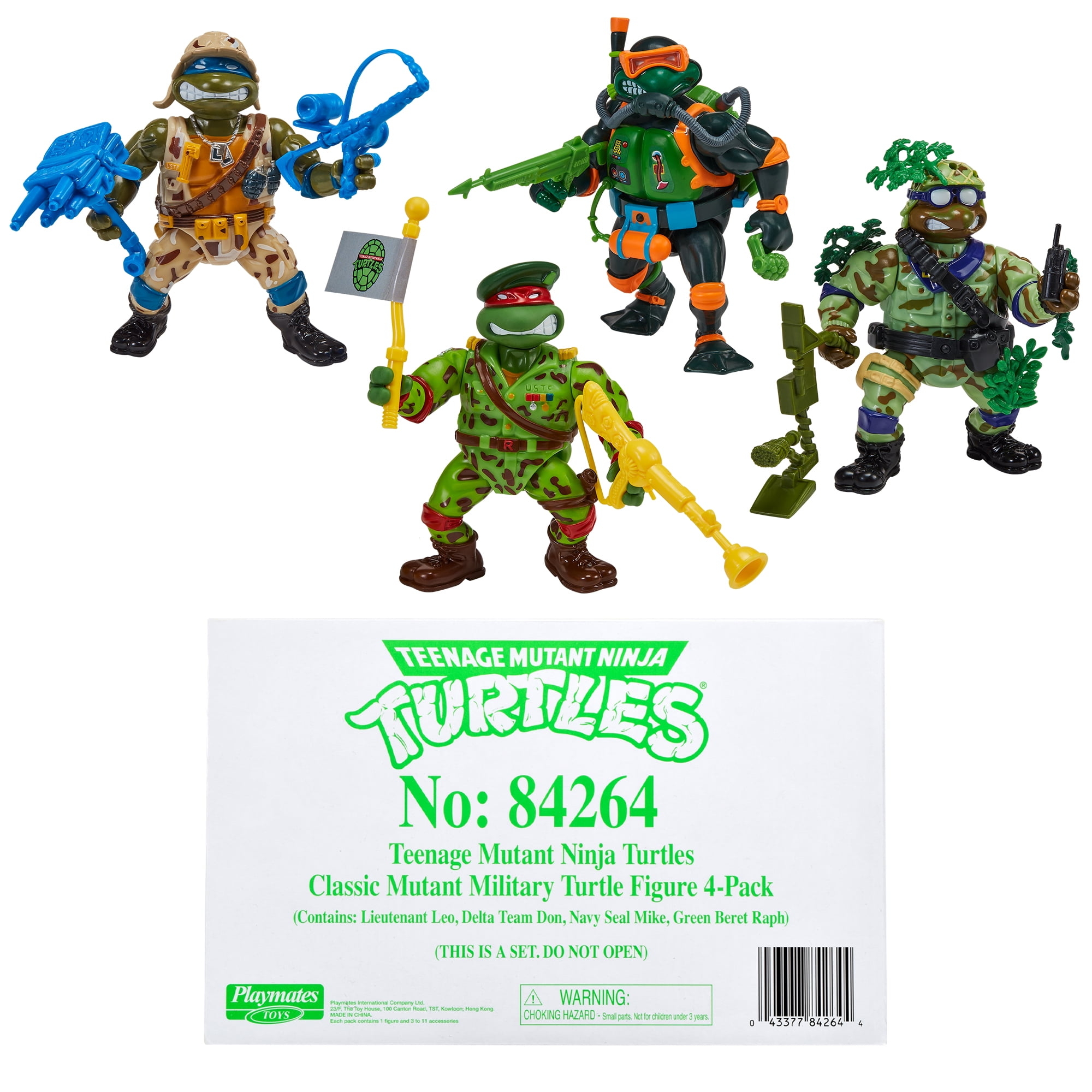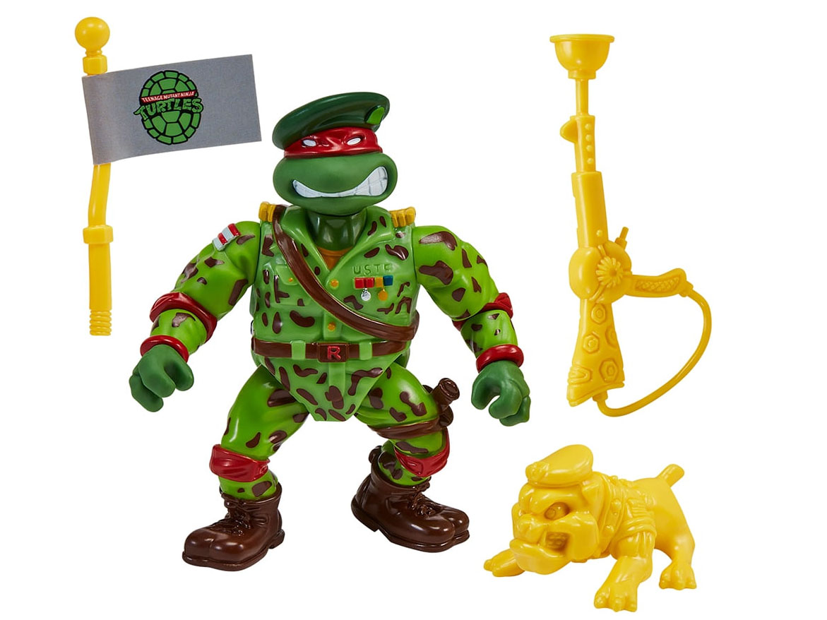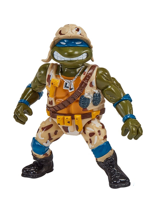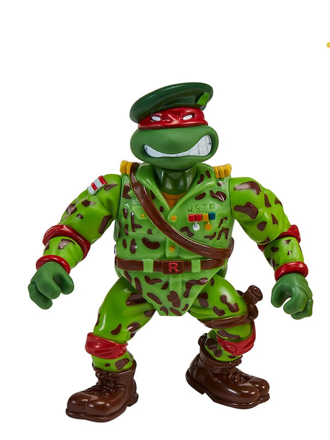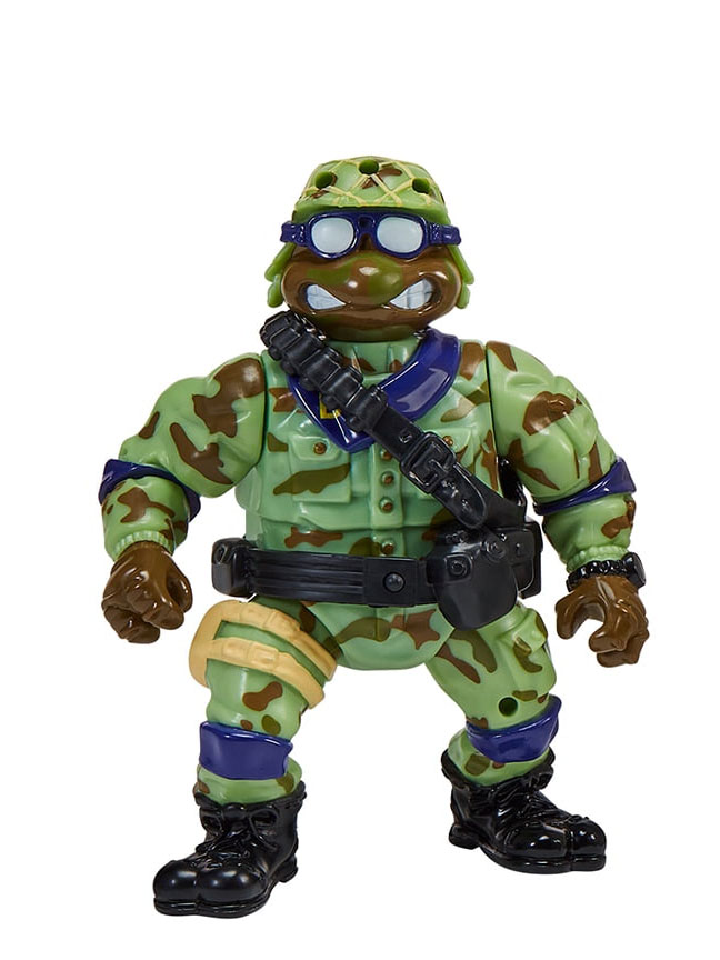 Du côté de Playmates, il s’agit du pack hommage aux Mutant Military de 1991 et de 1992. Le pack du nom de « Tales of The Teenage Mutant Ninja Turtles: Military Turtles Figure 4-Pack Bundle » est annoncé pour 45,97$ (voir la page). Ce pack est composé de Lieutenant Leo, Raph the green teen beret, Navy seal Mike et de Delta team Don. Si ces figurines sont des rééditions, nous retrouvons de petites différences à imputer à la perte de moules ou au contexte politique. Le drapeau des Etats-Unis laisse place à celui des tortues dans chaque blister. Par ailleurs, Donatello se voit attribuer un talkie-walkie à la place de sa mitraillette. Nous pouvons supposer que, comme parfois, le moule originale de l’arme a été perdu. Playmates a donc compensé cette lacune par un accessoire inédit.