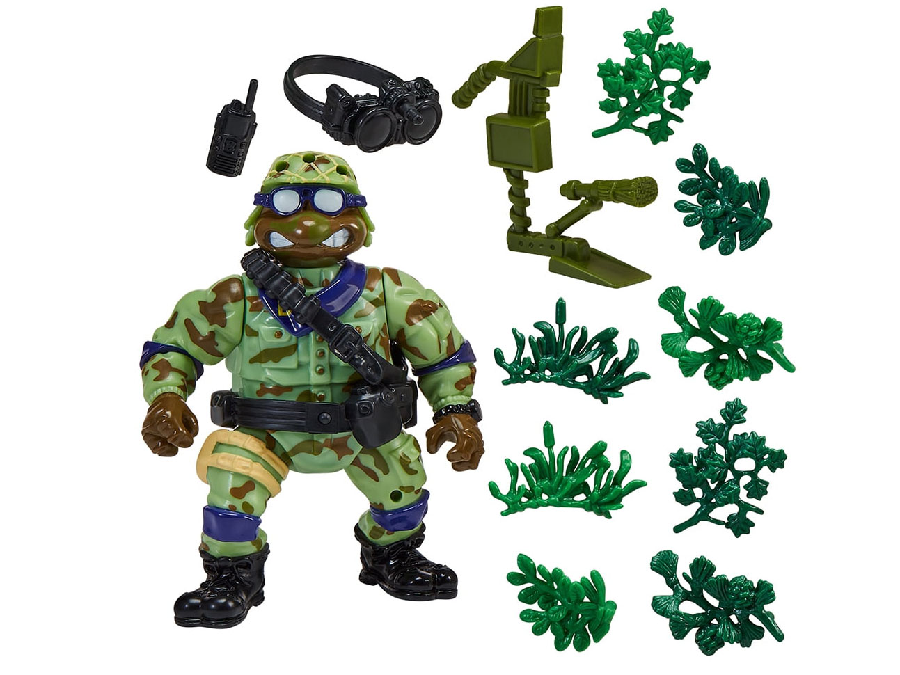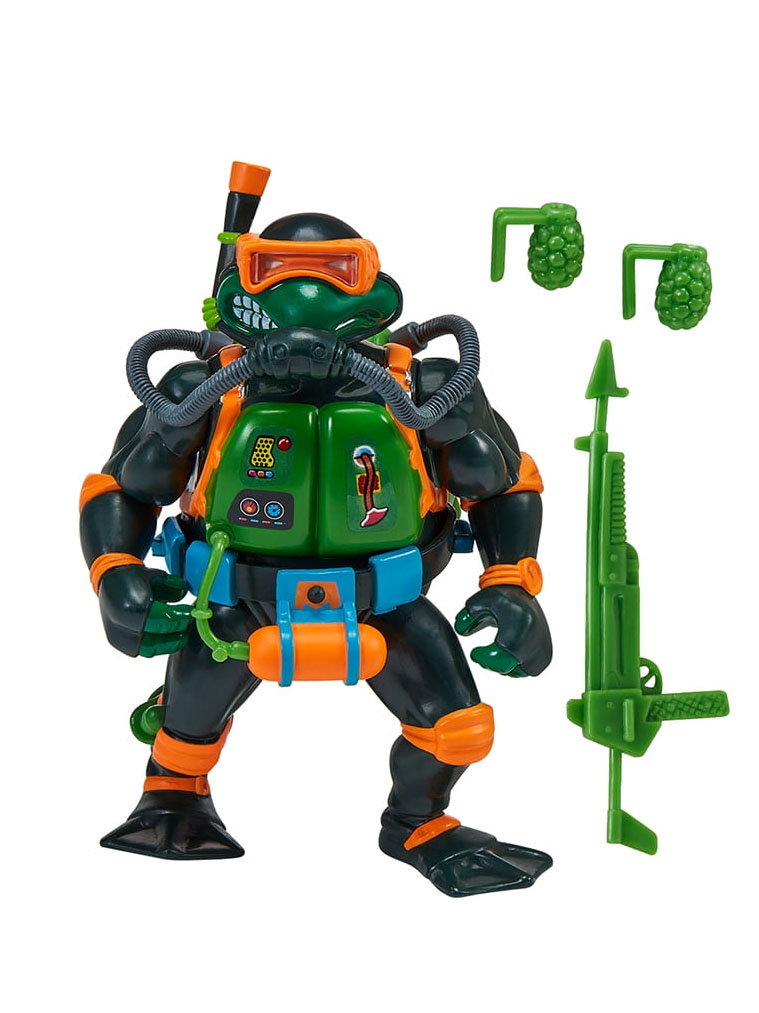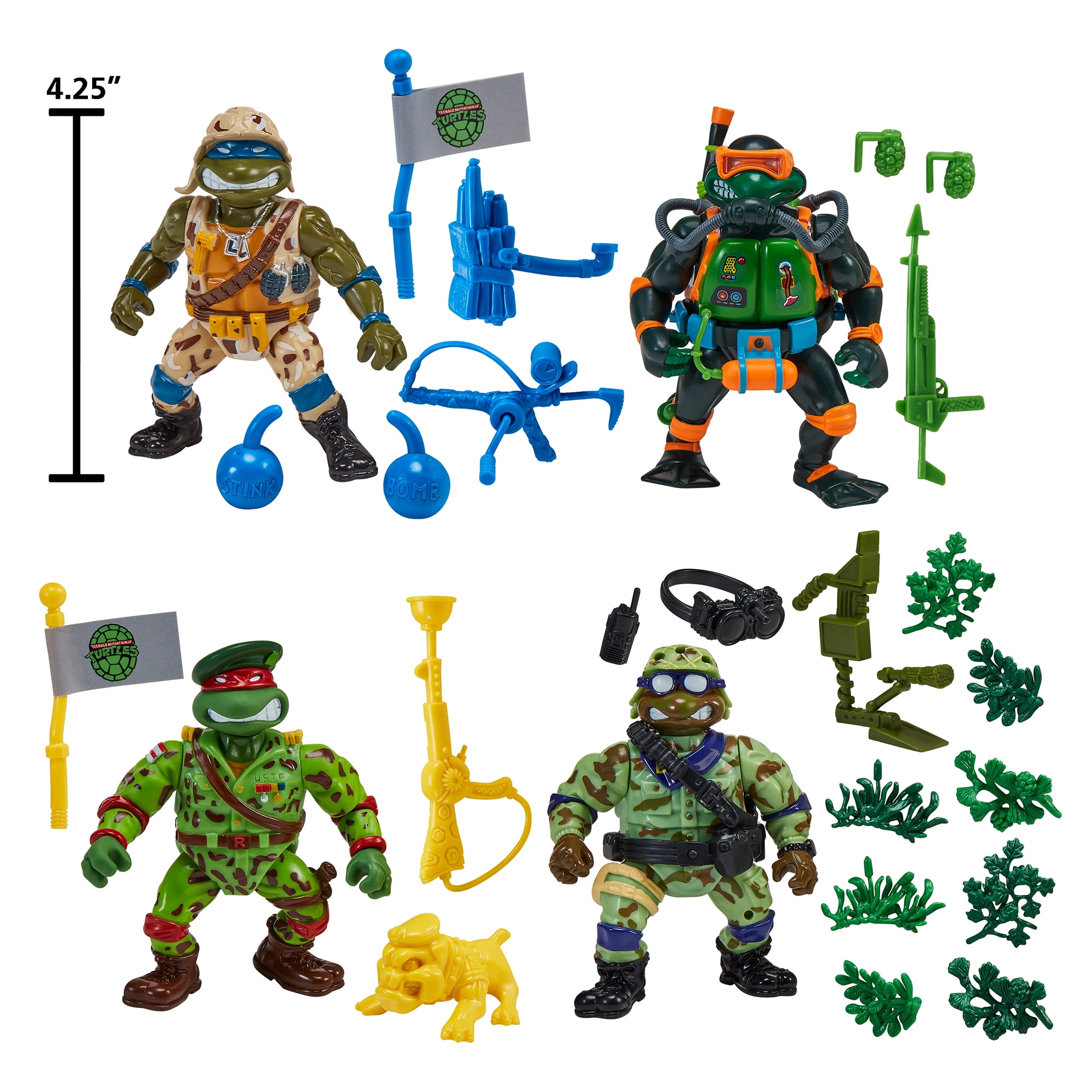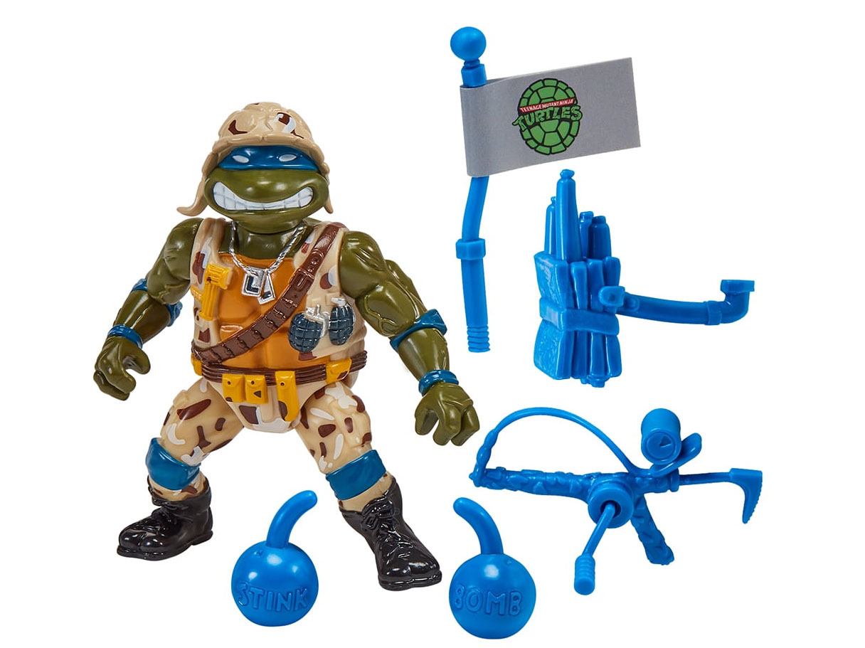 Du côté de Playmates, il s’agit du pack hommage aux Mutant Military de 1991 et de 1992. Le pack du nom de « Tales of The Teenage Mutant Ninja Turtles: Military Turtles Figure 4-Pack Bundle » est annoncé pour 45,97$ (voir la page). Ce pack est composé de Lieutenant Leo, Raph the green teen beret, Navy seal Mike et de Delta team Don. Si ces figurines sont des rééditions, nous retrouvons de petites différences à imputer à la perte de moules ou au contexte politique. Le drapeau des Etats-Unis laisse place à celui des tortues dans chaque blister. Par ailleurs, Donatello se voit attribuer un talkie-walkie à la place de sa mitraillette. Nous pouvons supposer que, comme parfois, le moule originale de l’arme a été perdu. Playmates a donc compensé cette lacune par un accessoire inédit.