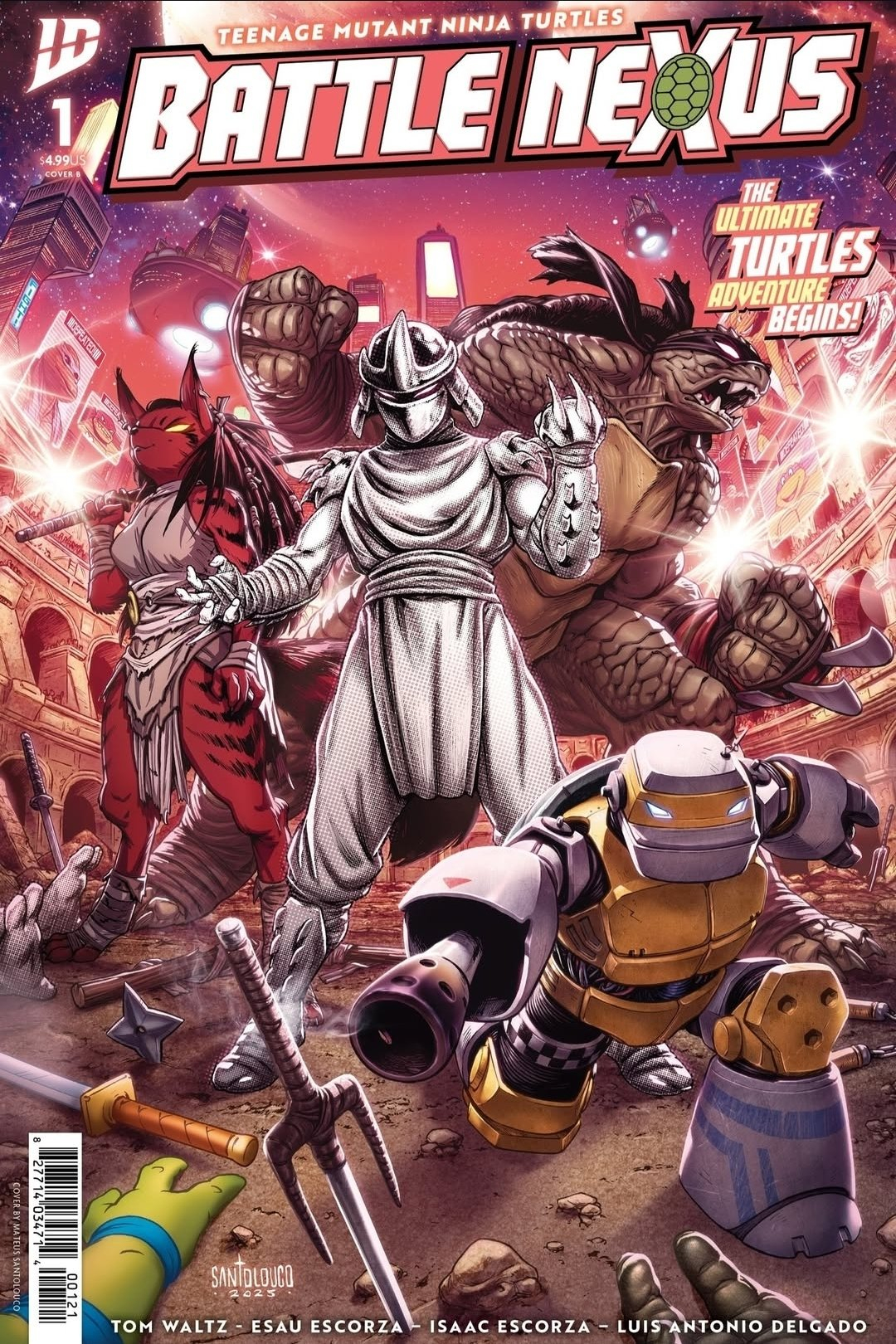 Côté combat, il semblerait que nous ayons droit à une bataille par numéro. Et si l’on en croit les couvertures, le premier numéro portera sur l’arrivée des personnages dans le Battle Nexus (dessiné par les frères Escorza). Ben Bishop se chargera du deuxième numéro, voyant s’affronter Leonardo et Shredder. Le quatrième numéro sera assuré par Omar Francia, qui illustrera la bataille entre Donatello et Metalhead. Sophie Campbell scénarisera très probablement le numéro avec Ninjara, qui va sans doute affronter Raphael. Et enfin, il serait logique de voir Michelangelo affronter son vieil ami Slash dans un combat déchirant.