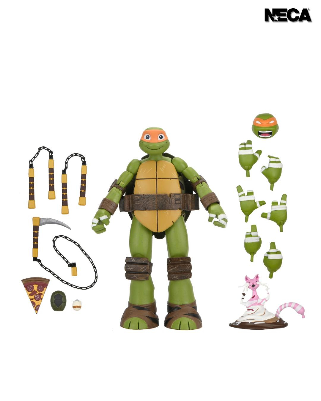 Chaque figurine est accompagnée d’un petit compagnon sauf Leonardo qui possède l’omni-désintégrateur à micro-fissions. De nombreuses paires de mains interchangeables sont également disponibles, les armes propres à chaque tortue et quelques accessoires supplémentaires comme les lunettes et le détecteur à mutagène de Donatello.