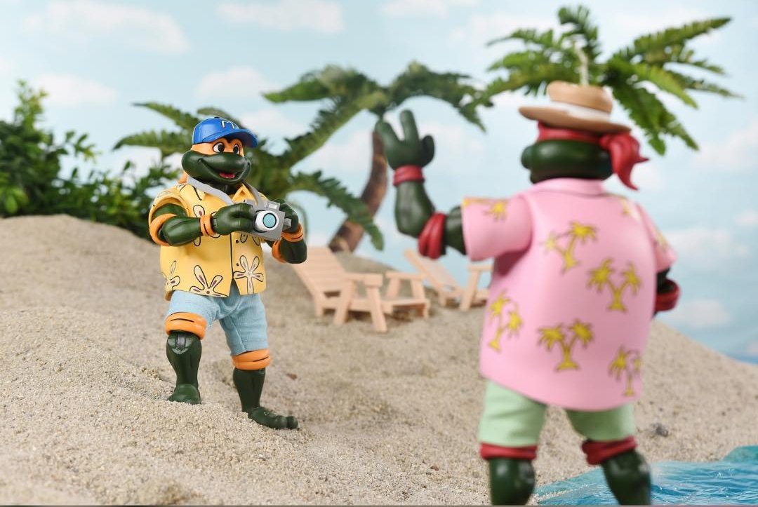 Les quatre tortues rappellent énormément le pack exclusif de la dernière Comic Con. Toutefois, les accoutrements sont légèrement différents. Trevor Zammit nous avait déjà confirmé que les équipes artistiques s’étaient bien inspirées d’épisodes spécifiques au dessin animé. Il voulait également faire un parallèle avec les figurines de Vacation Bebop et Vacation Rocksteady déjà sorties, inspirées elles des deux mutants de l’épisode Napoléon (S5 E9). Et comme nous l’avons vu à la SDCC 2025, Slash est également prévu !