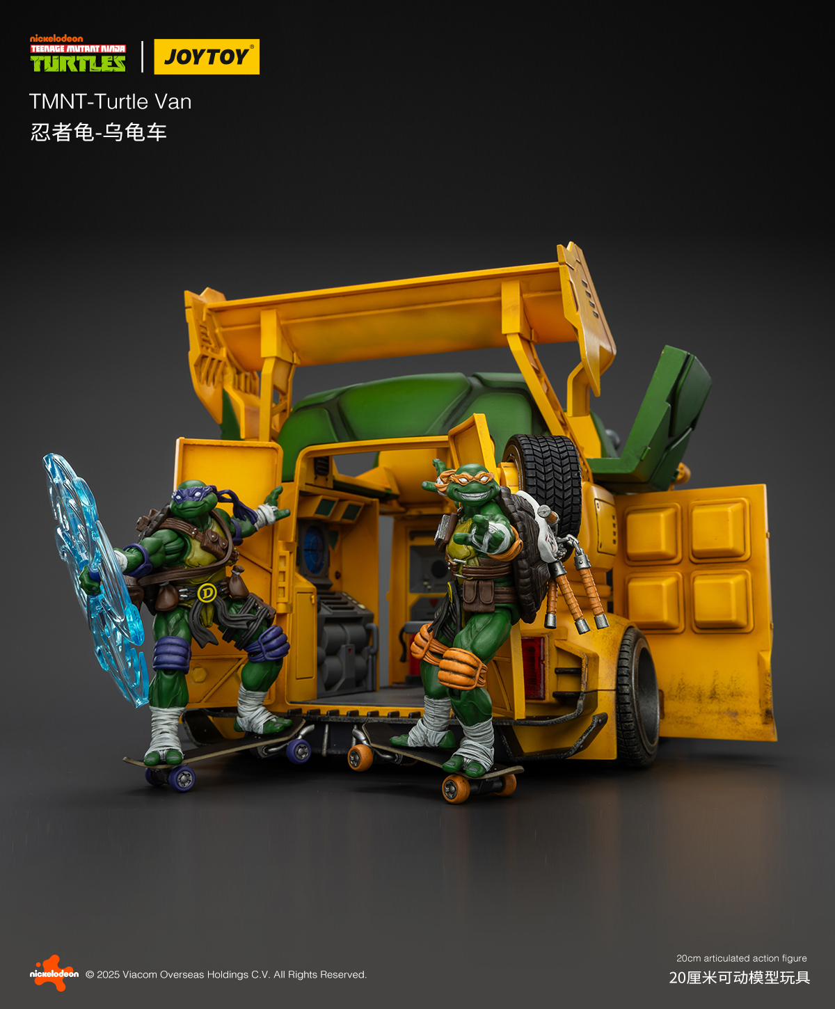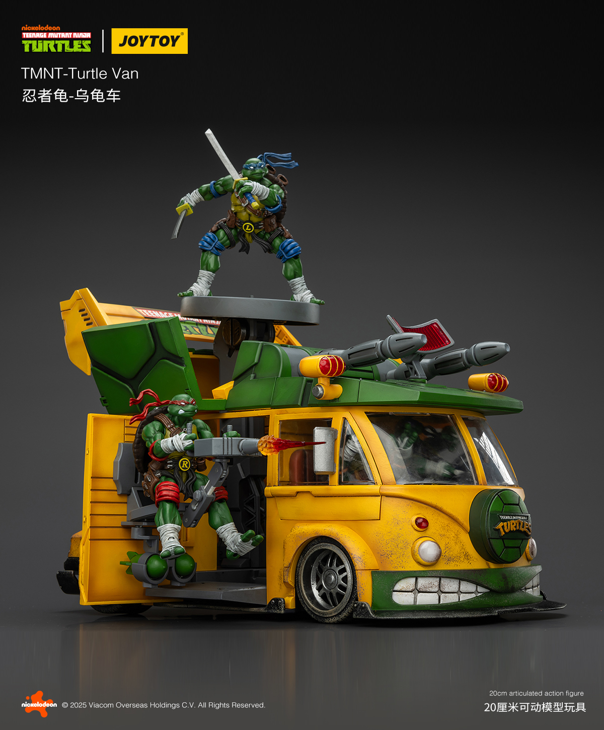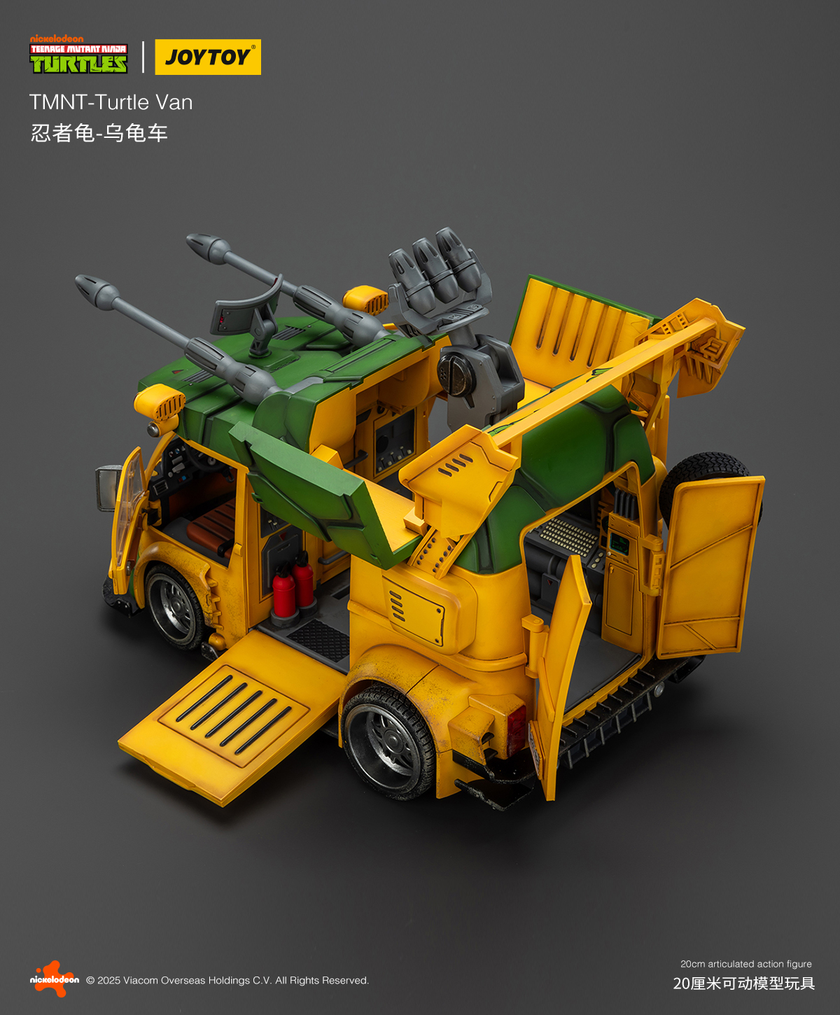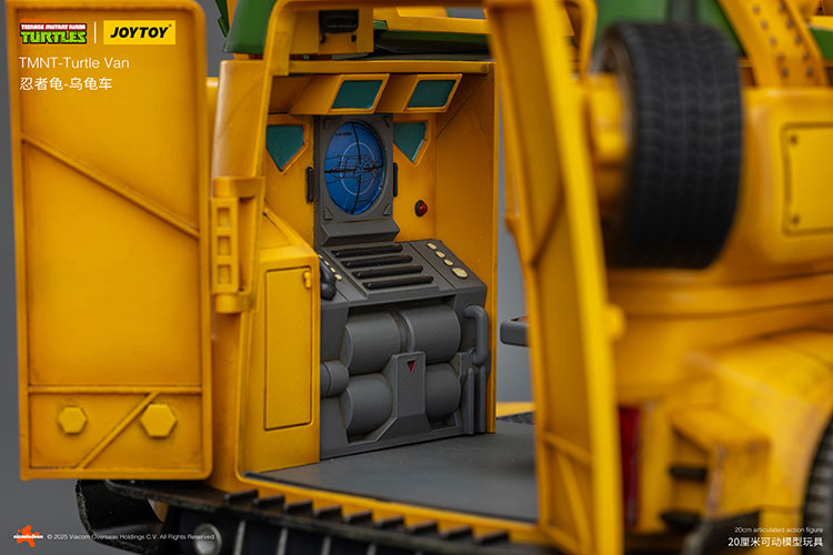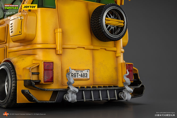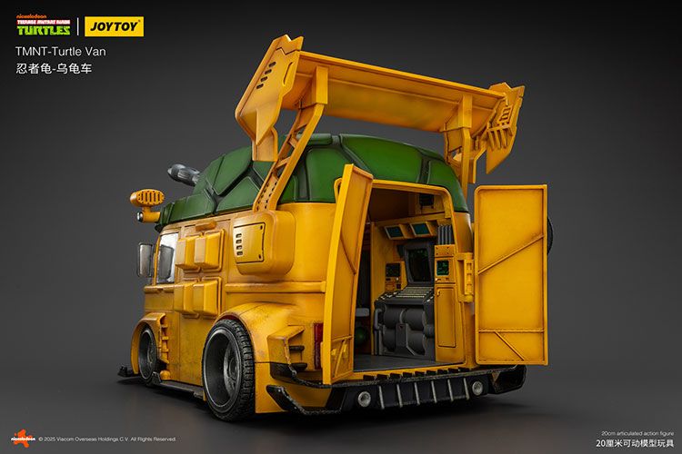 Pour la première fois, JoyToy proposera un véhicule pour ses Tortues Ninja, à savoir son adaptation du mythique Turtle Van ! Inspiré d’un combi Volkswagen totalement bricolé, le véhicule est ultra articulé et propose de très nombreuses fonctions. Le toit peut s’ouvrir, tout comme les portes latérales. Vous pouvez customiser l’avant comme l’arrière avec différentes possibilités, comme des missiles, de la fumée pour les pots d’échappement, retirer les roues de secours ou encore le logo carapace à l’avant. Les tortues tiennent tout à fait l’intérieur et de nombreux canons sont à répartir sur tout le véhicule. Une très belle pièce qui n’a rien à envier aux bolides de NECA et Super7, loin de là !