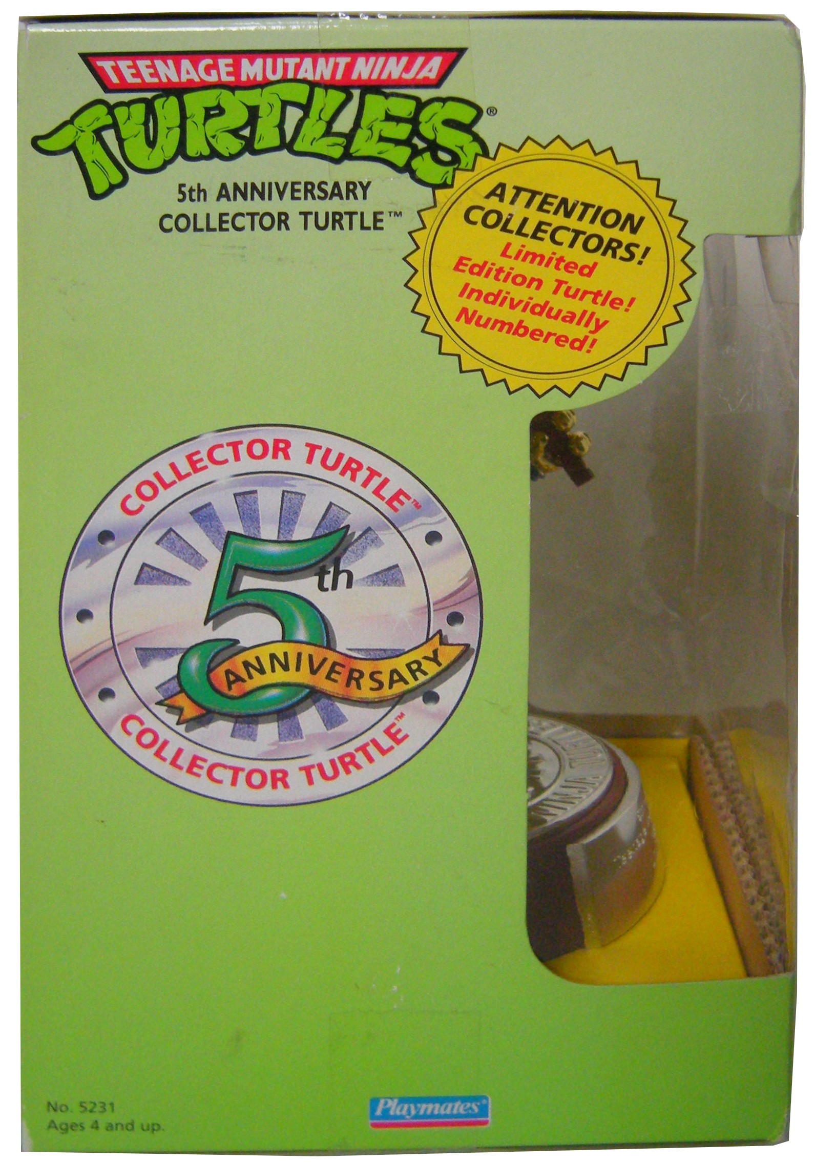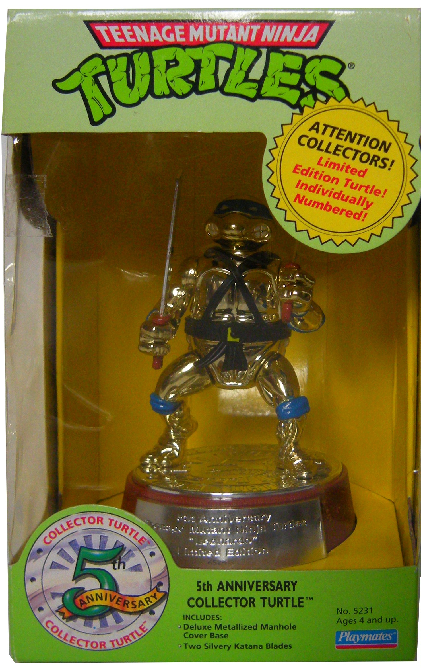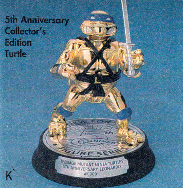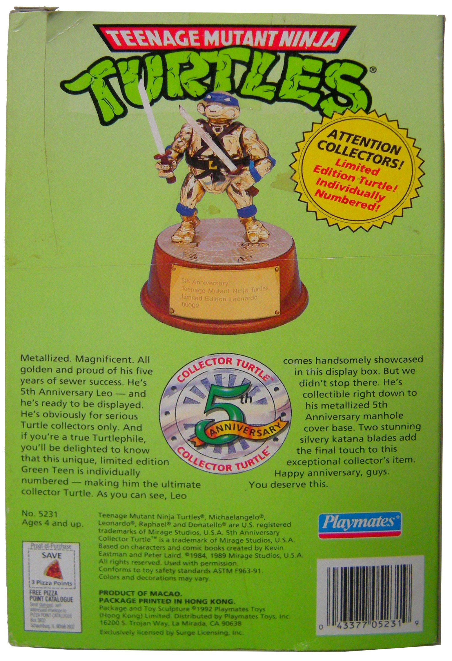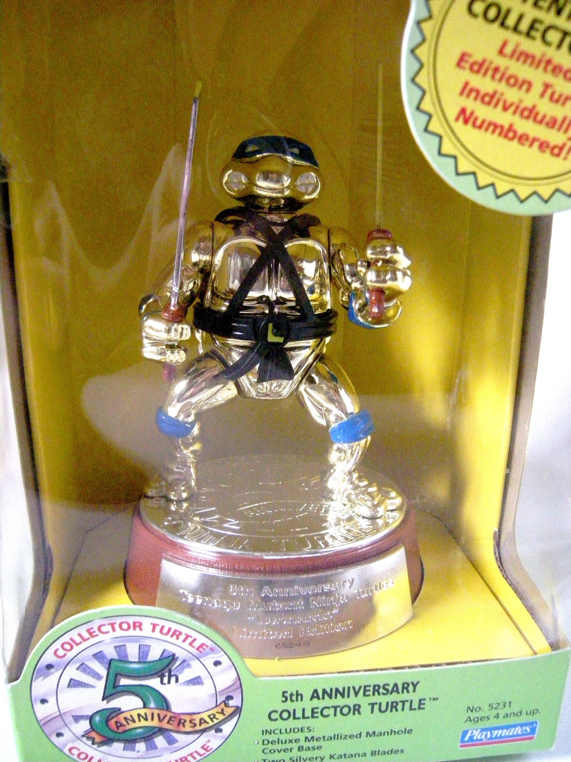 Cette figurine est un trophée articulé pour commémorer les cinq ans des Tortues Ninja chez Playmates Toys. Le personnage est issu du moule de Donatello, bien que le fabricant en ai fait un Leonardo. La figurine et son socle sont entièrement réalisés en plastique et présentés dans un boîte avec une vitre fine de plastique.