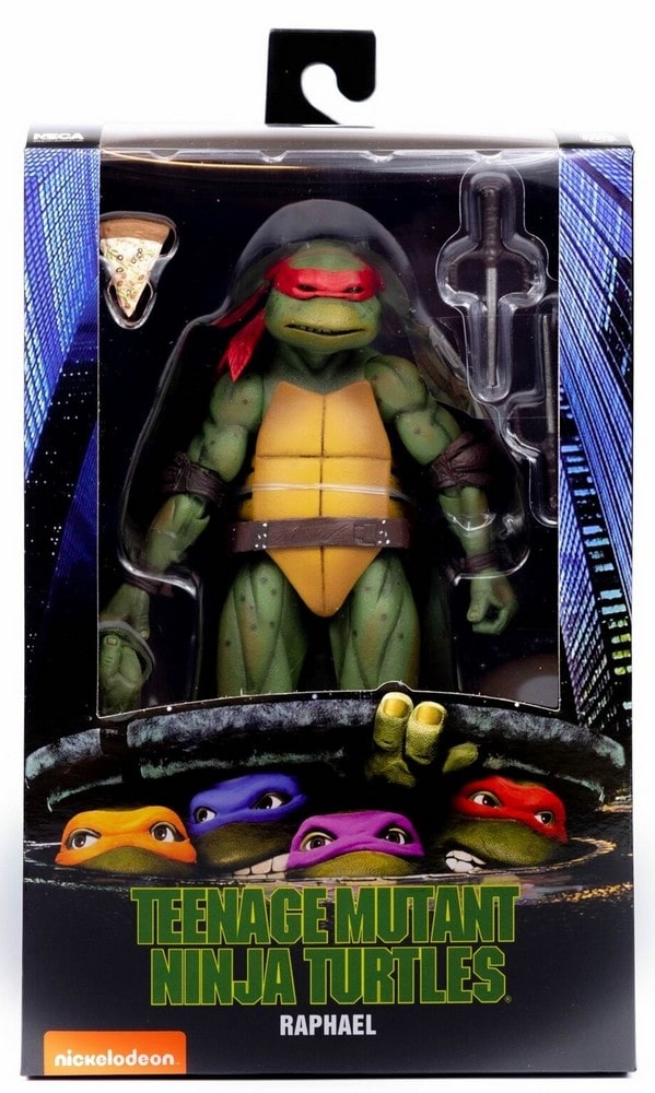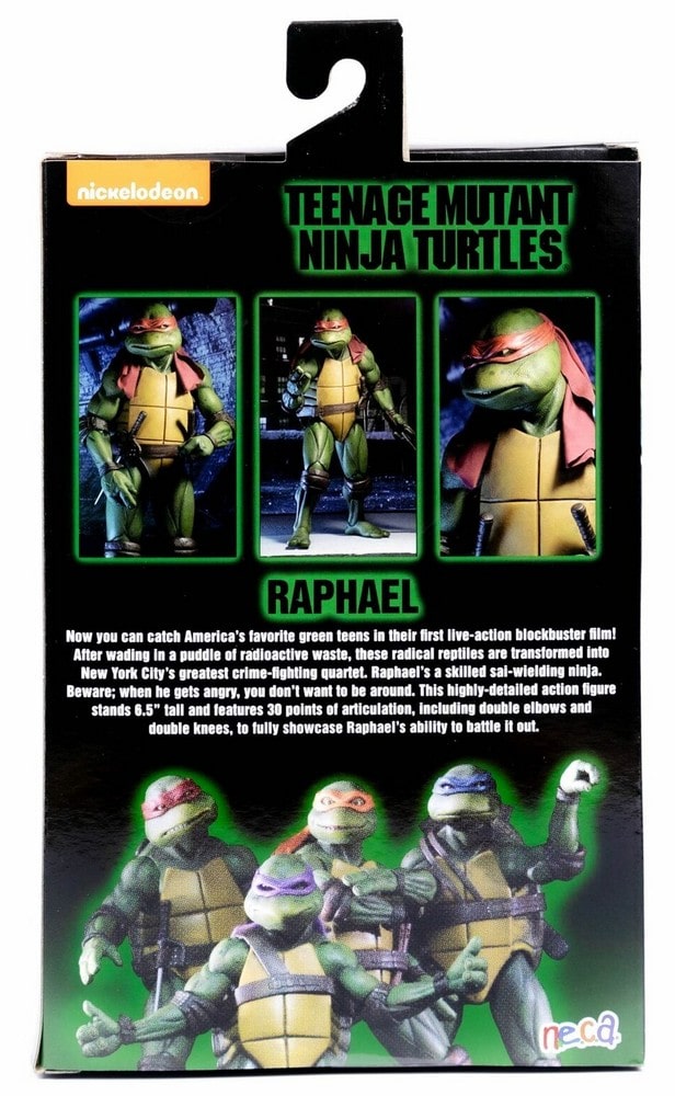 ne fois les droits de distribuer les figurines en magasins obtenus, NECA présenta ses tortues dans des blisters identiques à ceux des ¼ scale, à plus petite échelle bien évidemment. Les photographies, de Stephen Mazurek, sont identiques. Seule une languette a été ajoutée en partie supérieure pour accrocher la boîte en rayon.