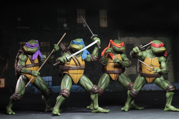 Mais avant d’annoncer l’excellente nouvelle, NECA réalisa un pack exclusif au Comic Con de San Diego 2018, limité à 5 000 exemplaires, reprenant les quatre tortues du film de Steve Barron en 7″, pour 100$. Celui-ci subit un véritable raz-de-marée. Le fabricant avait mis à disposition un nombre limité de packs sur internet pendant trois jours de suite. Chaque jour, le stock s’évapora en quelques secondes. De plus, un pack plus imposant, avec un diorama en forme de rue avec maisons de briques fut vendu avec ces quatre tortues, toujours en exclusivité, pour 250$.