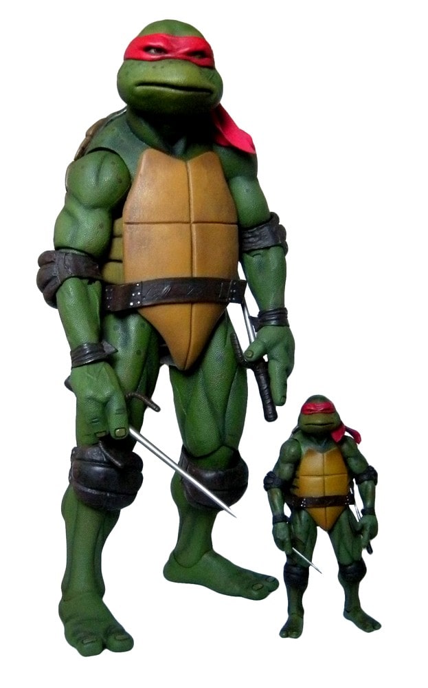 En 2015, NECA n’avait l’autorisation de produire des figurines de la licence TMNT au format 7″ qu’à l’occasion de salons du type du San Diego Comic Con, uniquement pour les États-Unis et en quantités limitées. Désirant les distribuer à grande échelle, ces figurines furent réalisées au format ¼ scale, soit environ 42 cm de haut.
