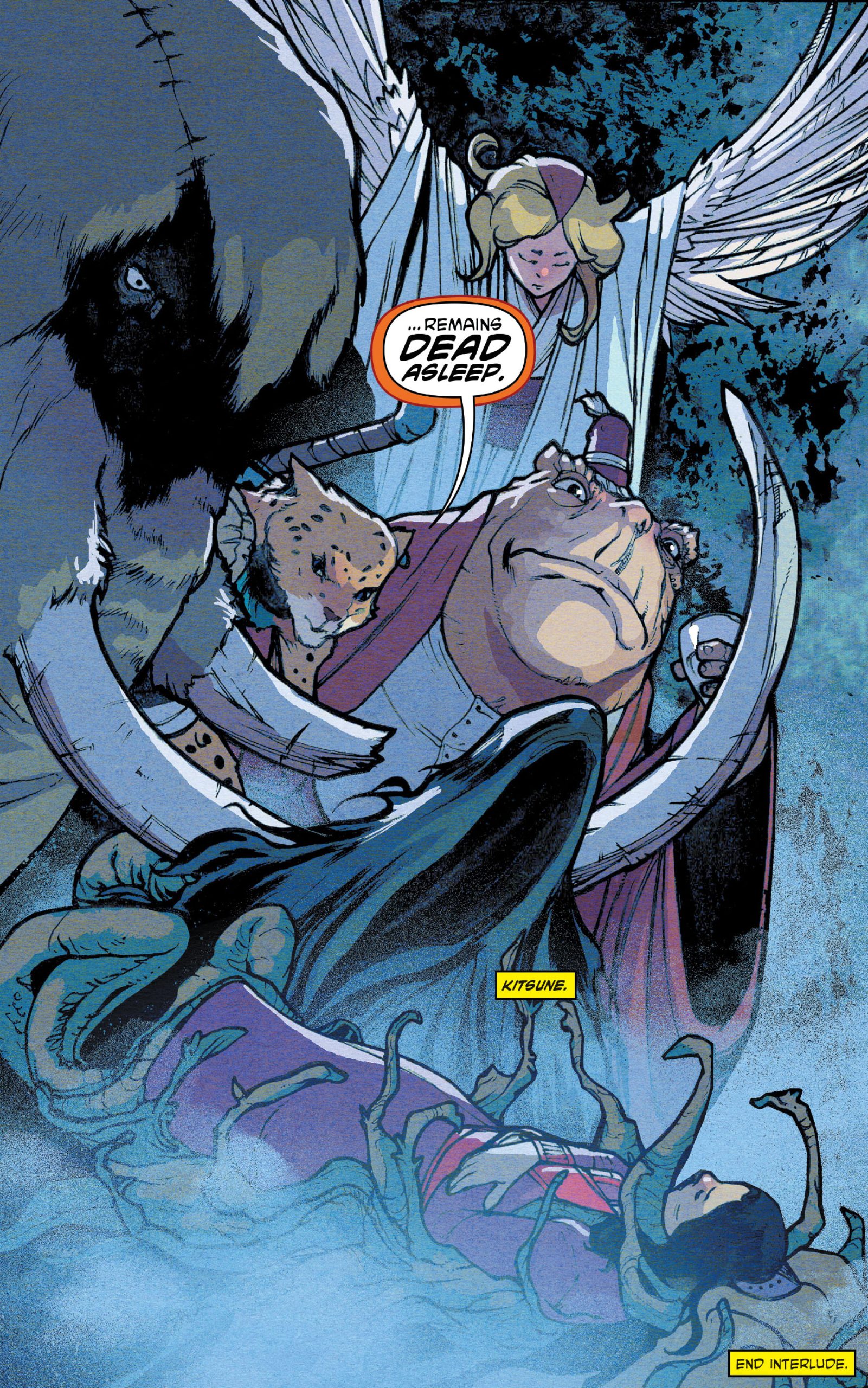 Les faits et gestes du Rat King l’inquiétaient au plus haut point. Si elle se trouvait à l’origine de l’équipe formée par Saki pour s’opposer à son frère, la semi-divinité savait pertinemment que ses desseins ne seraient pas déjoués si facilement. Elle réunit sa famille autour du corps inerte de Kitsune pour les convaincre d’agir. Aucun membre du Pantheon ne devait influer sur la destruction de la vie sur Terre (The Armageddon Game #4). Finalement, face à la fourberie du roi des rats, ses frères et sœurs décidèrent de s’interposer. Luttant contre la créature vile, Jagwar, Manmoth et Gothano périrent. Kitsune, dans un ultime espoir, s’empara de la Turnstone de Cherubae et l’utilisa pour invoquer leur frère disparu Chi-You. Celui-ci, libéré de sa prison de proton (TMNT / Ghostbusters #4), fit exploser le lieu, emportant tous les membres du Pantheon (The Armageddon Game #8).