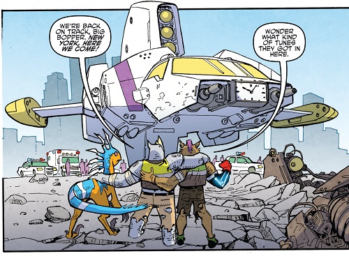 Anchovy partit avec les quatre mutants et le bébé protocératops pour Rio de Janeiro, suivant Renet, puis dans diverses périodes chronologiques. Le raptor s’était alors égaré. Il fut recueilli par Bebop et Rocksteady, qui prenaient la route en direction de New York (Bebop & Rocksteady destroy everything, part. 5).