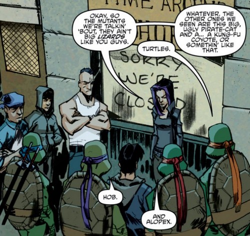 Après un bref retour à New York, Alopex partit avec Angel pour Northampton afin de se ressourcer loin des combats de leurs amis. Le séjour ne serait finalement pas de tout repos. Elles s’aventurèrent au milieu d’un marécage à l’aide d’une barque. Mais une grenouille géante les avala. Elles finirent dans un univers très étrange, où d’autres batraciens servaient le Toad Baron, un crapaud à la tête d’un incroyable palais des plaisirs. Préparant une réception pour sa famille, le mystique Pantheon, il veillait aussi à ce que tous ses invités s’amusaient dans ses appartements. Les deux amies n’eurent guère le choix et se repurent de quelques délicieux mets qui leur firent perdre la tête. Dansant sans s’arrêter, c’est Angel qui reprit ses esprits la première. Les deux amies devaient sortir de là même si le crapaud maître des lieux s’y opposait (TMNT Universe #9).